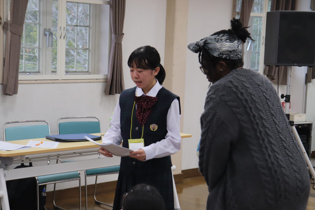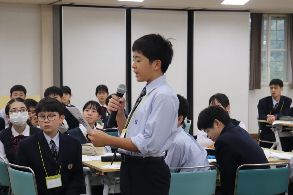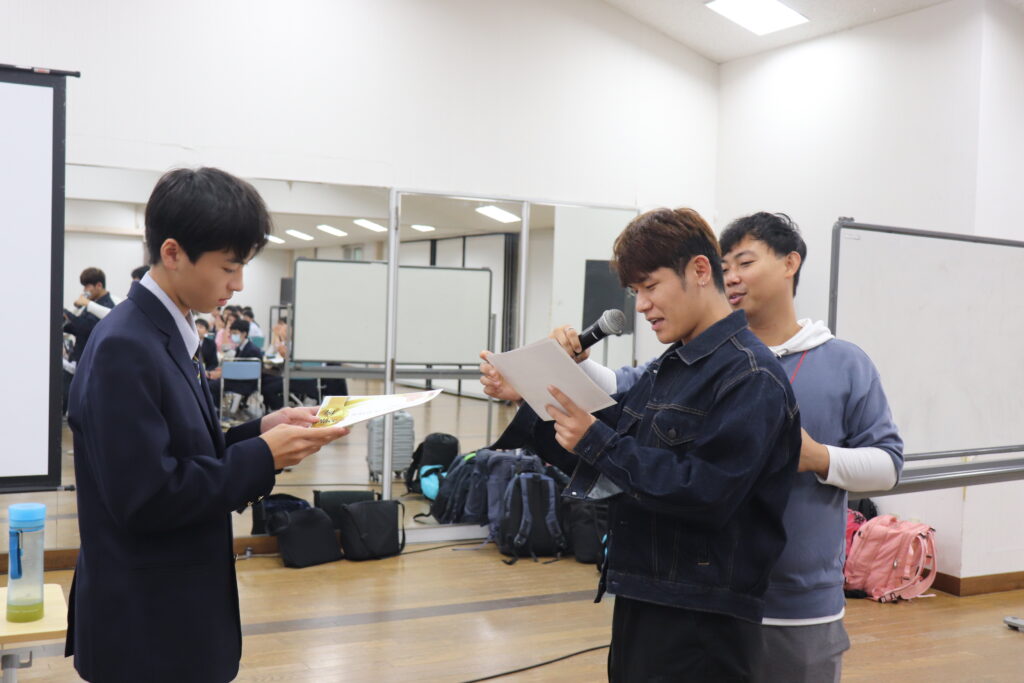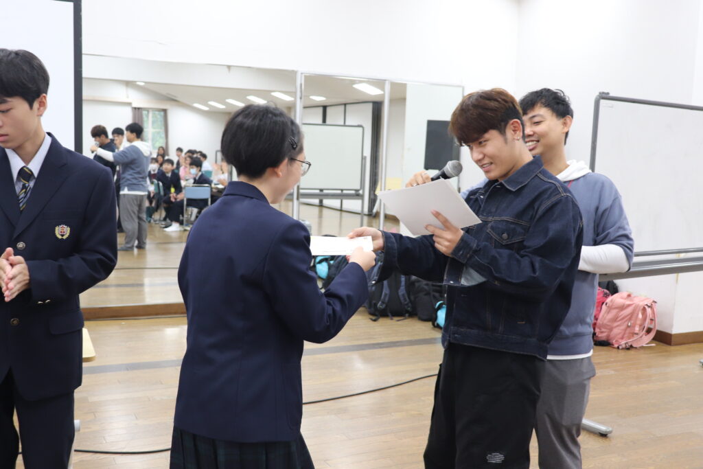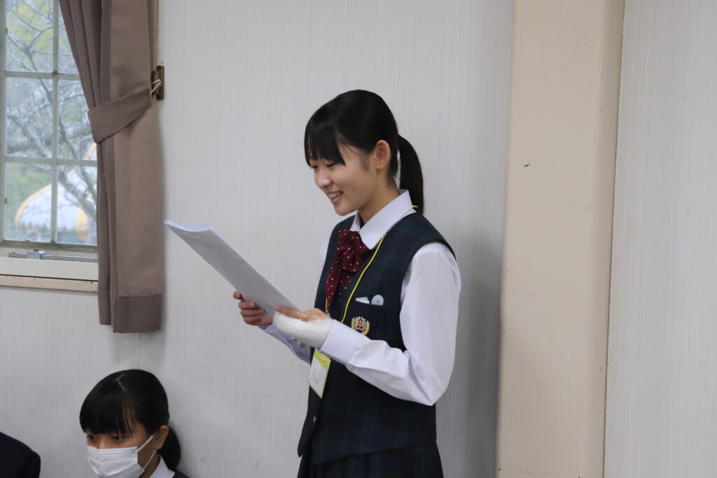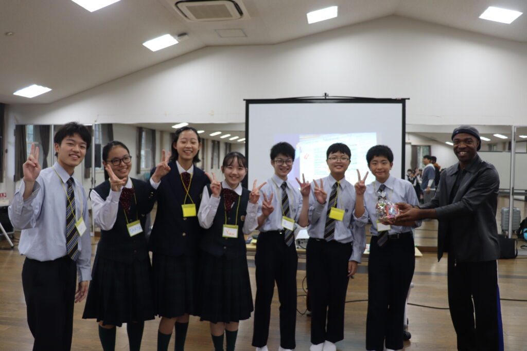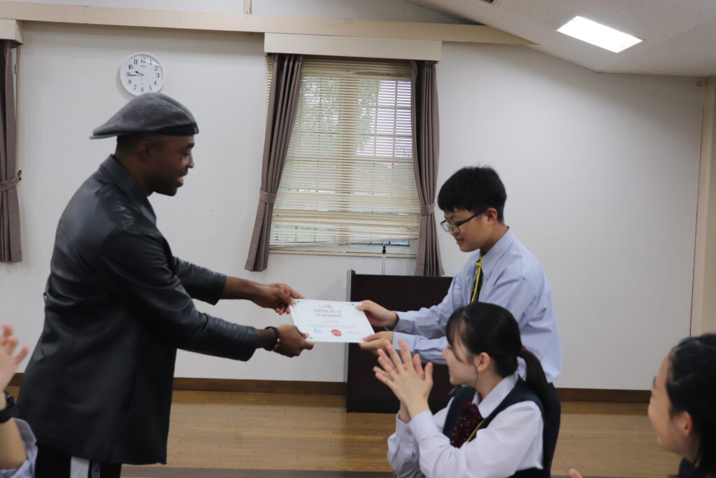 この2日間で感じたことをぜひ今後の学校生活に生かしてほしいと思います。発表後は今回のプログラムの振り返りをして、リーダーから一人一人終了証書をもらいました!J2生を代表して窪田悠人さん(宮崎南小出身)がお礼の言葉を述べました。グローバルリーダーからは今回のプログラムログで学んだことを忘れないでほしい。とメッセージをもらいました!