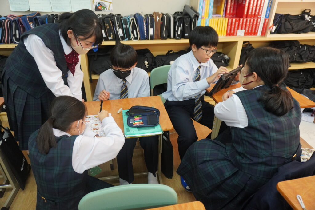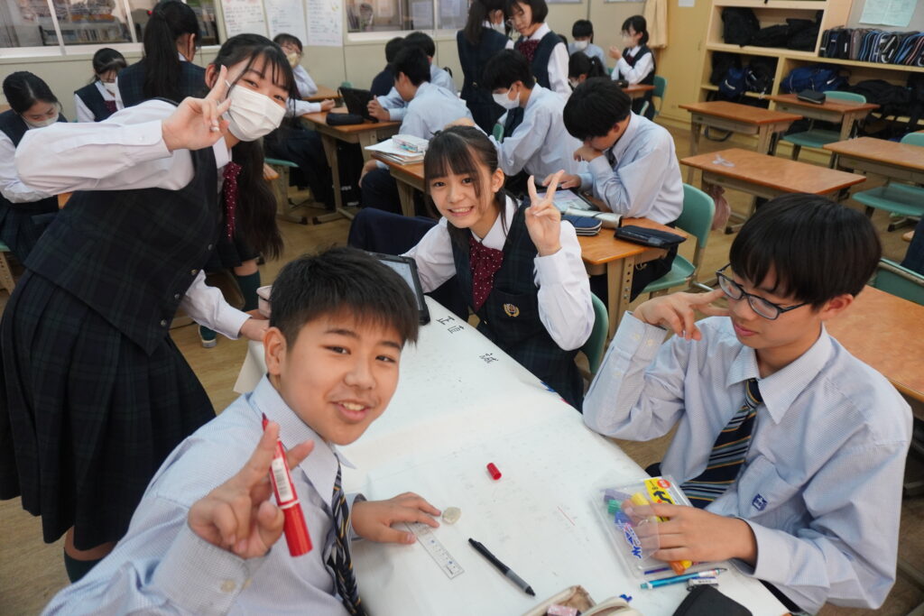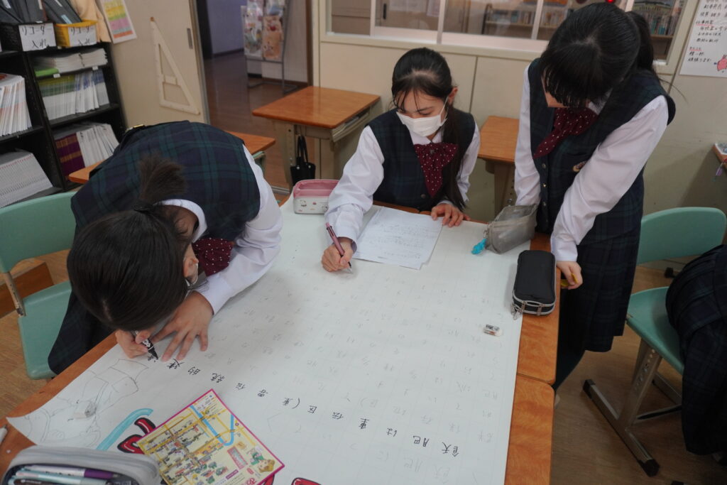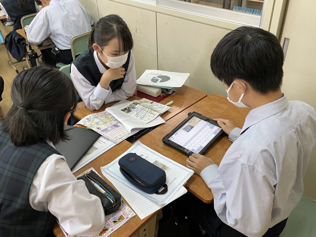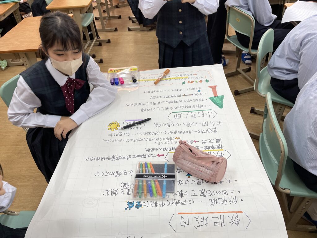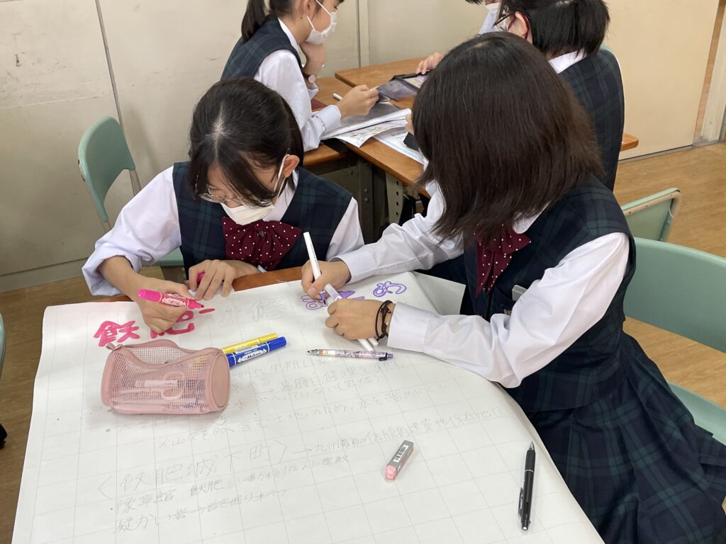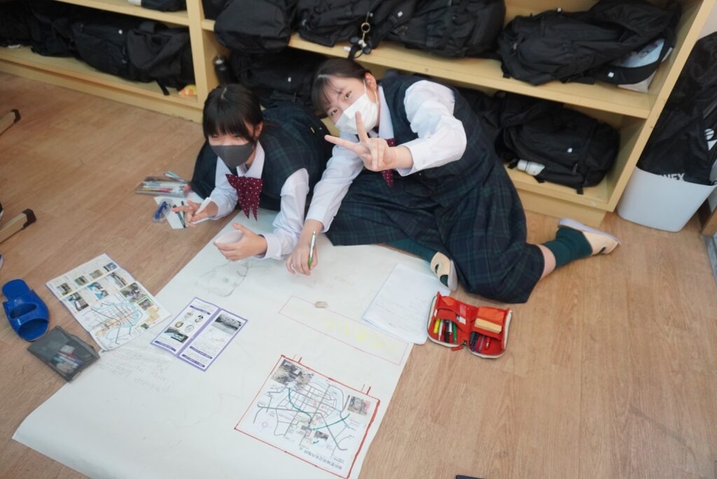 研修が終わった後は、各クラス事後学習として、各グループに分かれてスライドや模造紙に、今回の校外学習にて学んだことをまとめています。