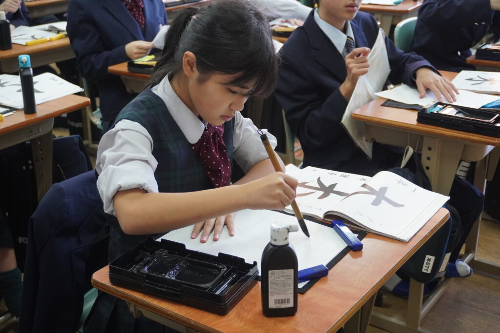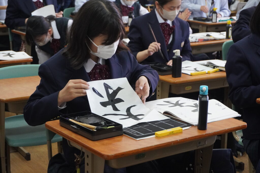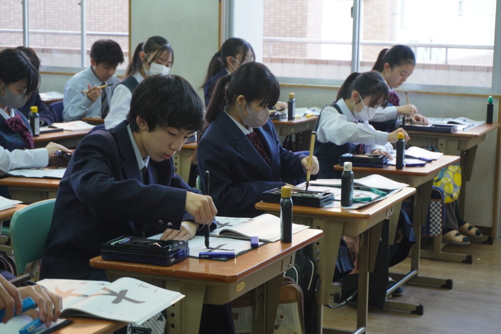 書道の時間では、心を落ち着かせて筆を走らせています。きれいな字を書くためには、基本を大切にしなければいけません。1字1字丁寧に書いていきましょう!