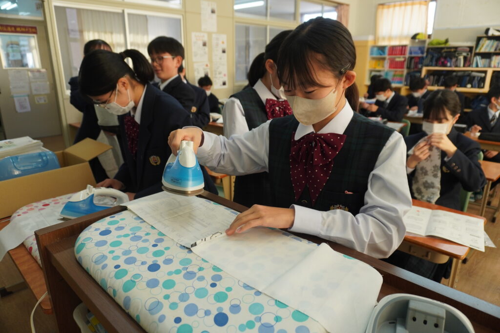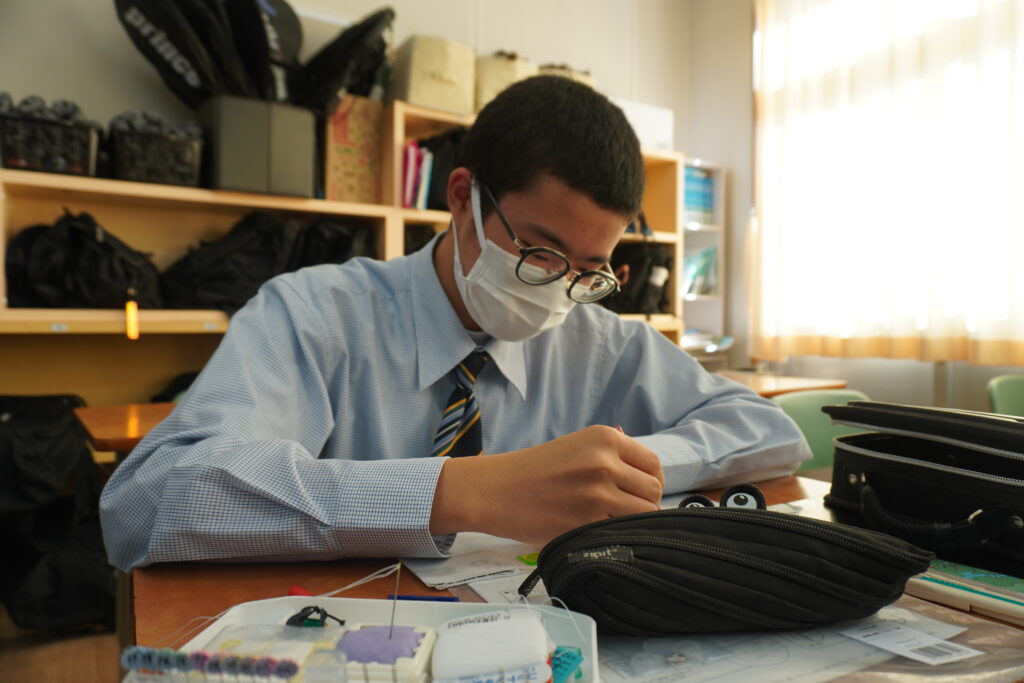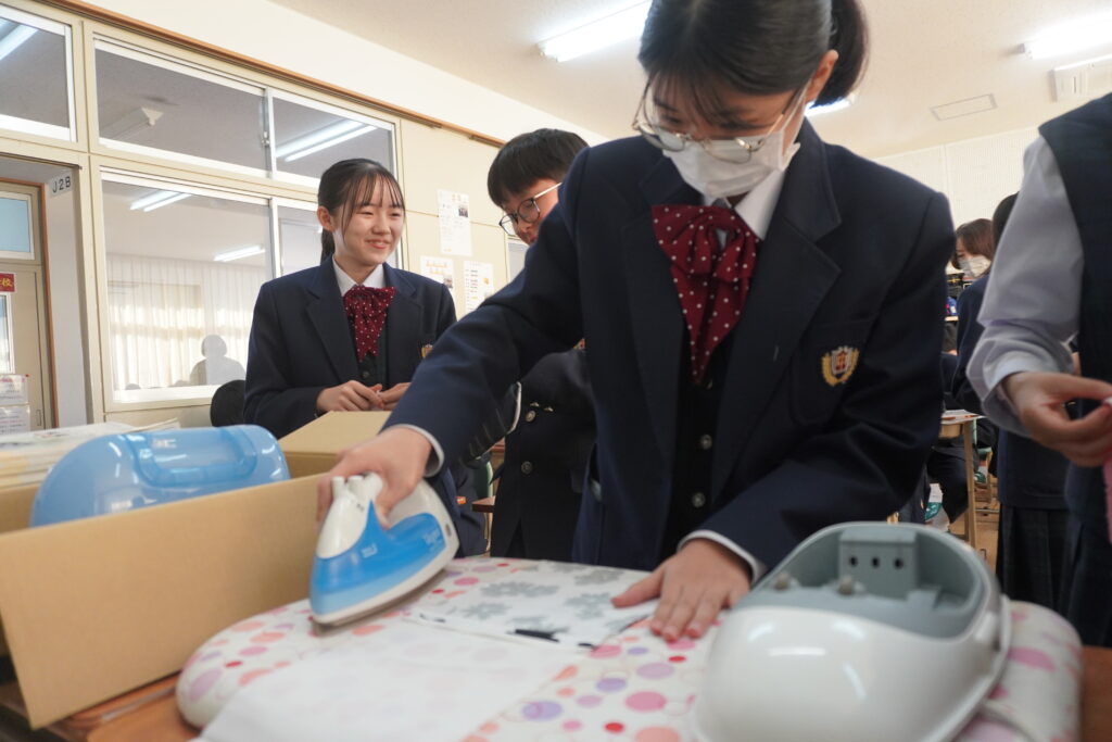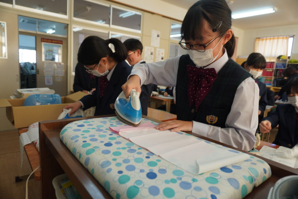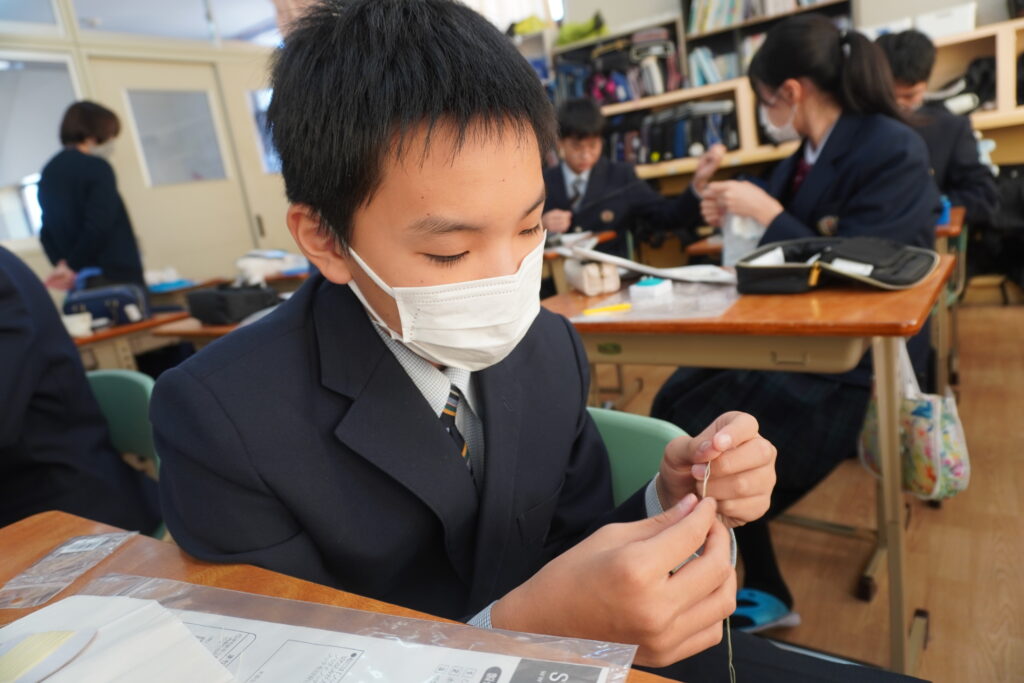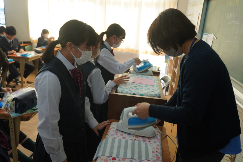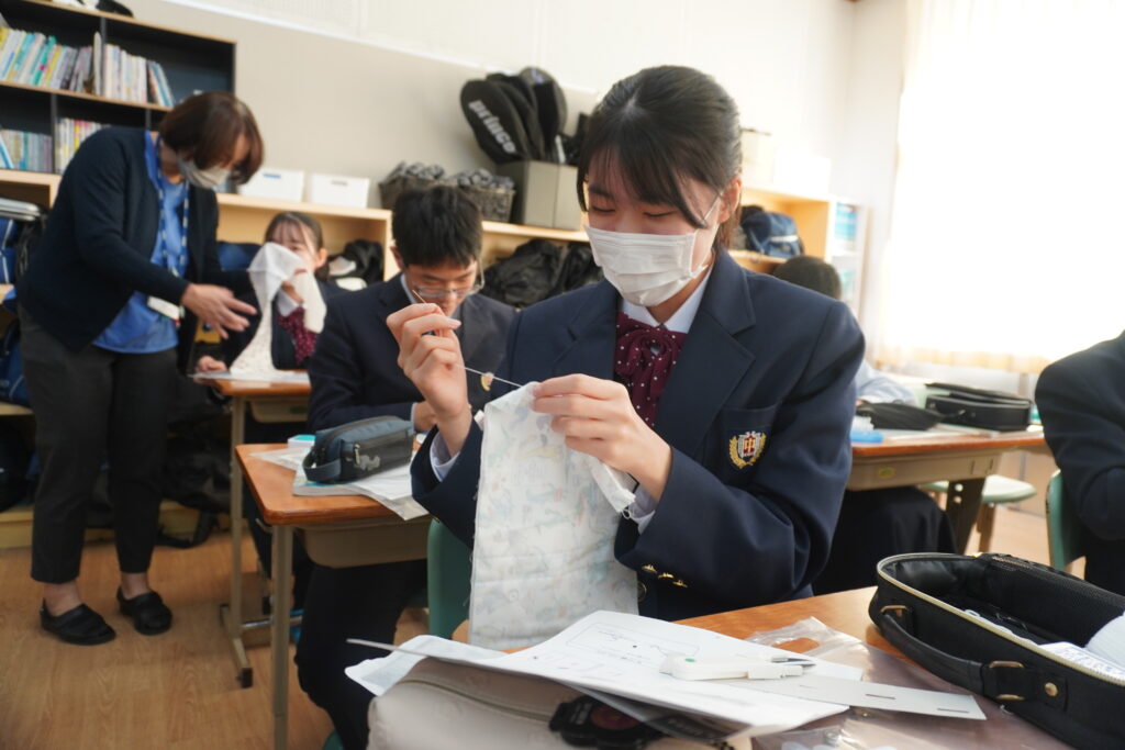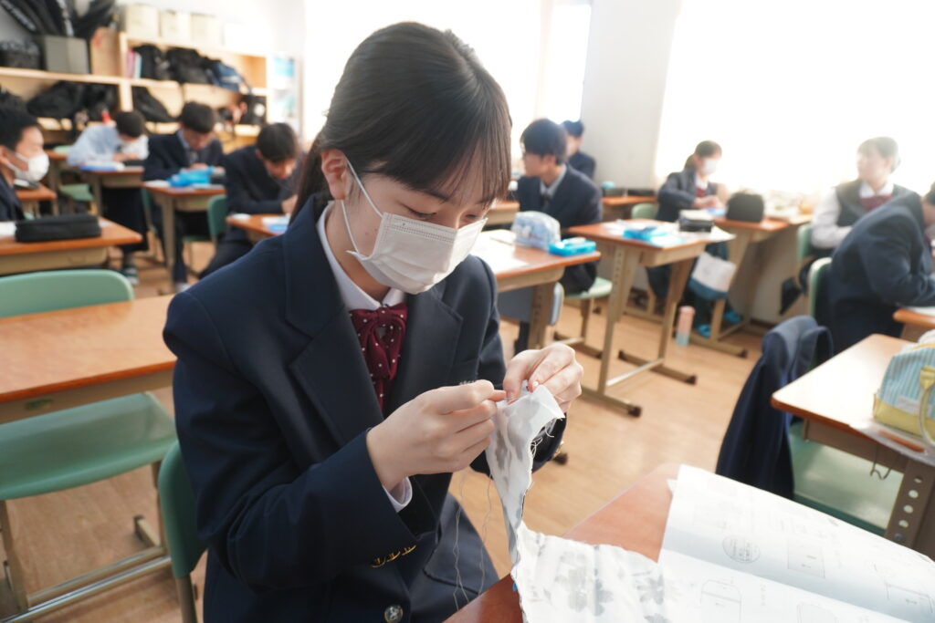 本日、J2-Bの家庭科の授業で、基礎縫いの練習としてブックカバーを作成していました。