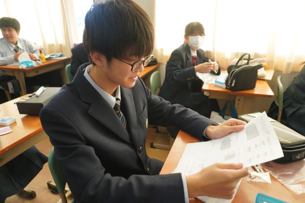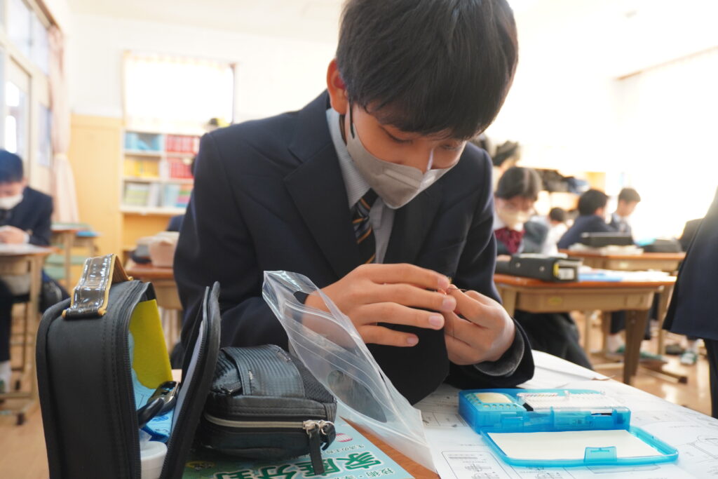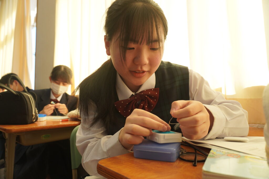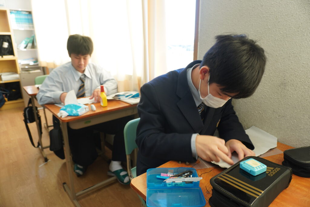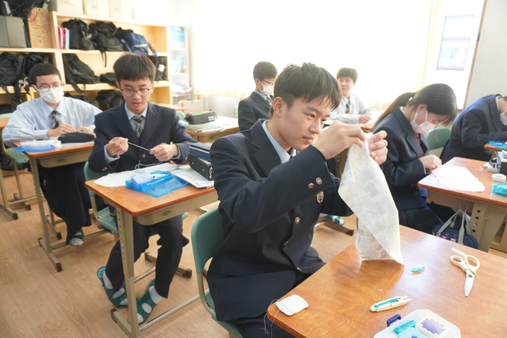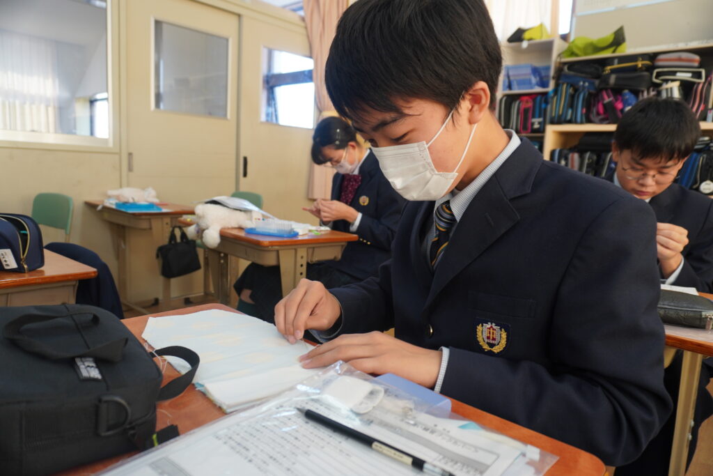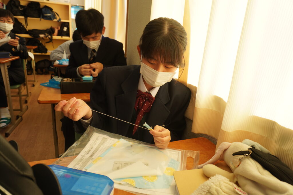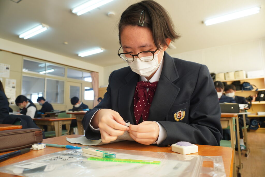 本日、J2-Bの家庭科の授業で、基礎縫いの練習としてブックカバーを作成していました。