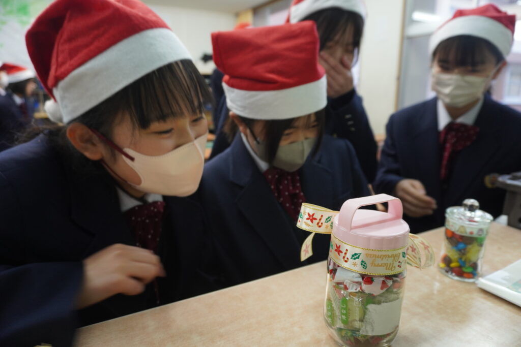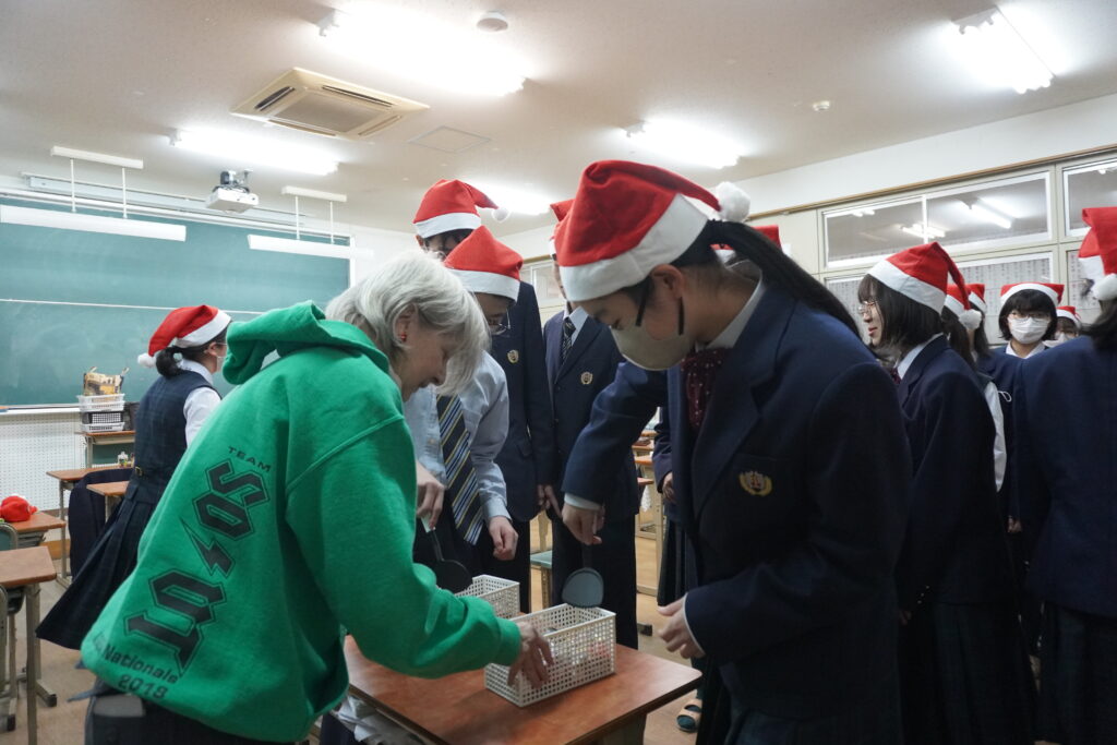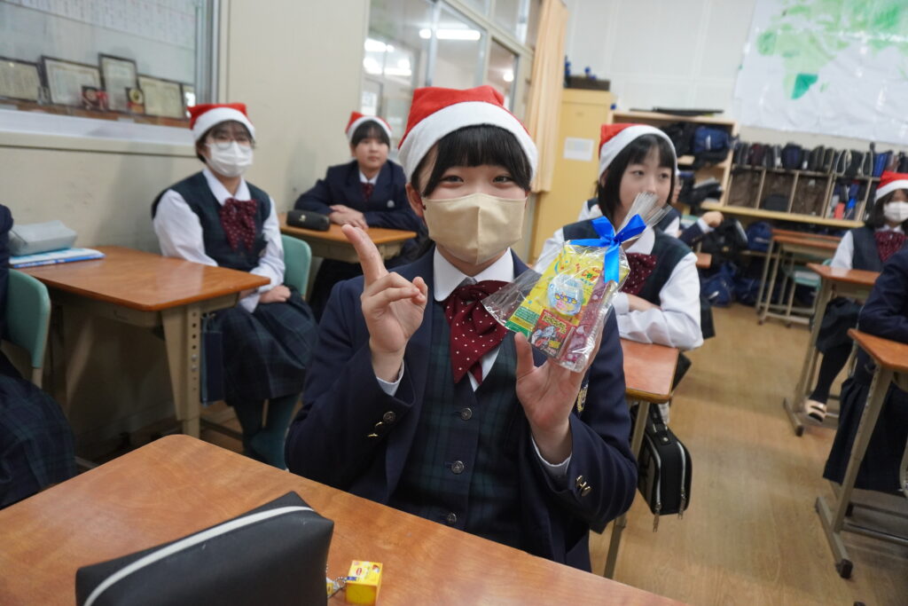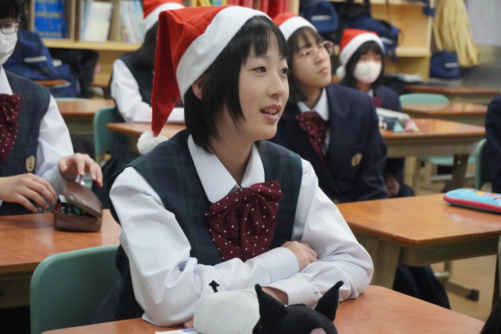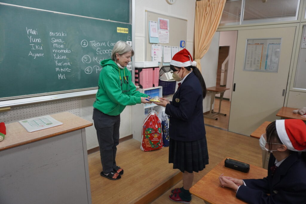 次はChristmas riddle「クリスマスなぞなぞ」を行いました。見事1番に正解した生徒にはプレゼントが!ゲットした生徒はとても嬉しそうでした!