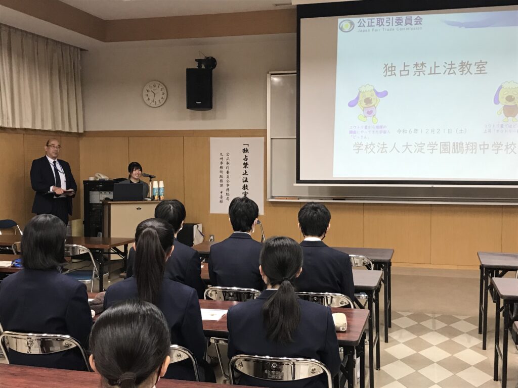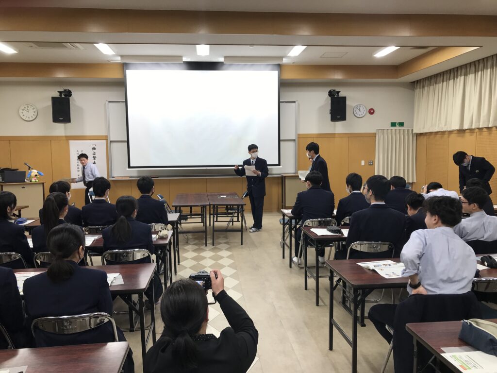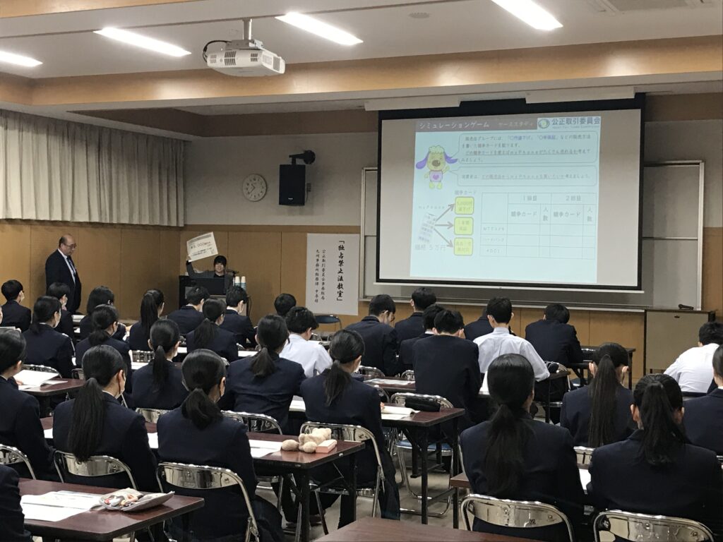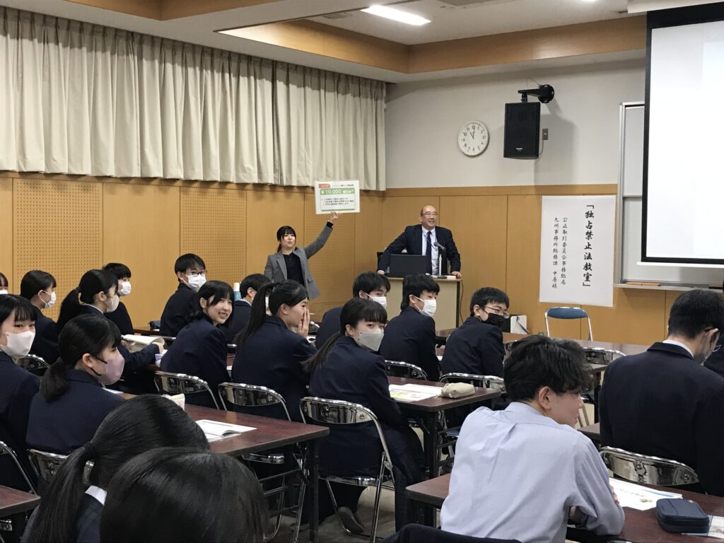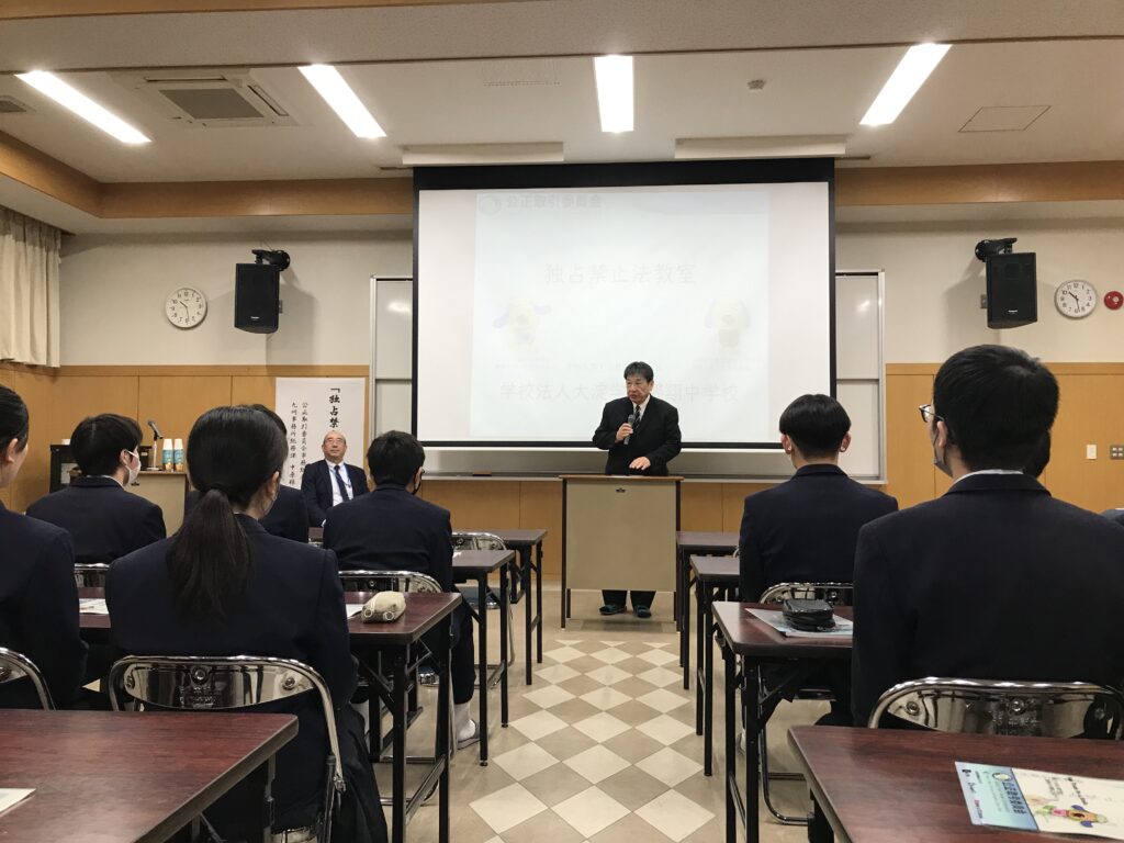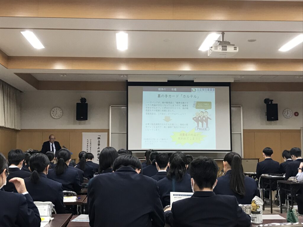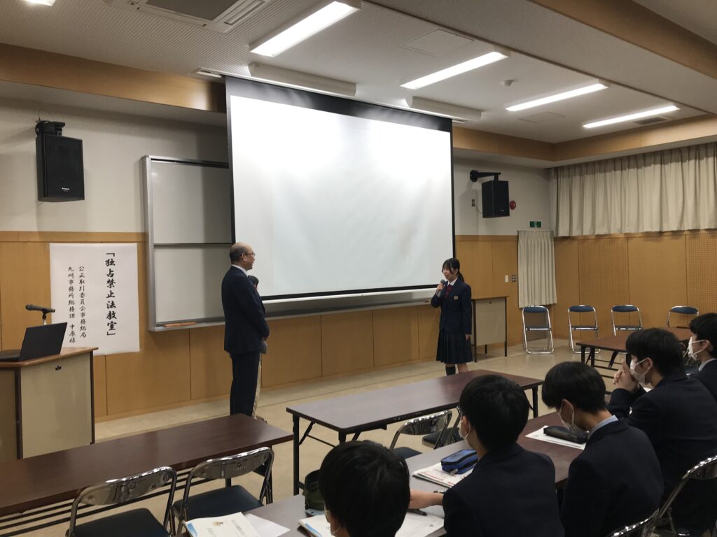 本日は、公正取引委員会の九州事務所から総務課 課長の伊藤 雅弘様と内閣府事務官の三好 唯希様をお招きし、J3生を対象に、「独占禁止法教室」を行いました。