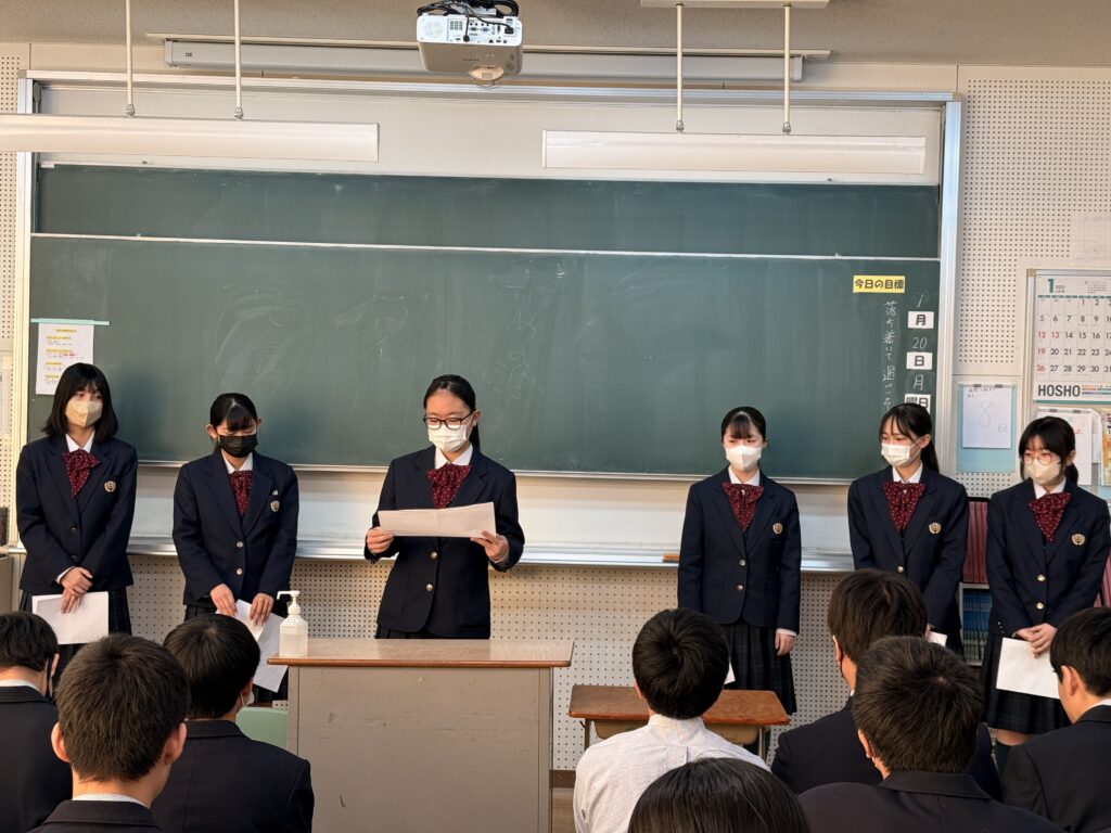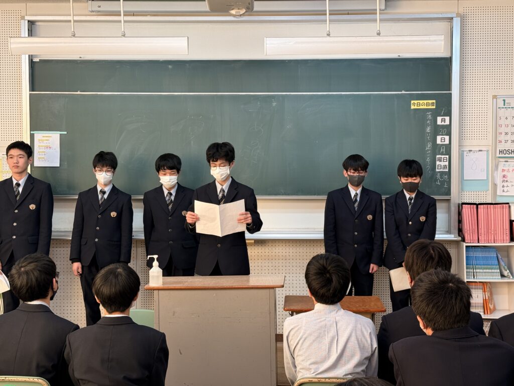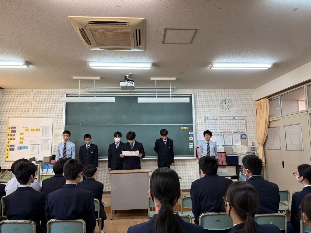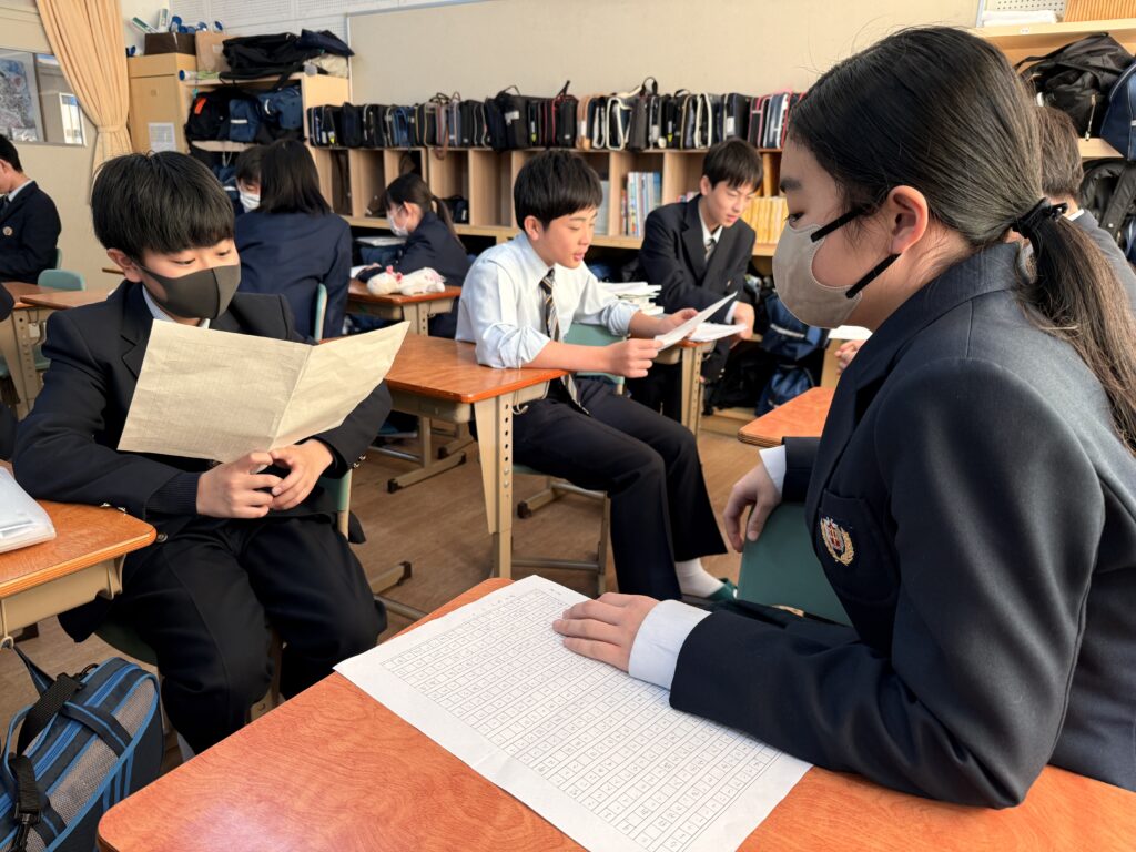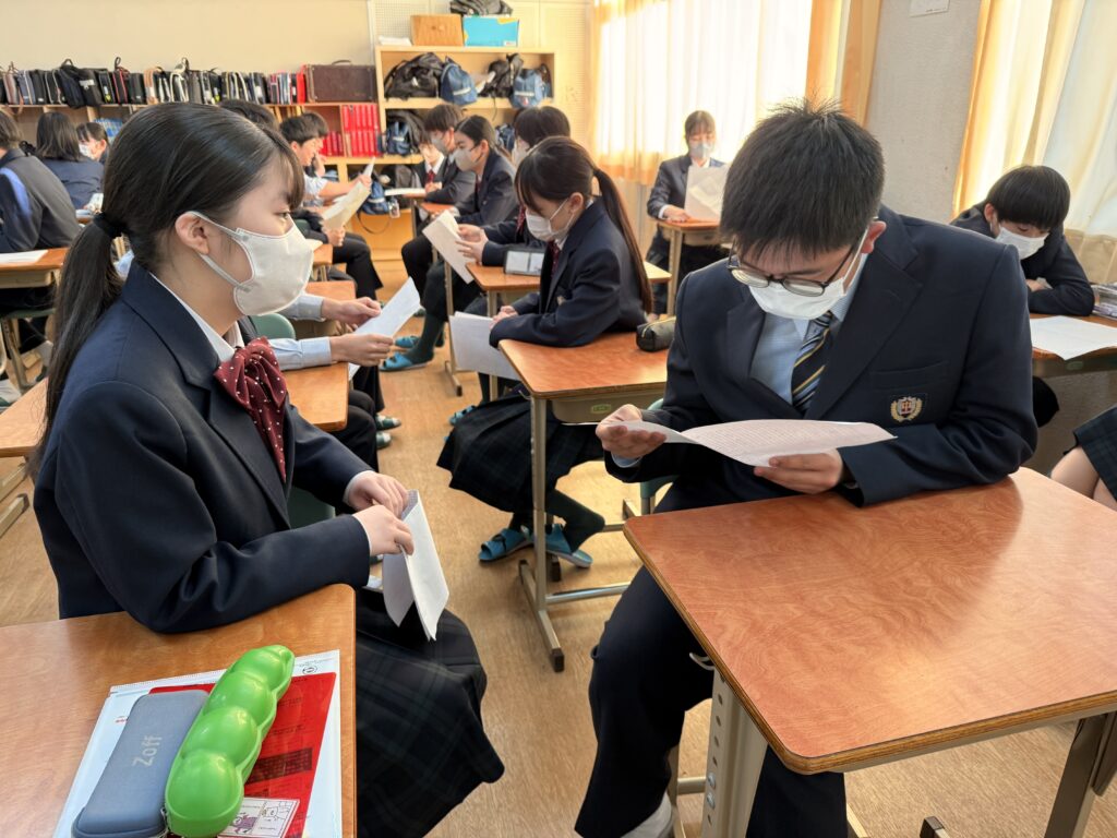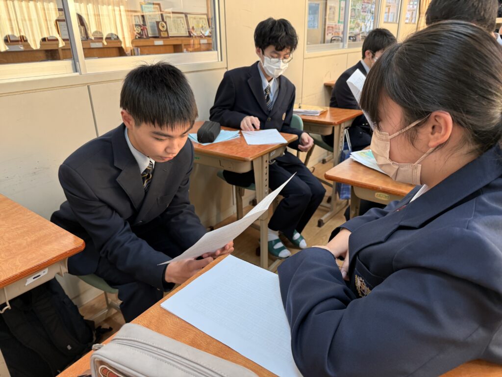 J2生は来月5日(水)に実施される立志式に向けて準備を行なっています。J2Aの教室ではお互いに、作文を読みアドバイスを出し合っていました。