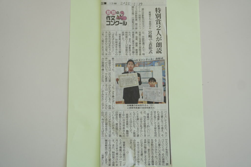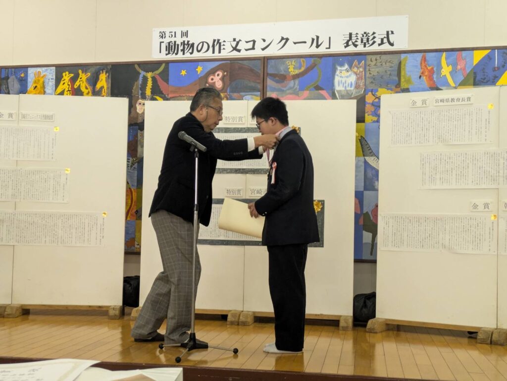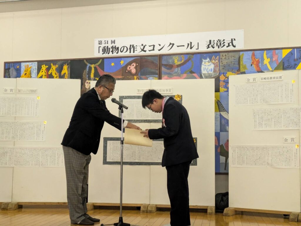 その表彰式にJ2Aの吉田琉星さん(瓜生野小出身)が参加しました。吉田さんは第51回動物の作文コンクールにおいて宮崎市長賞を受賞しました。