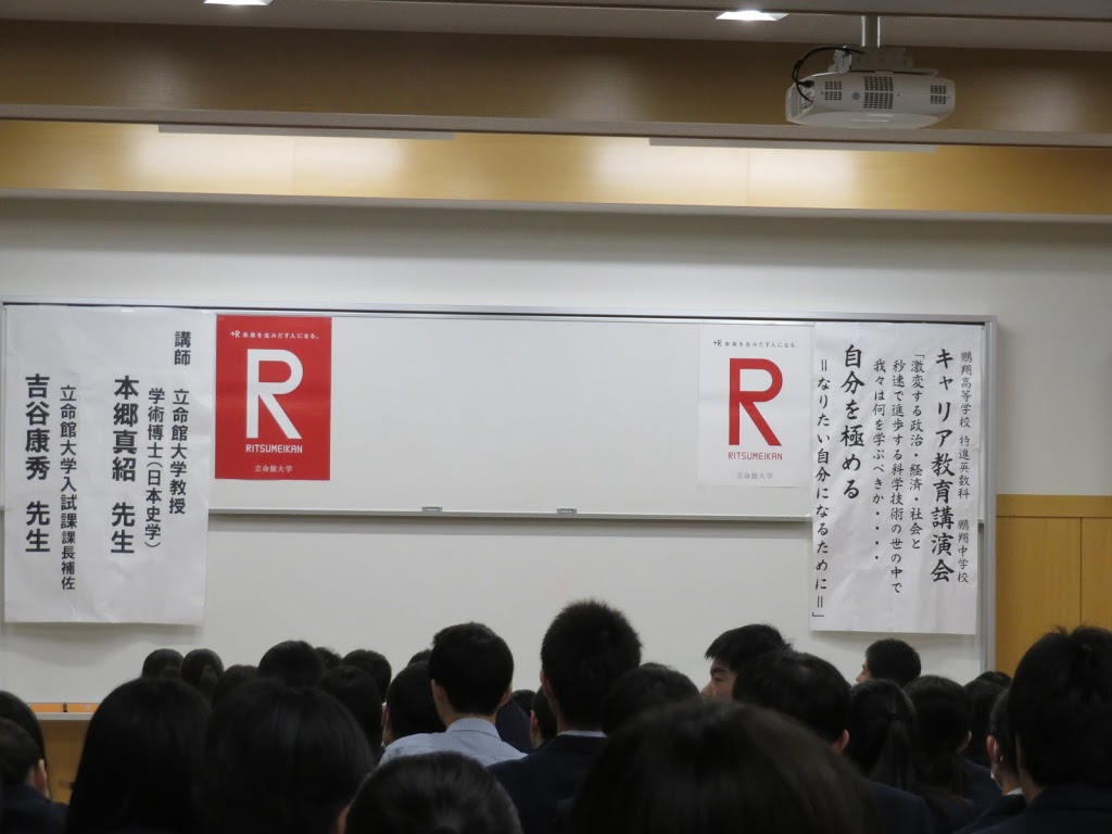 冬期課外(3日目) 本日も、冬期課外が行われ、国語・数学・英語と習熟度別で授業が行われました。 午後からJ3は、立命館大学教授の本郷真紹先生による特別講演会に参加しました。 講師紹介吉田成哉先生(教頭) 立命館大学・文学博士(日本史学)本郷真紹 先生 時にユーモアを交えて話をされる、本郷先生の話に聞き入っていました。今回、大学の教授から話を聞くことができるということで、生徒にとって充実した時間を過ごす事が出来ました。本日は、講演ありがとうございました。