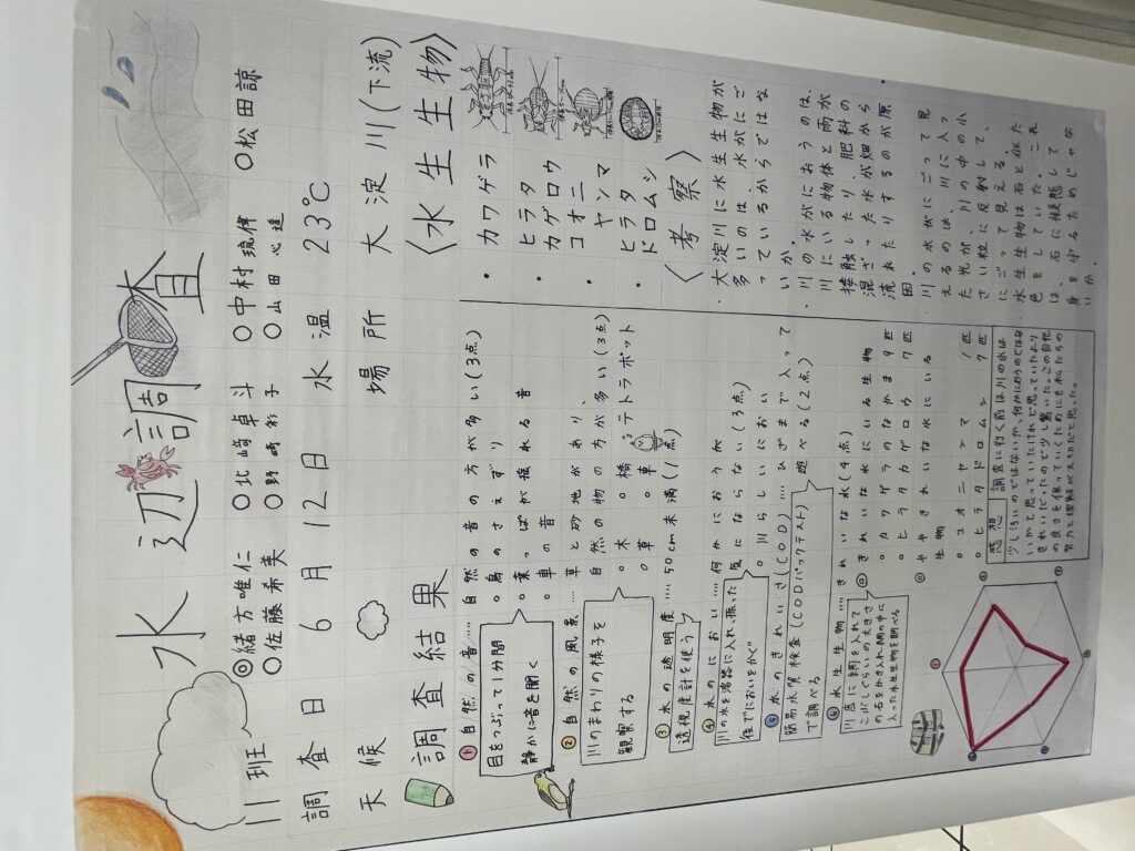 本校では、毎年6月頃に水辺の環境などについて調べるため、J2生が大淀川の水辺調査を実施しています。今年度は、6月12日(水)に実施をしており、今回の調査結果の報告は、今年度の文化発表会にて展示・発表されました。