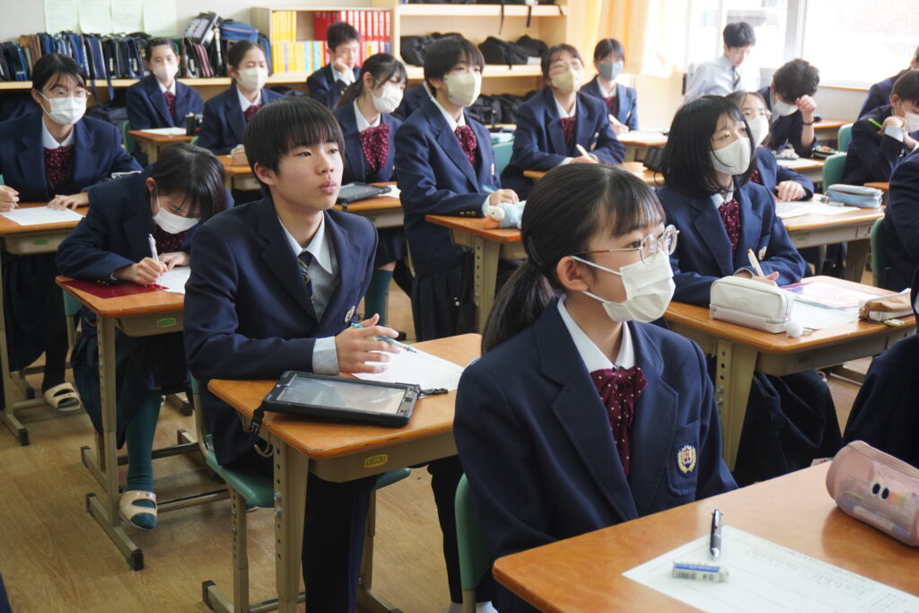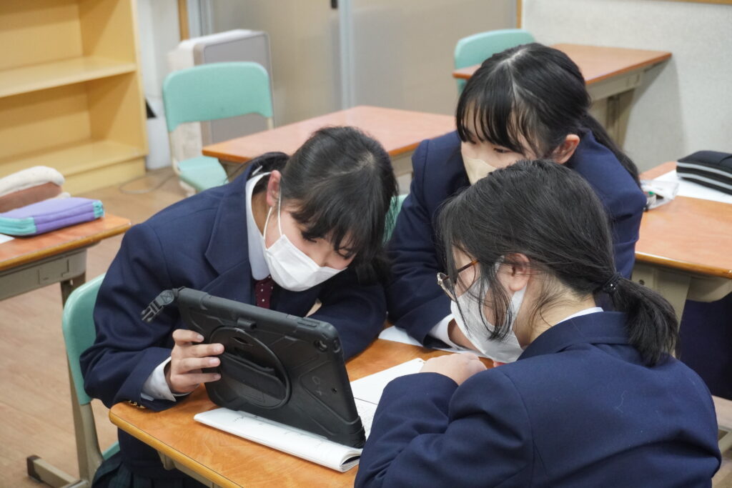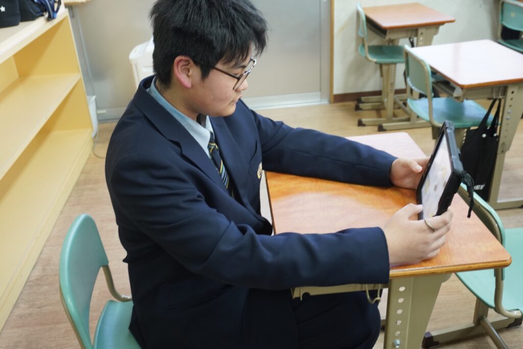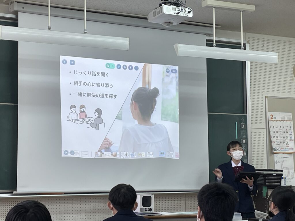 総合の時間などにて、さまざまな職業について「知る・学ぶ・伝える」をテーマに、タブレットを活用した学習を行いました。多くの職業があることを知り、自分の興味のある職業について調べて学び、調べた内容をスライドにて作成し、発表して伝える。初めて知った職業も多くあり、生徒たちは興味関心をもって探究活動に取り組んでいました。