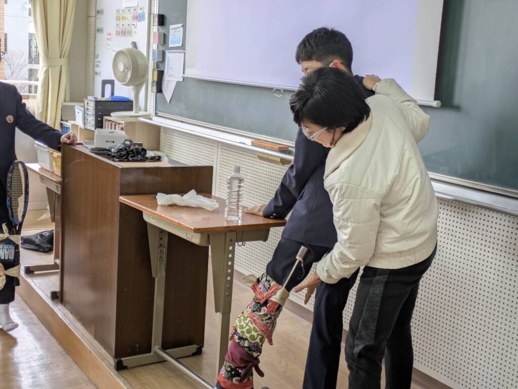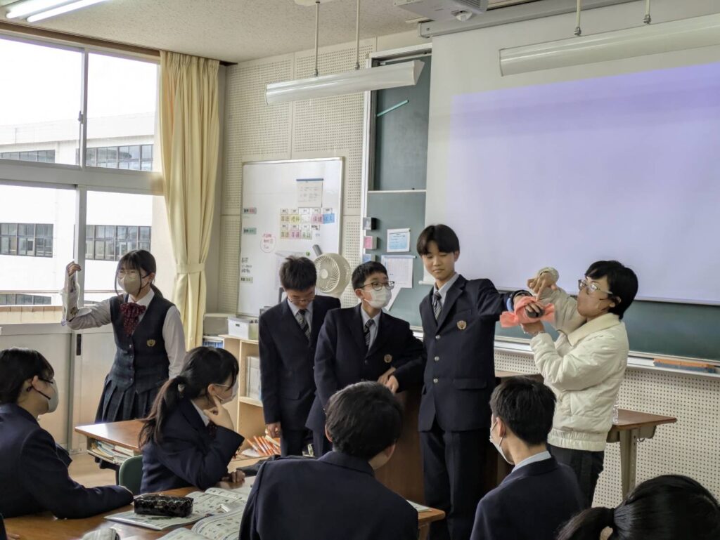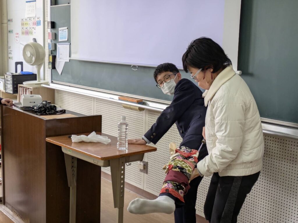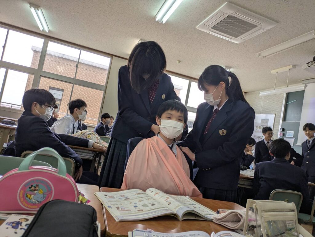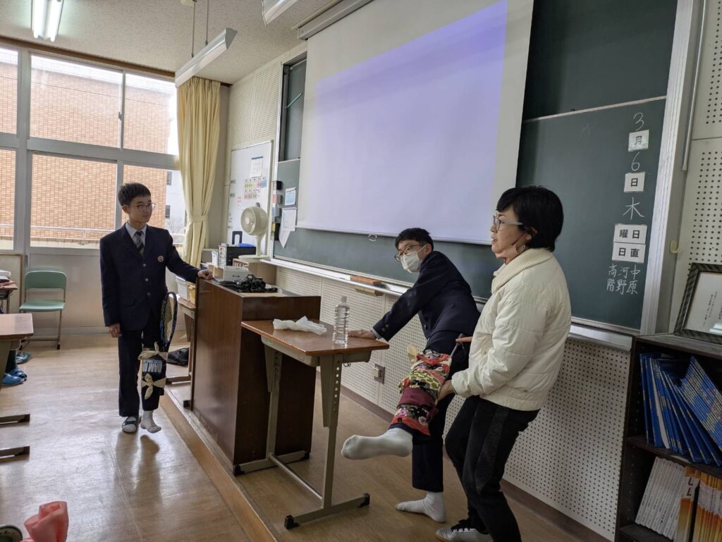 J2Bの保健の時間、災害時や緊急時に、教室にあるものを使って応急手当てができるのか、何をどう使えば手当てをすることができるのか、みんなで考えてみました。