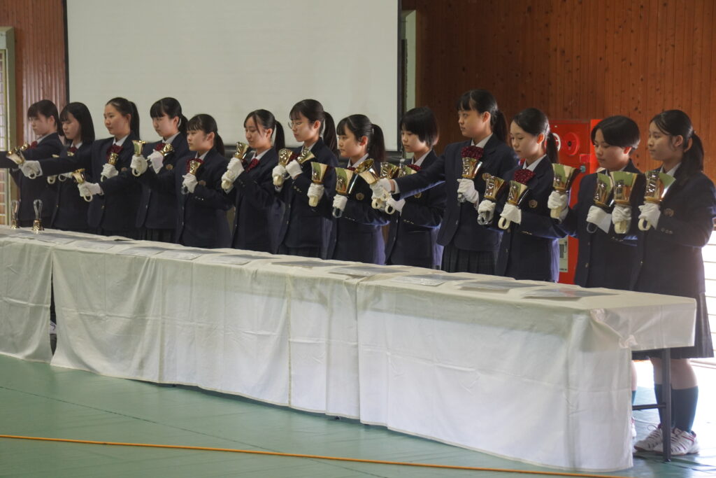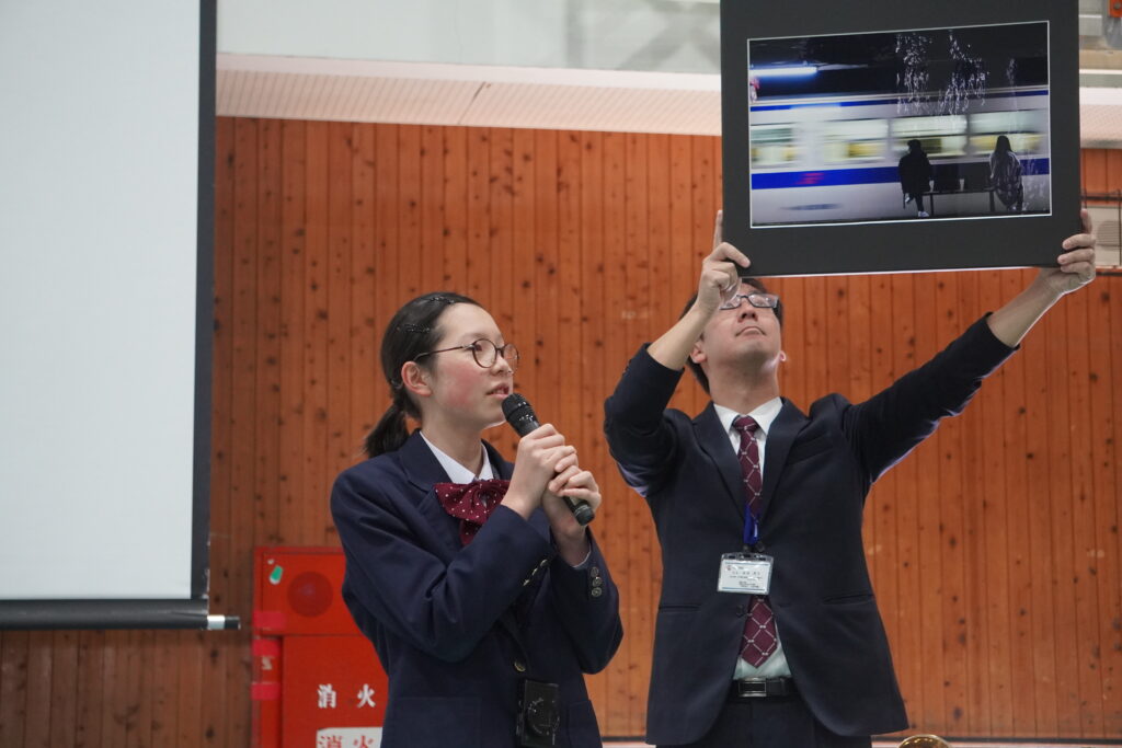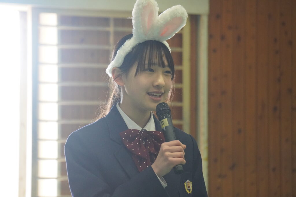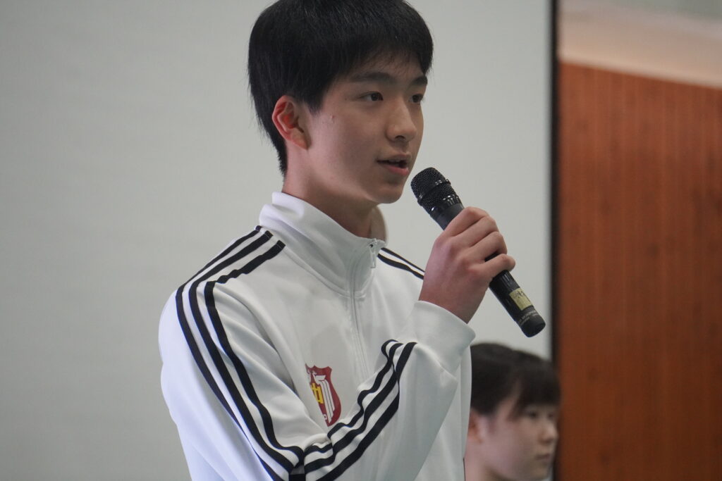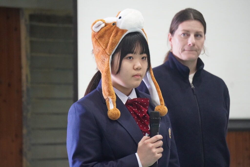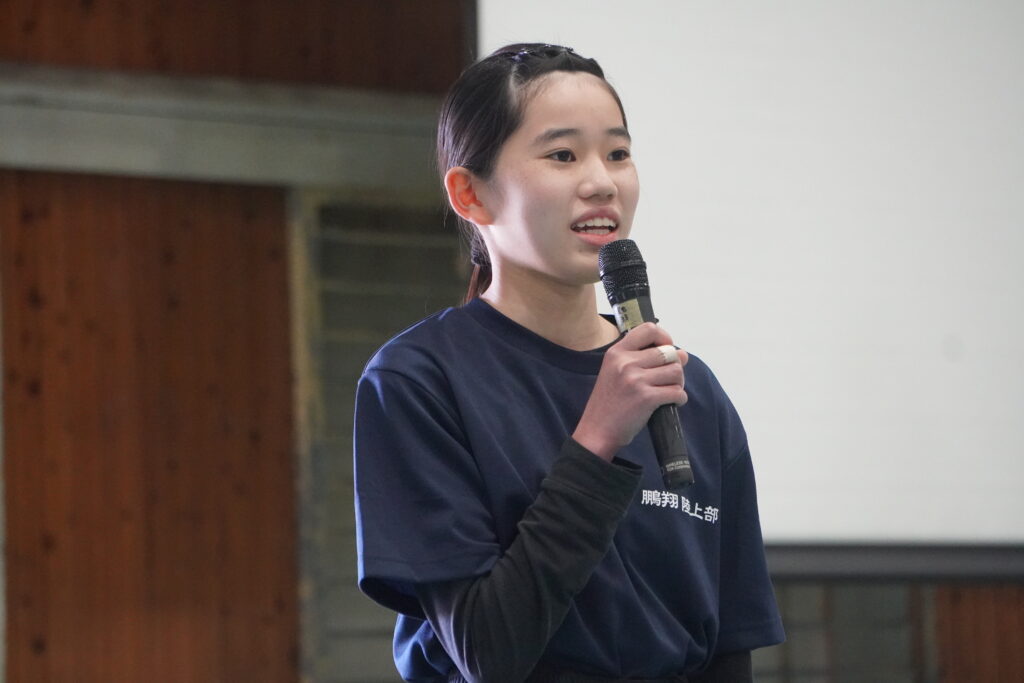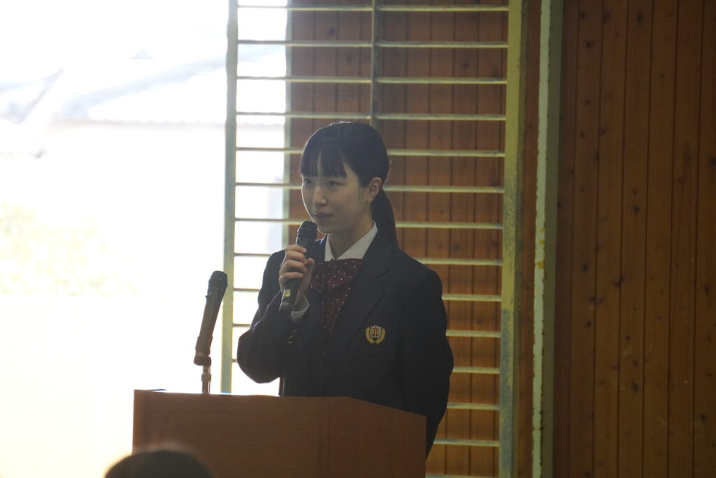 式が始まると、今年度大学に合格した中高一貫の先輩方の紹介、本校のALT紹介、部活動紹介などが始まりました。