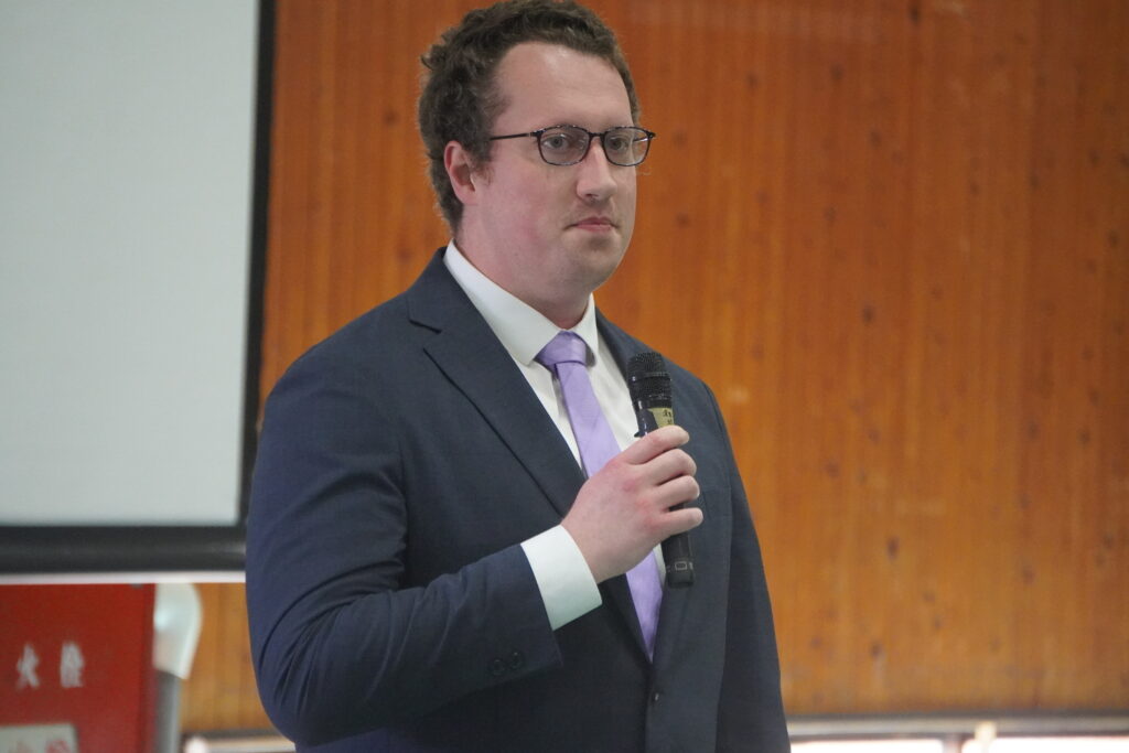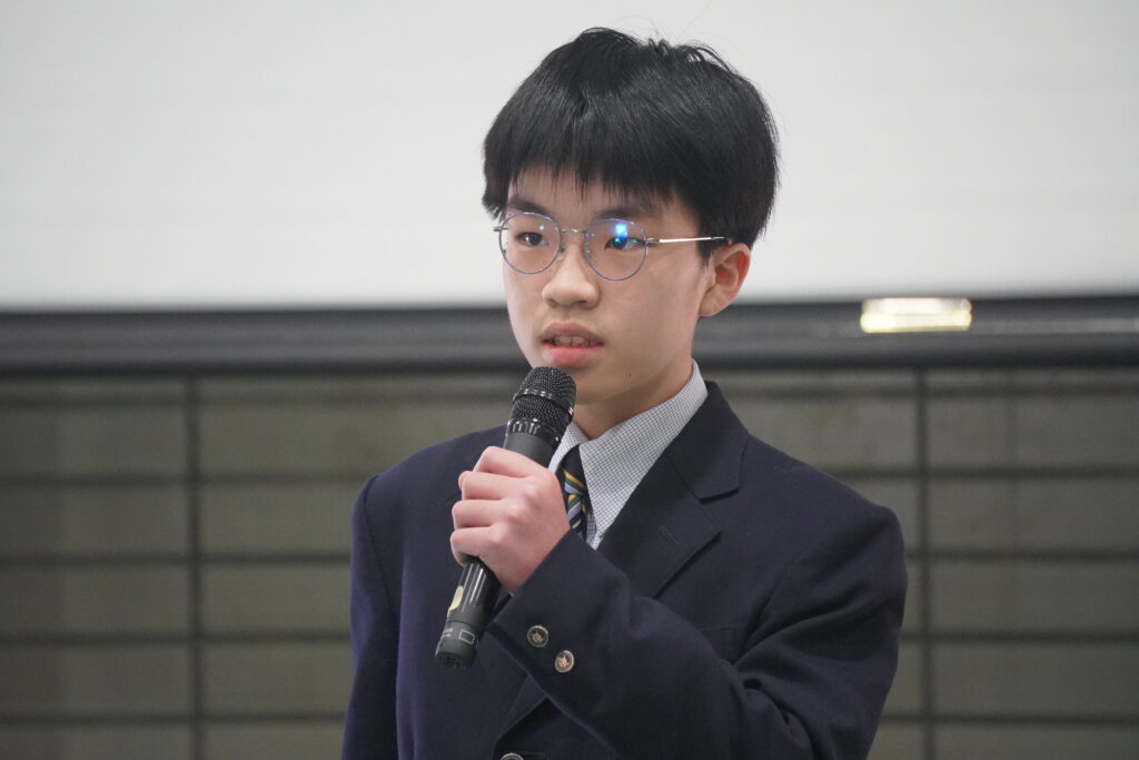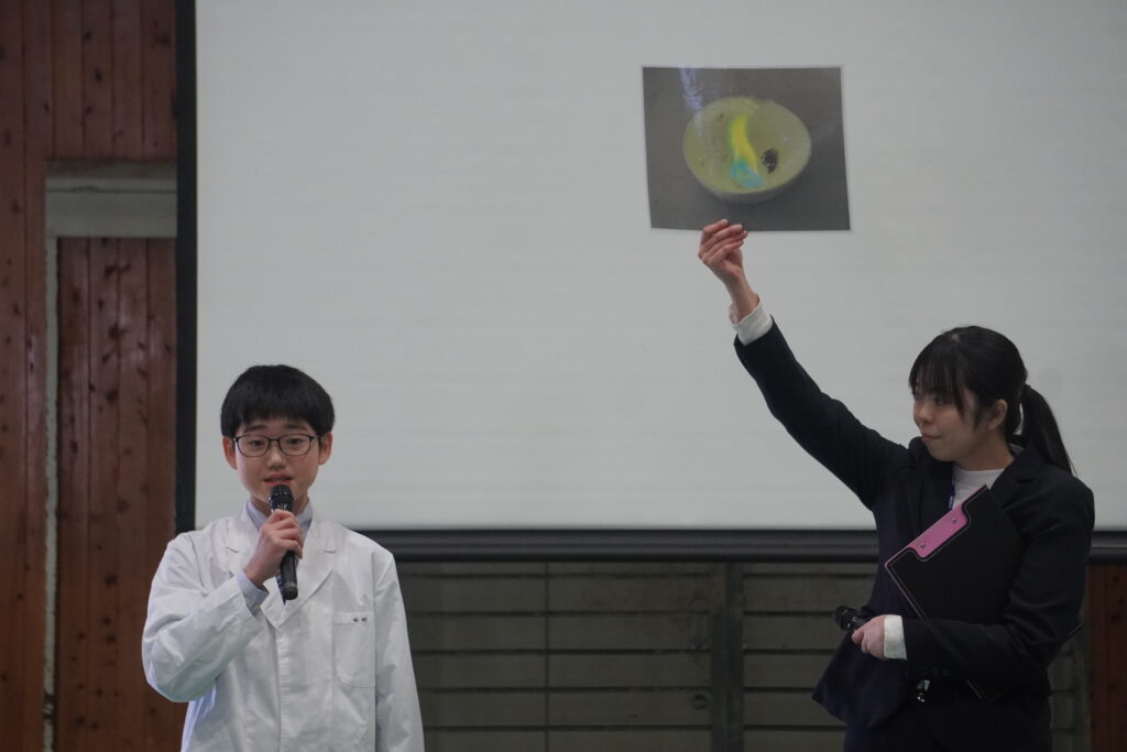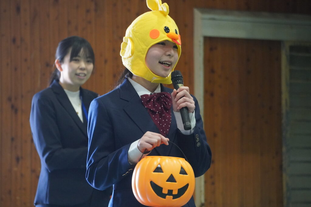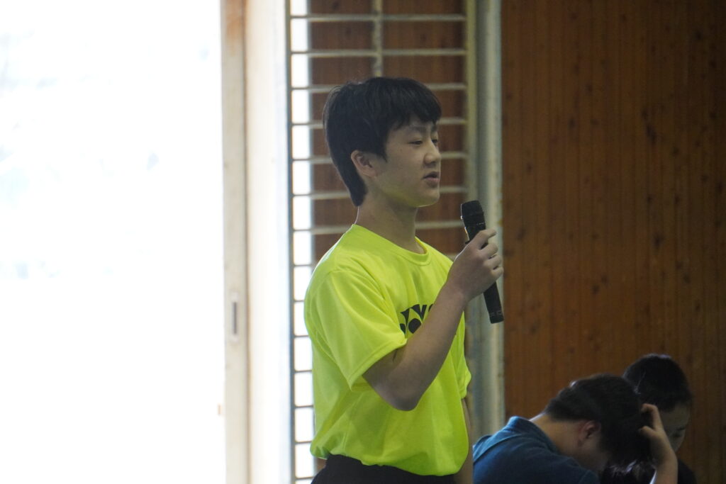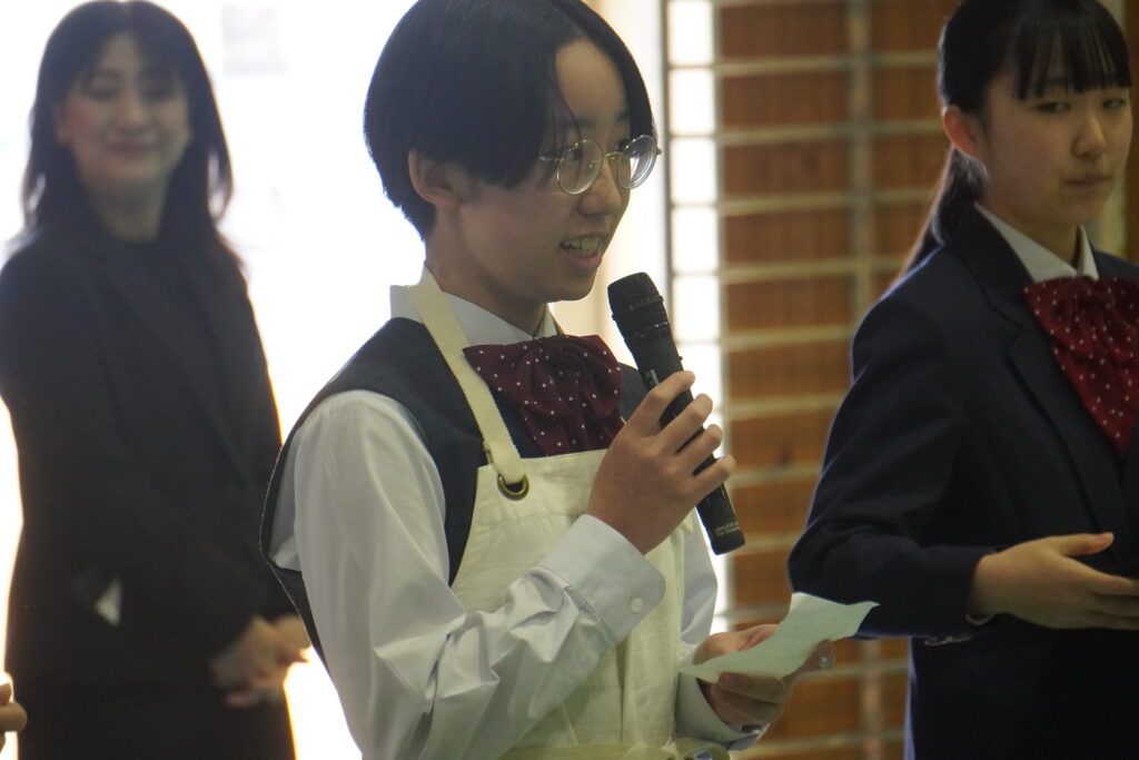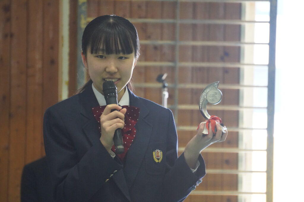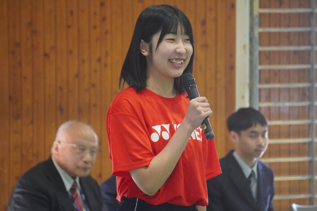式が始まると、今年度大学に合格した中高一貫の先輩方の紹介、本校のALT紹介、部活動紹介などが始まりました。