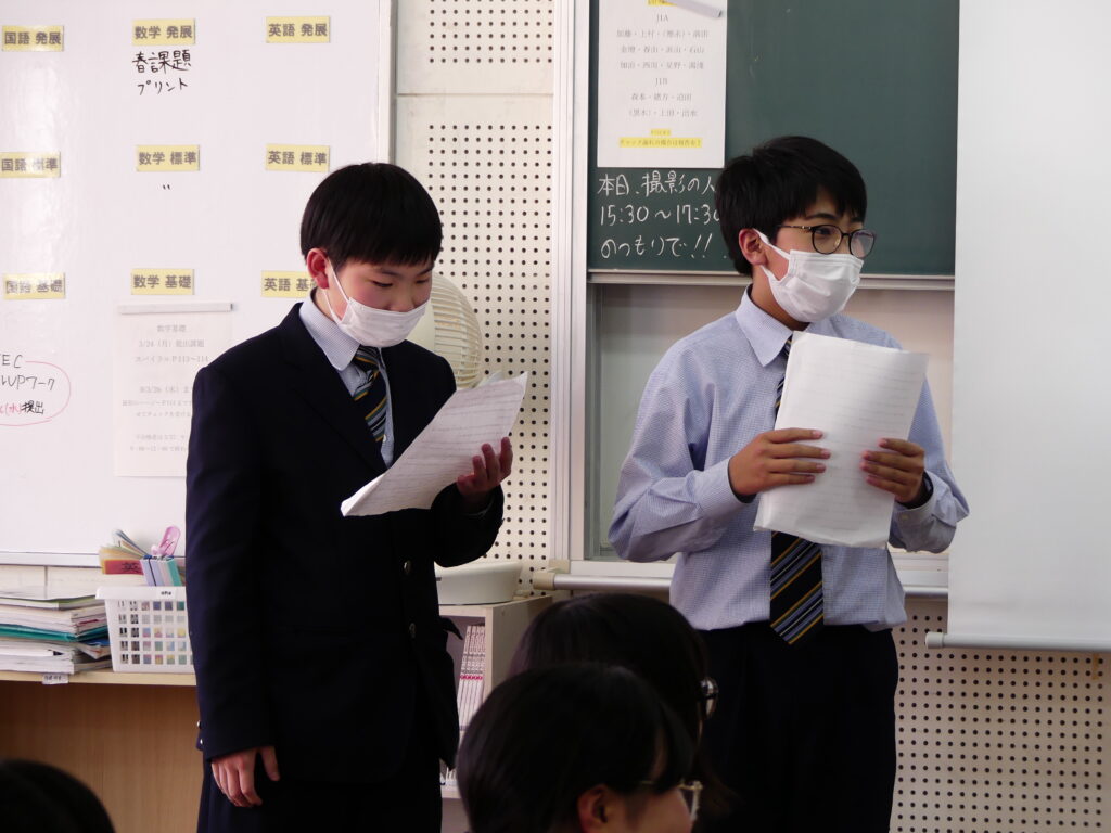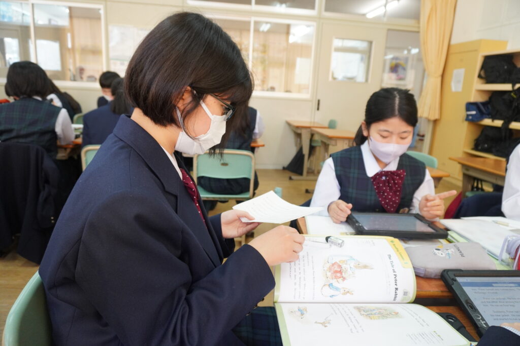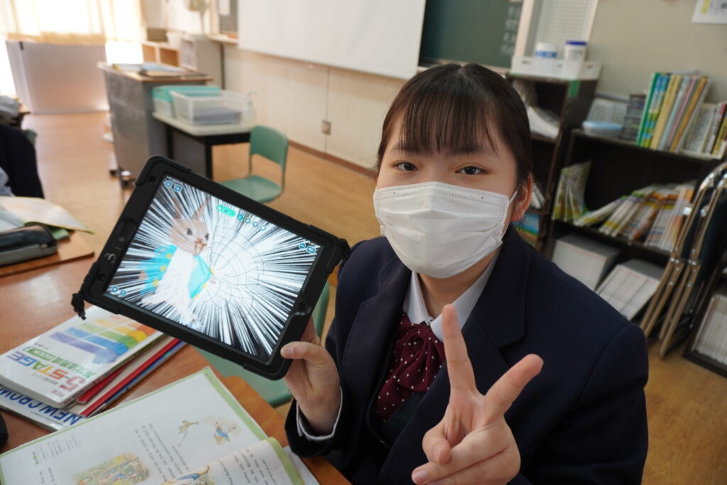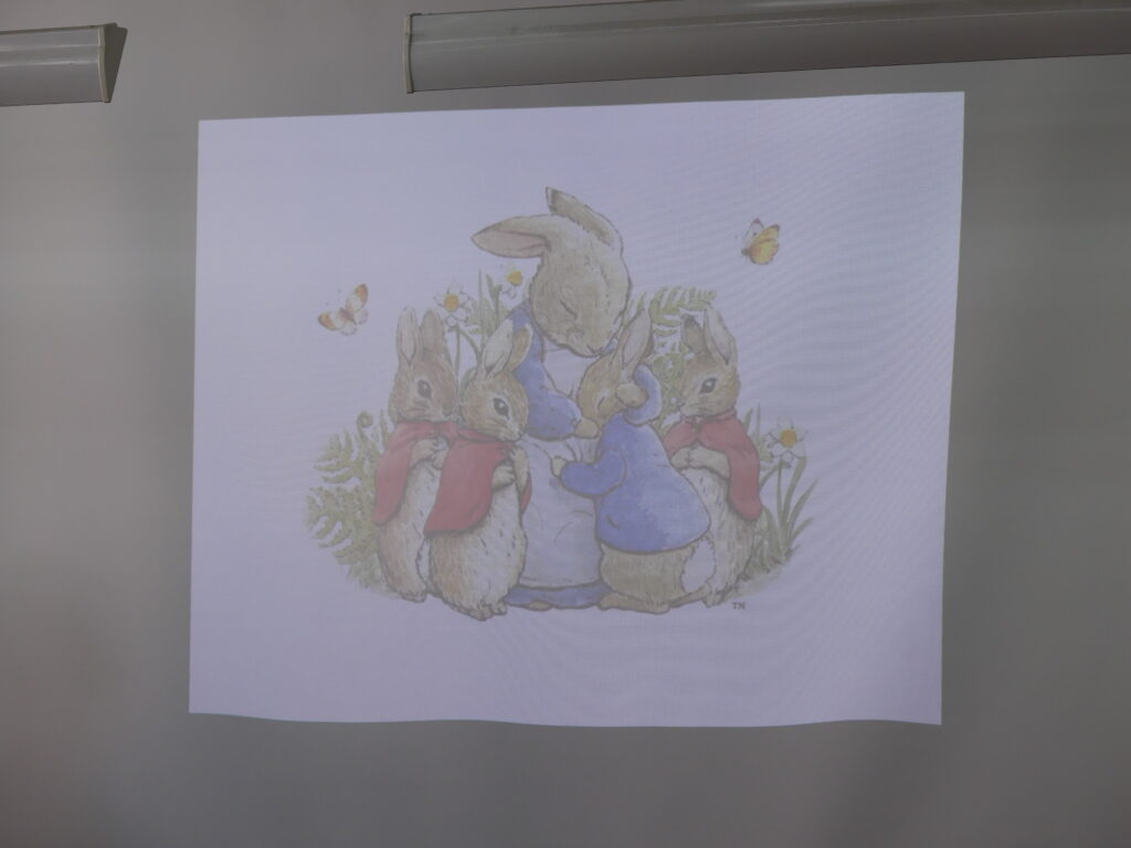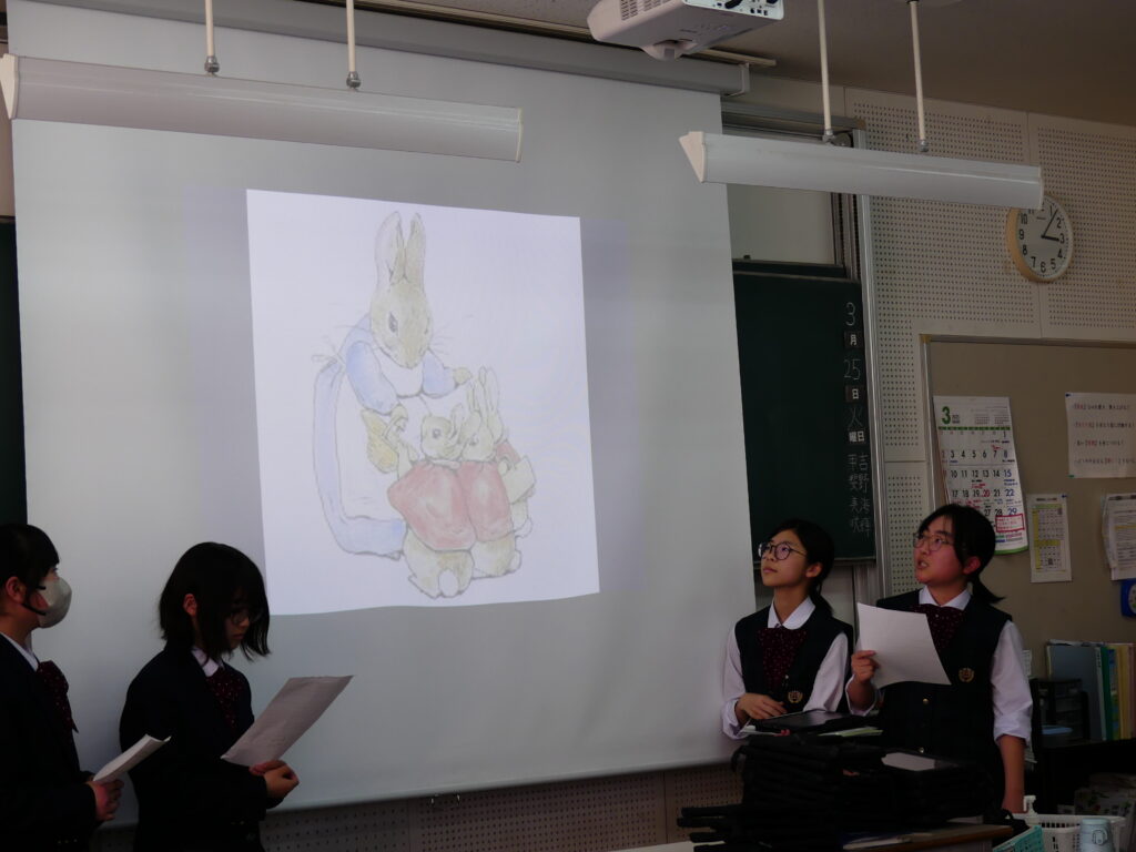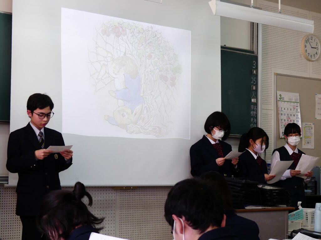 6限目に、そのスライドを使い、ピーターラビットの朗読をしていました。どのように発音し強弱をつけて表現すれば物語を楽しく聴いてもらえるのか、各グループ工夫が見られた時間でした。