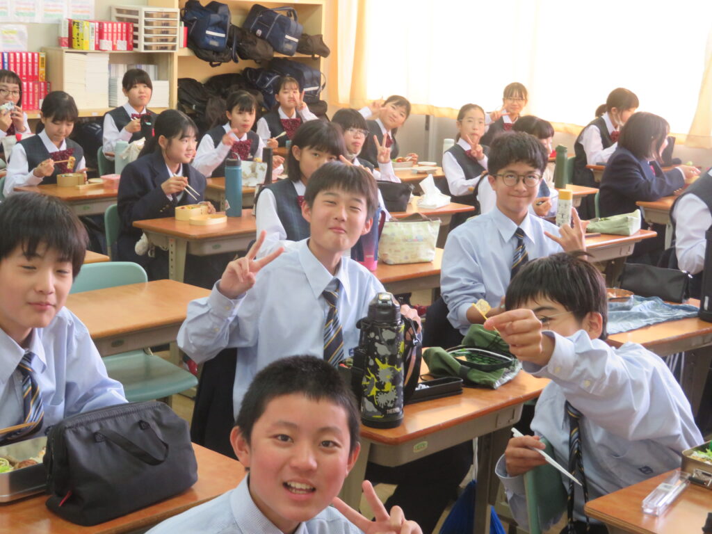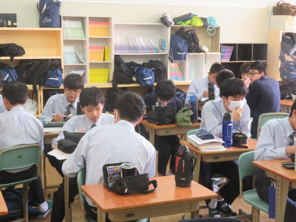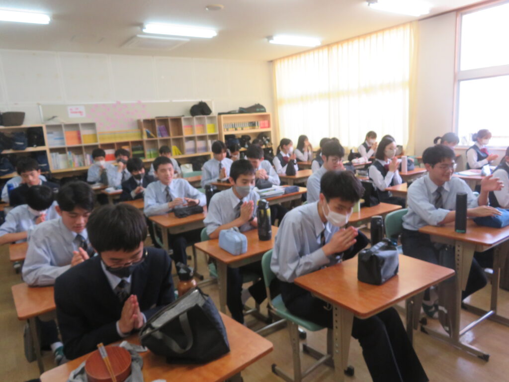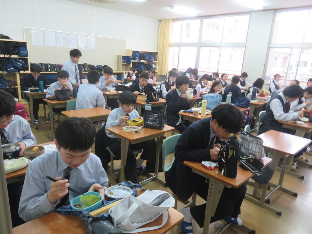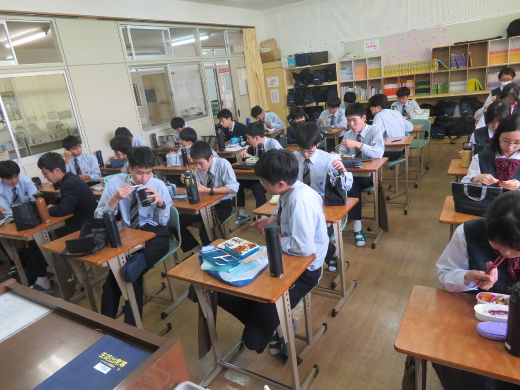早朝の登校(6時前からバスや電車に乗る人もいます)から1限目~4限目をがんばって、ほっと一息つく時。「合掌!いただきます。」 おいしそうなお弁当やパンをほおばりながら、なごやかな時間が流れます。