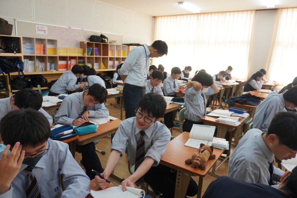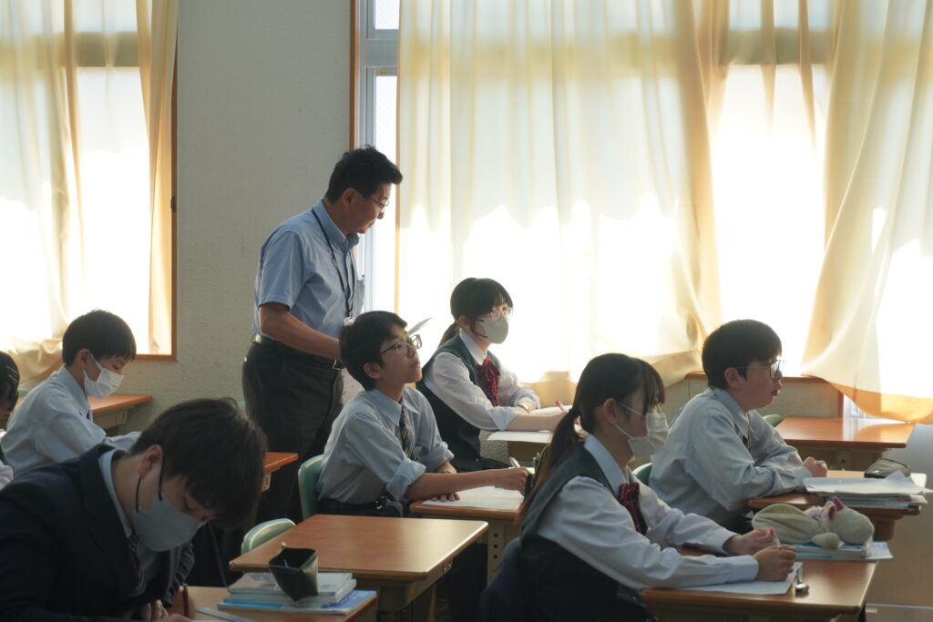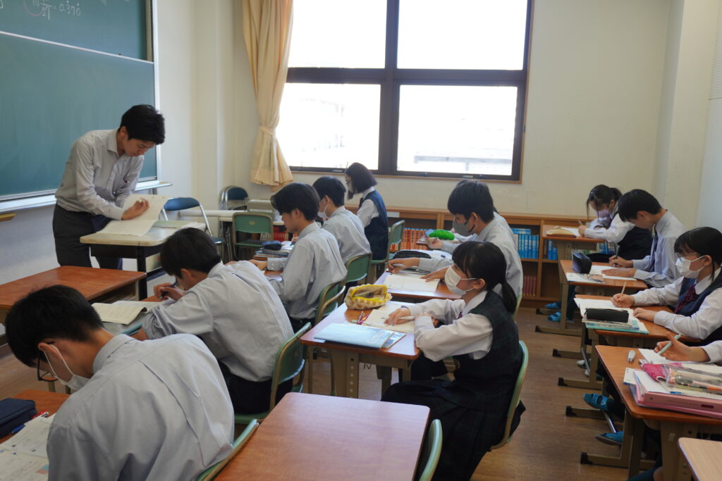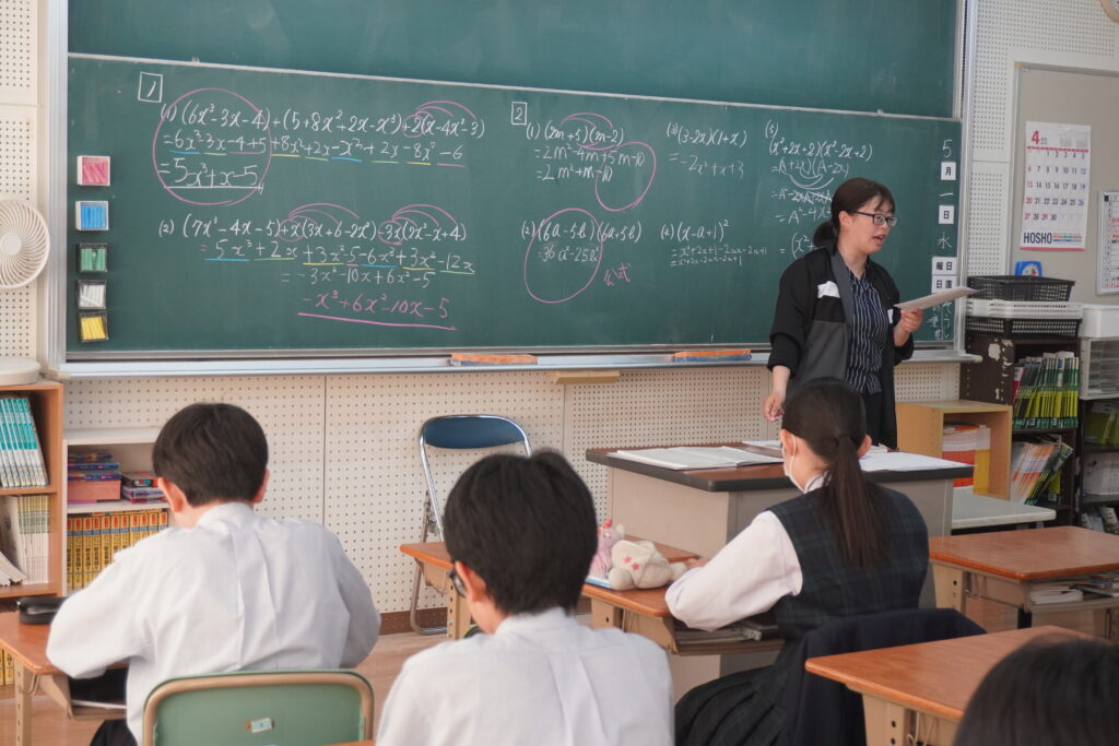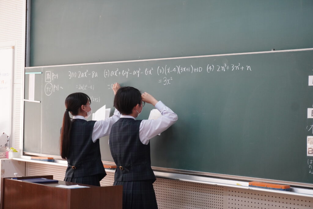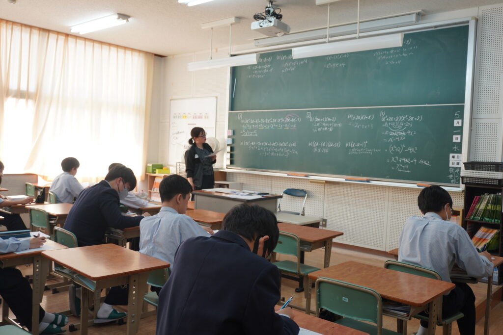 昨日の雨雲がすっかり姿を消して、今日は青空が広がる良いお天気になりました。J3数学の授業が行われていましたので、少しお邪魔して授業の様子をお届けします。まずは、J3B教室をのぞいてみました。授業内容は式の計算で、展開と因数分解に取り組んでいました。