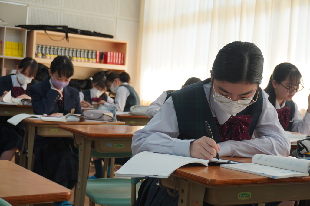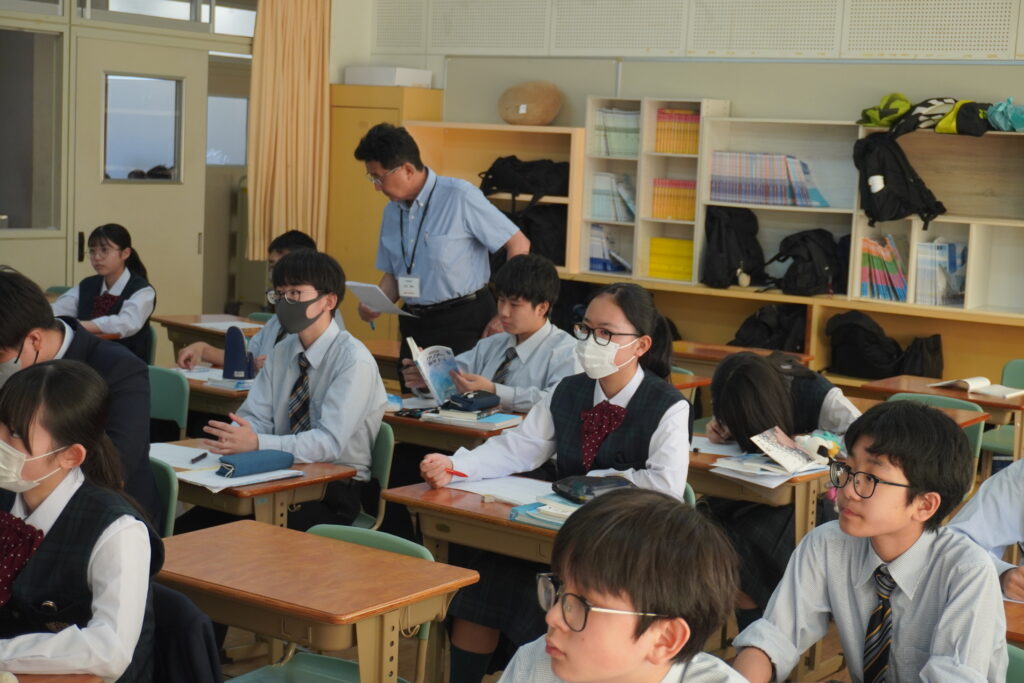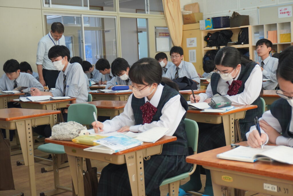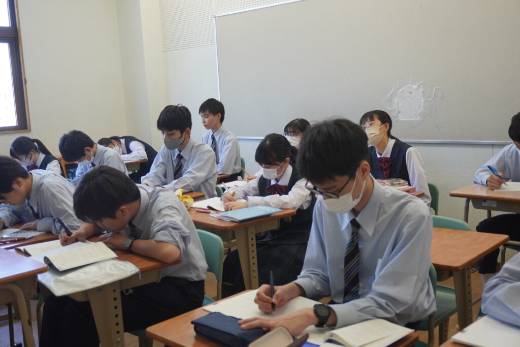 最後はJ3A教室をのぞいてみました。黒板には問題が提示されており、生徒たちがそれぞれ協力しながら、あるいは独力で解答を試みていました。