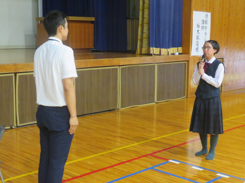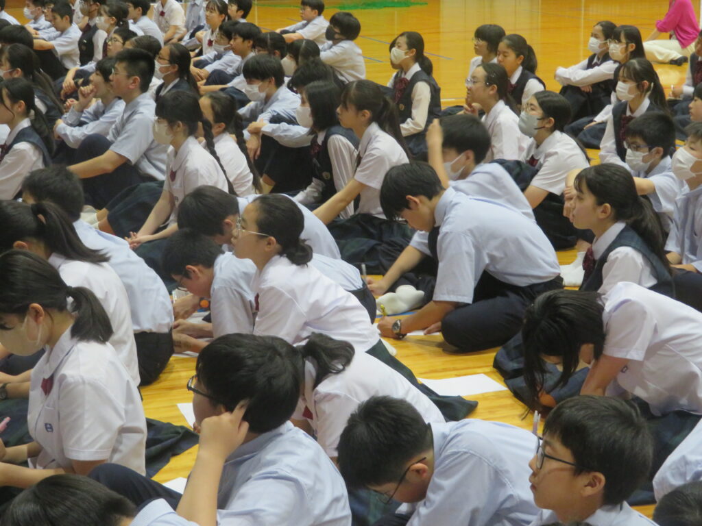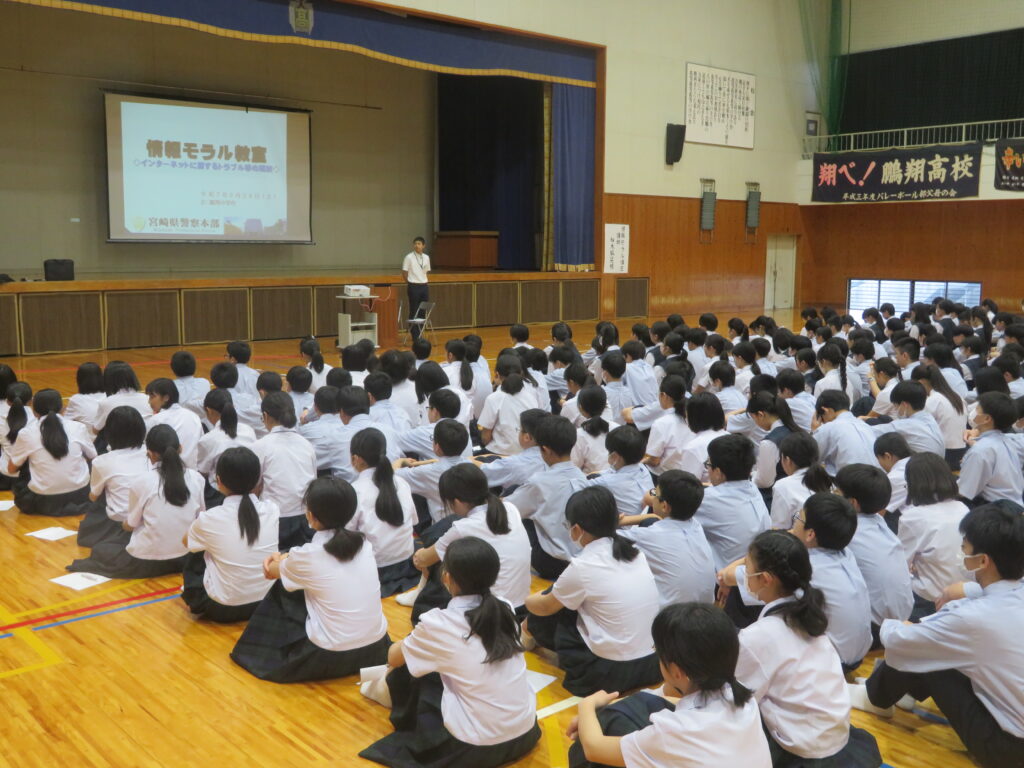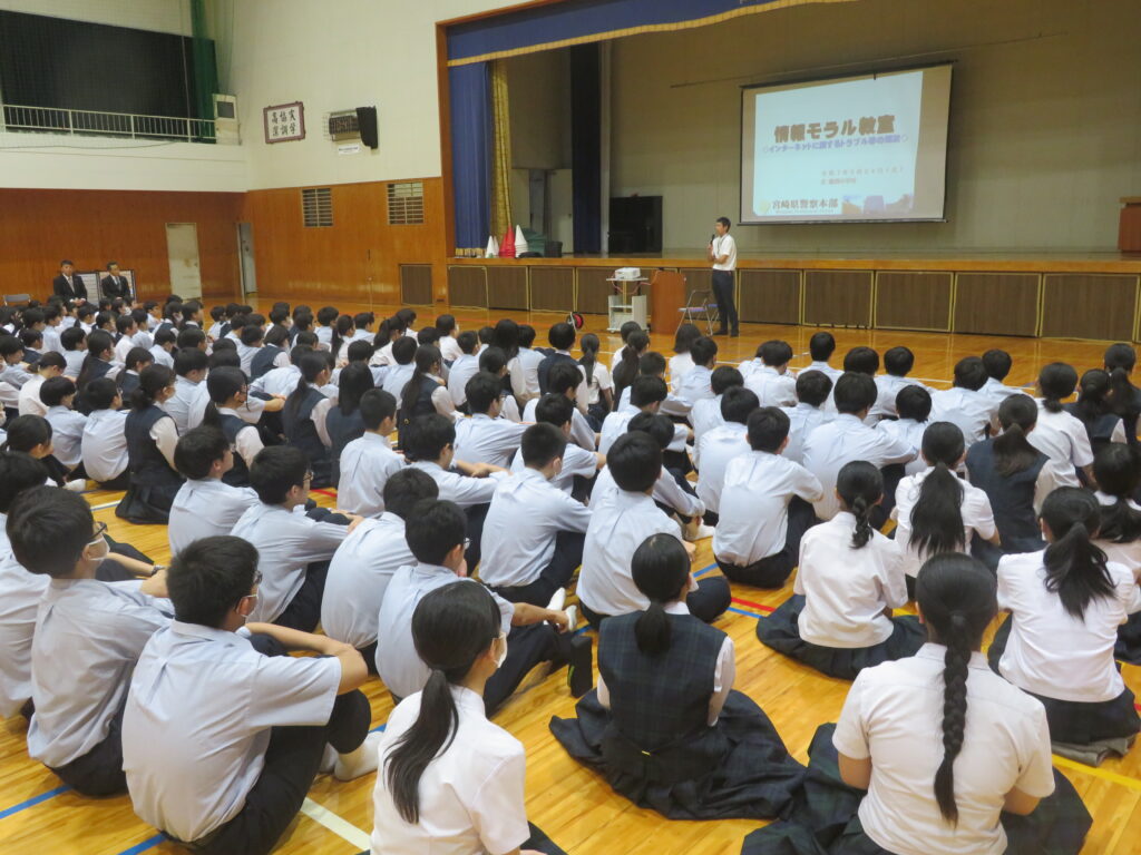 本日は、宮崎南警察署生活安全課より講師を招き、全学年対象に情報モラル教室が実施されました。身近になったインターネットやSNSについて、適切な利用法を確認しトラブルを未然に防ぐことを目的に行われた教室で、みなメモを取ったりしながら真剣に耳を傾けていました。