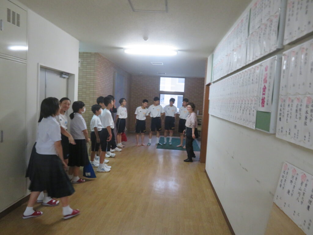 雨のため室内で筋力トレーニングをしたり、その後のミーティングをしたりした部もありました。壮行式で選手宣誓をした剣道部の清水幸弥さん(J3A 潮見小出身)の言葉のごとく、これまでの活動を支えてくださった多くの方々への感謝を忘れず、一試合一試合を大切にして、最後まで戦ってきてください。全校生徒、職員、みんなで応戦しています。