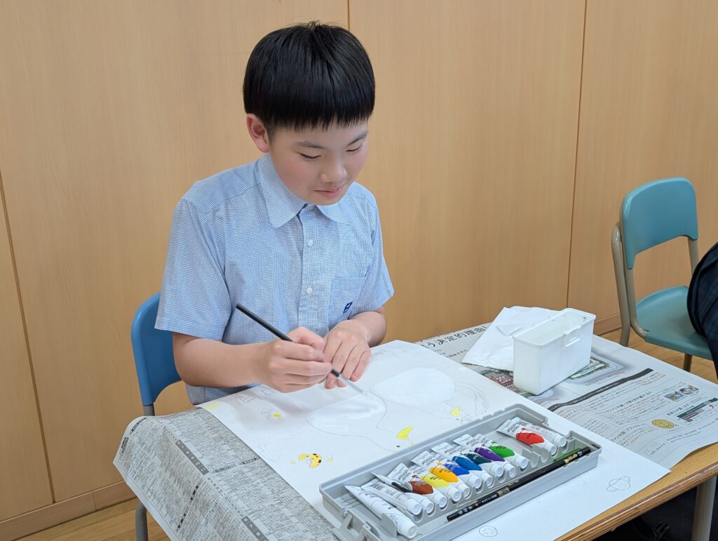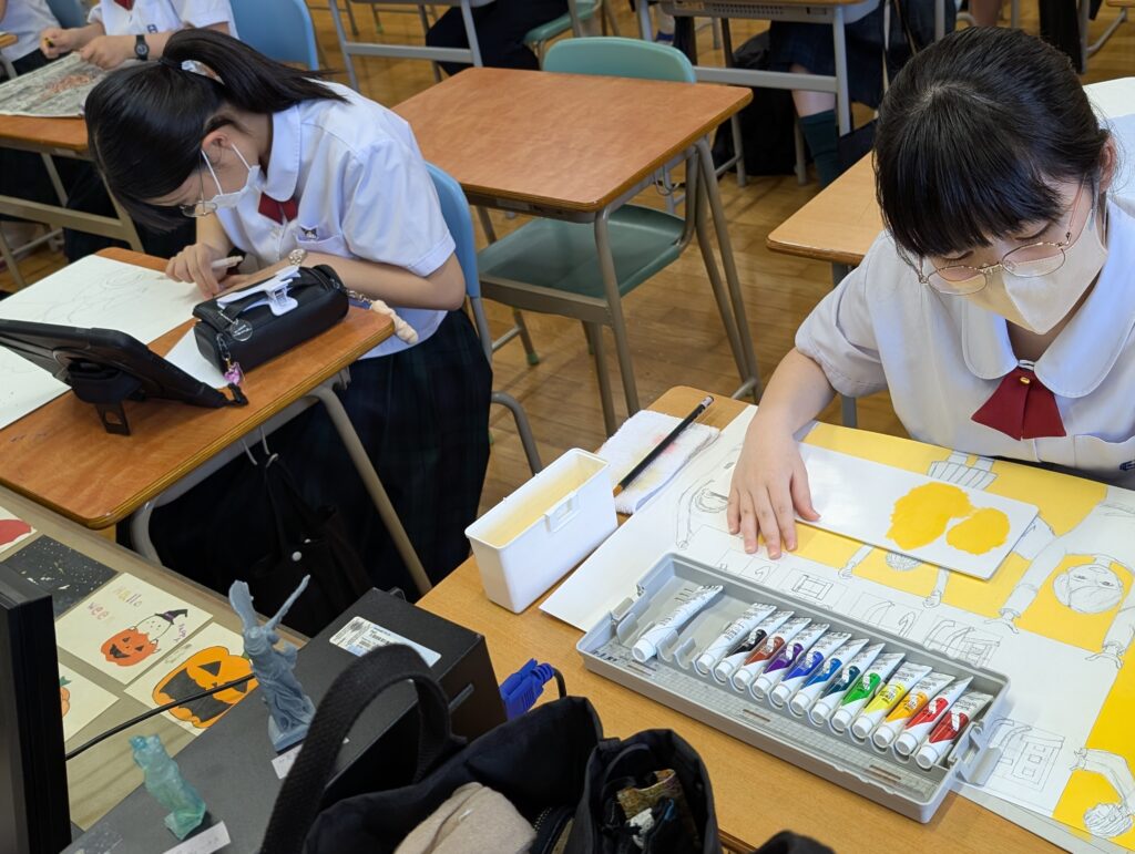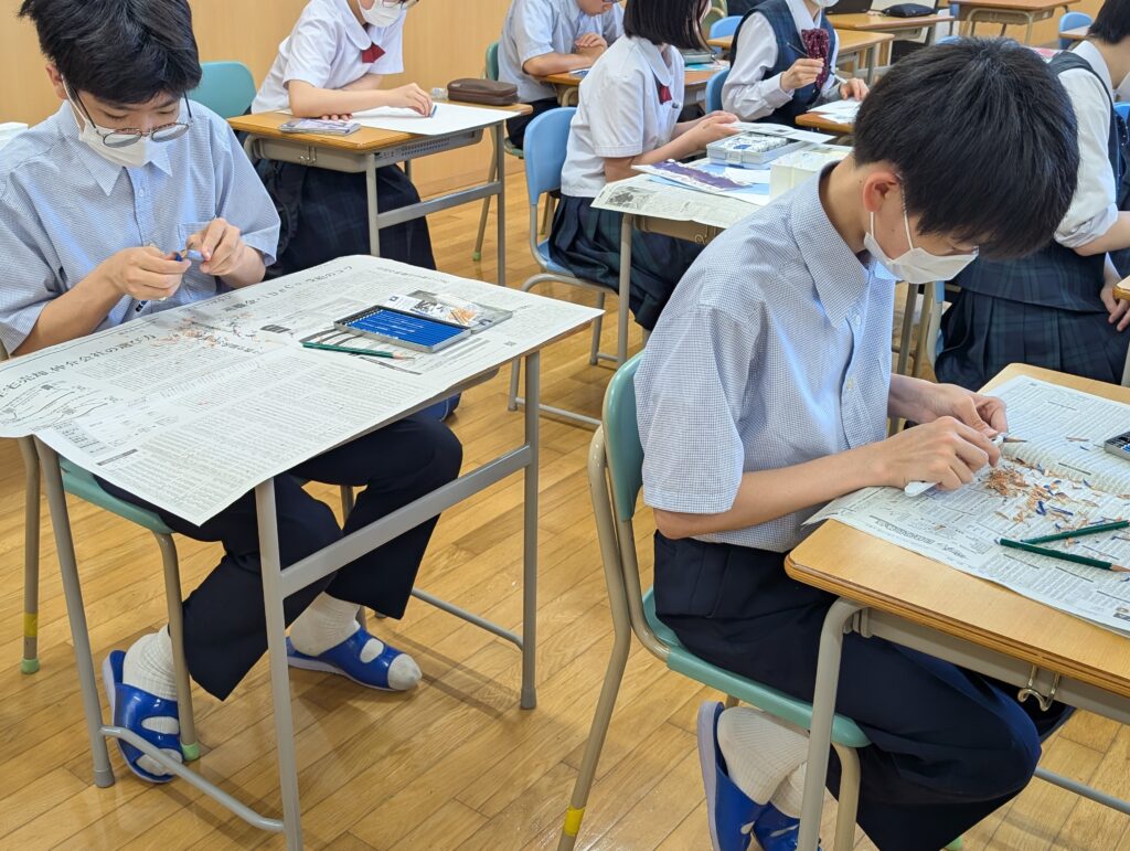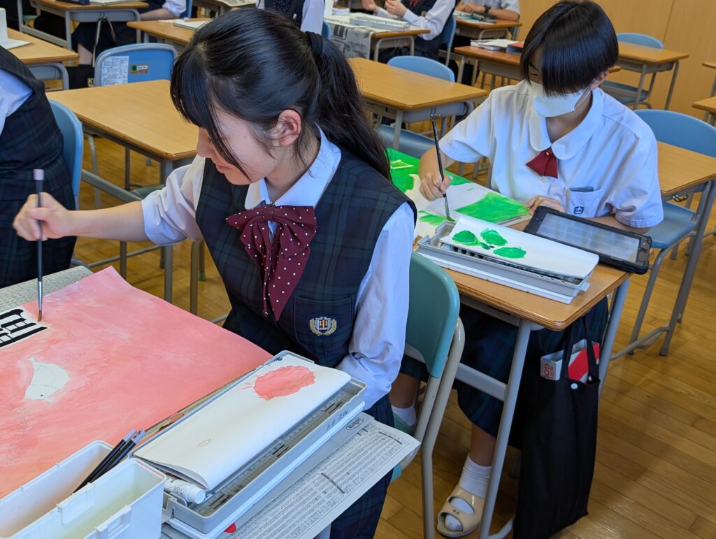 また、美術室ではJ2生が美術の授業で描いているポスターの作業をしていました。丁寧に色を付け、いい作品を作り上げようと頑張っていました。