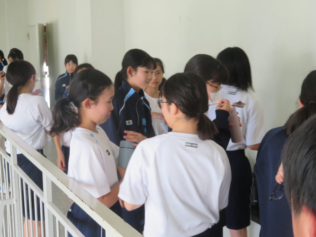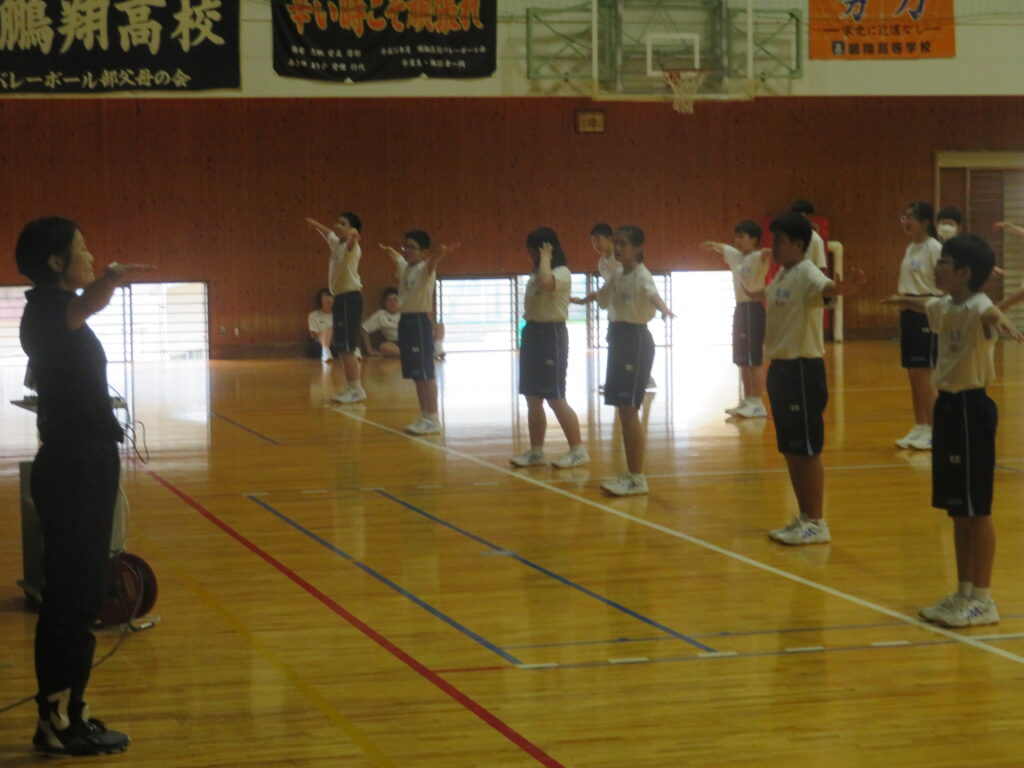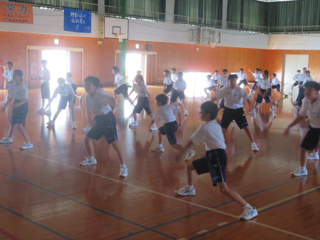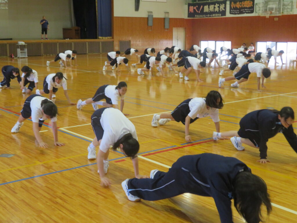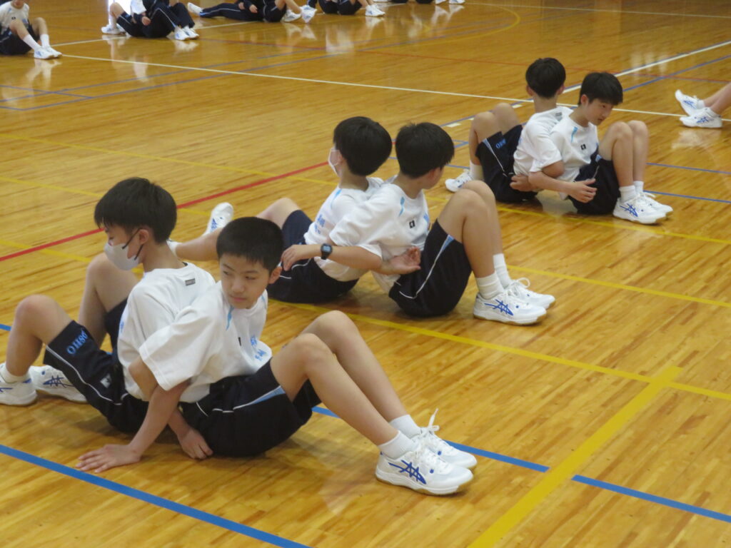J1生は、今日の6限の体育の授業にて、体育大会で踊る「よさこいソーラン」の練習を行いました。準備運動や柔軟体操で身体をほぐしたあと、体育の土井先生・岡本先生の指導の下、練習に入りました。未経験な生徒、小学校の時と振付けが違う生徒もいるので、まずは鵬翔中学校の振付けを覚えるため、先輩たちが実際踊っている映像を見ながら、踊る上での気をつける点に耳を傾けていました。そのあと、熱中症対策のため、こまめに水分補給をしながら何度か通しで練習しました。まだまだ動きがぎこちない生徒も多いですが、9月の本番ではすばらしい仕上がりになっていると思います。