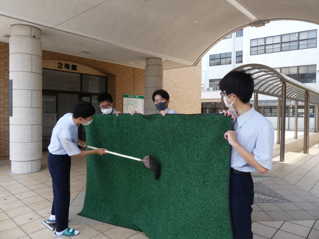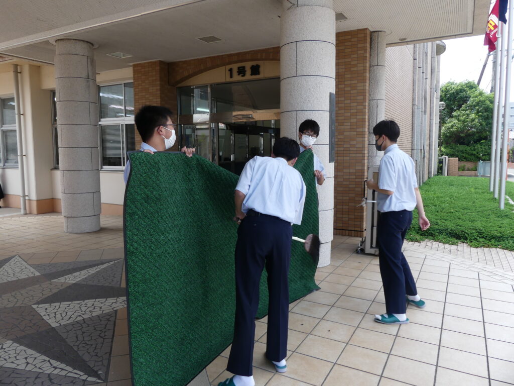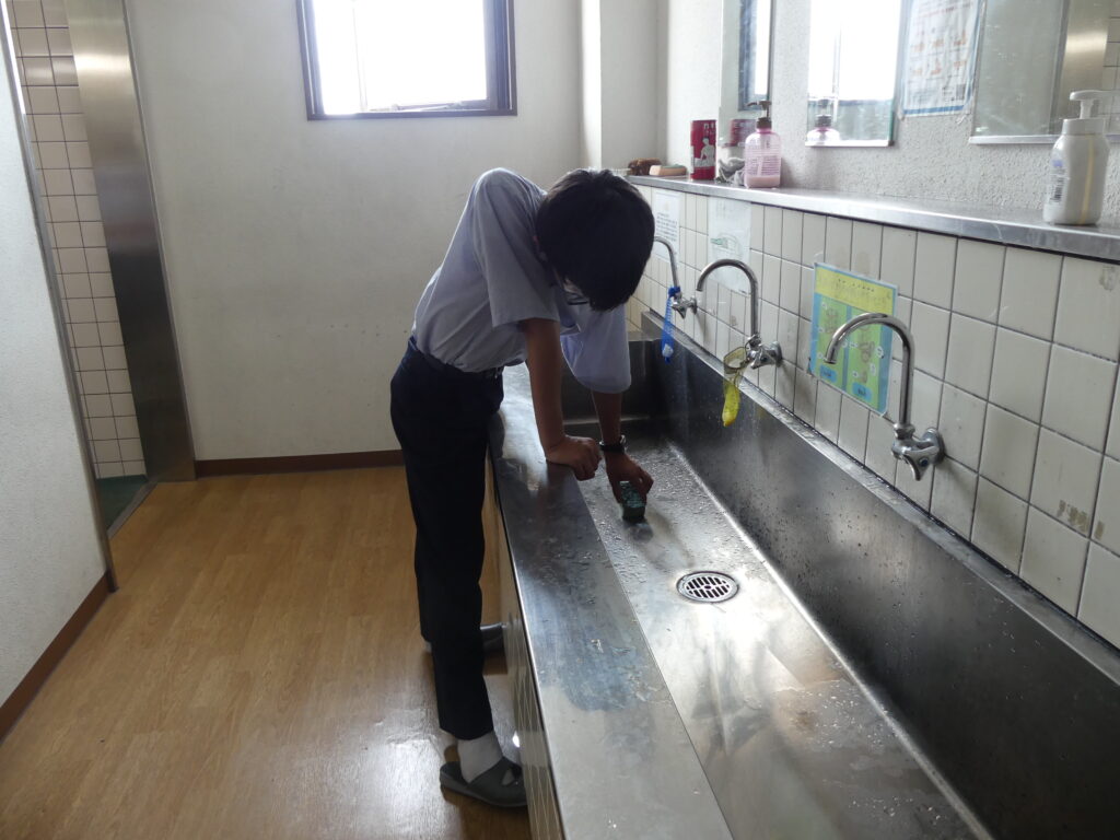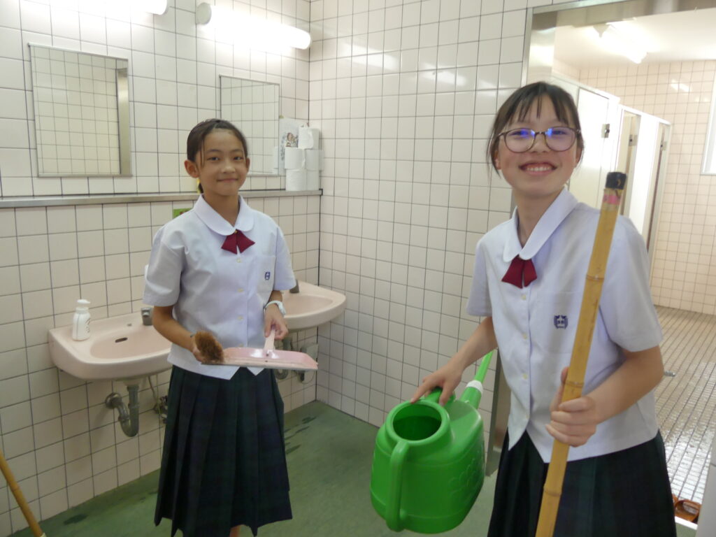 ファミリーという学年の壁を越えたグループで清掃活動を行います。玄関前では協力し合って大きなマットのほこりを落としていました。トイレや手洗い場、教室など自分たちの清掃場所を責任をもって清掃しています。学校がきれいになると、心まできれいになりますね。