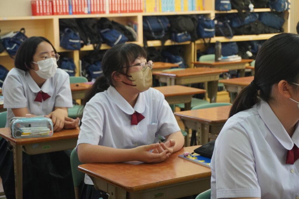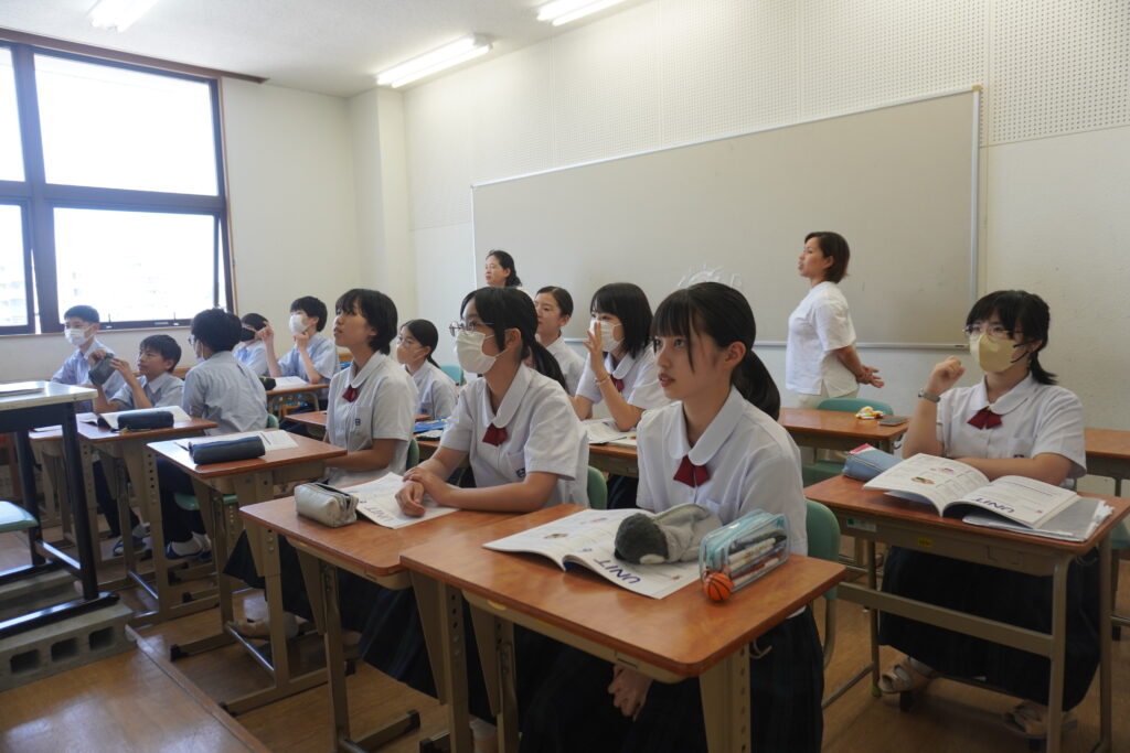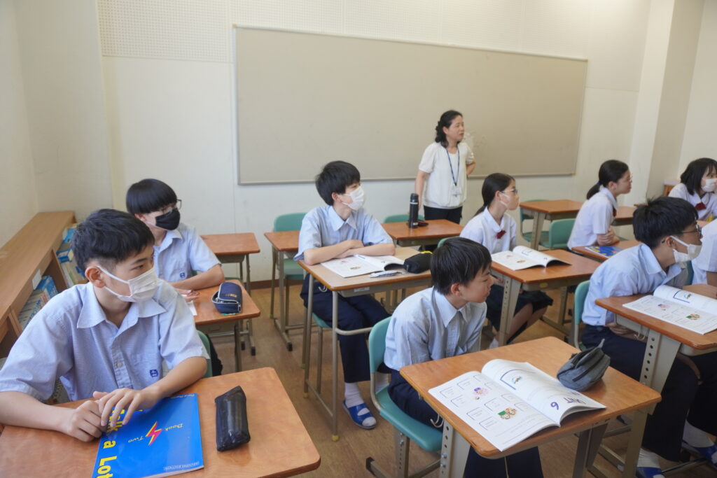 本日は、3時間目のJ2B英会話の授業にお邪魔しました。鵬翔中学校では、1クラスを3グループに分けて、ALTの先生3名と、日本人の英語科の先生3名がサポートしつつ、独自の工夫を加えながら、毎回様々な英会話活動をされています。