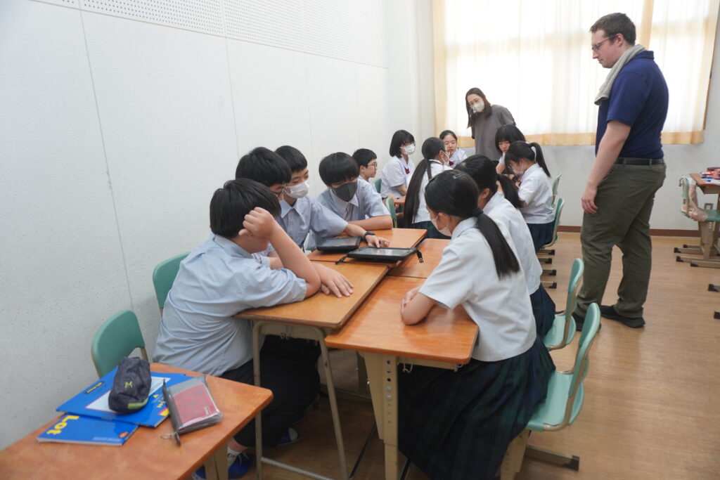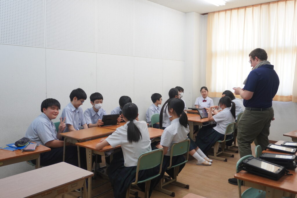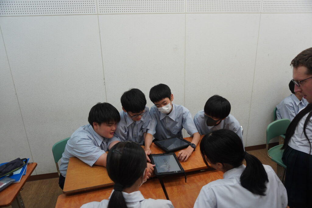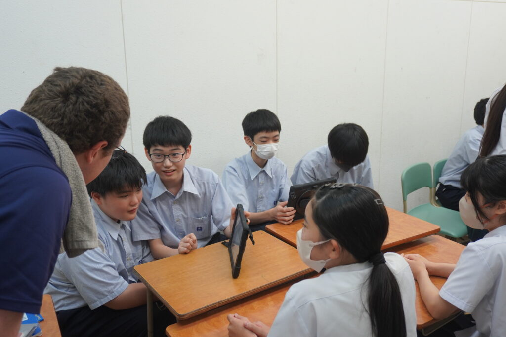 CJ先生のクラスでは、今カナダで流行っているゲームをipadを使って取り入れながら、現在、生徒たちが教科書で学んでいる『比較級』について楽しく学んでいました。