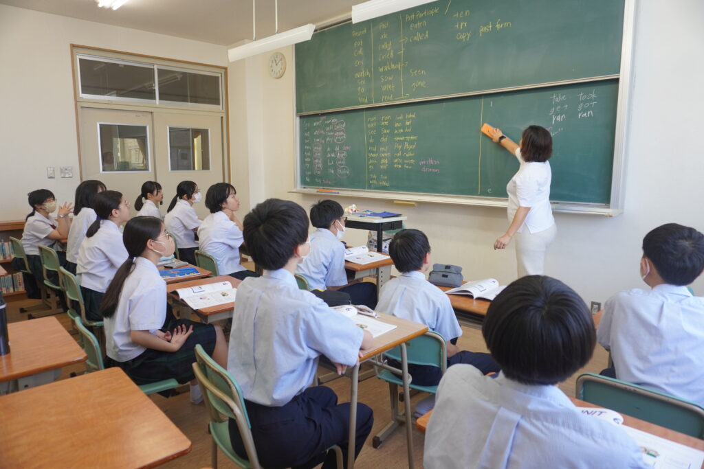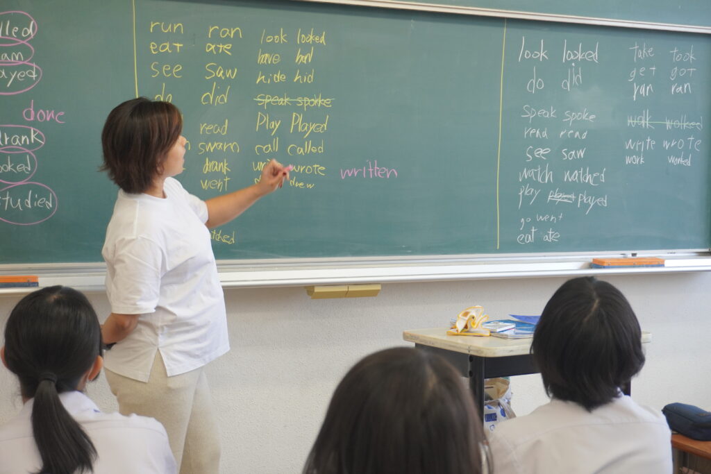 Cat先生のクラスでは、グループごとに一般動詞の活用を黒板にたくさん書き出すゲームをしながら、過去分詞を学んでいました。”Have you ever~ ?”という質問から始めて、どうすれば長く会話を続けることができるか、先生の説明に、生徒たちは熱心に耳を傾けていました。