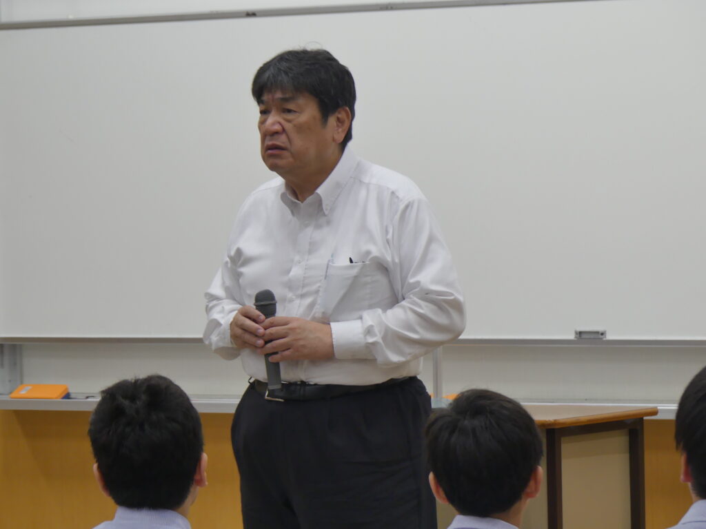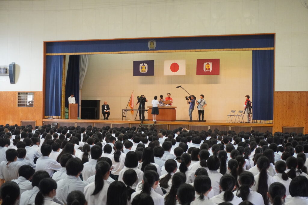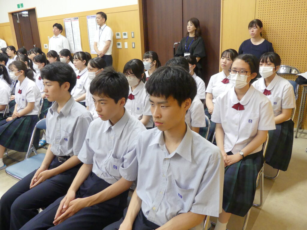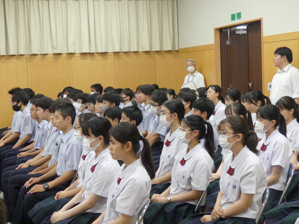 今日は令和7年度一学期の終業式でした。終業式を始める前に、鵬翔中学校の卒業生であり、現在特進英数科3年の田口菜々珠さんが、路上で倒れた人を心肺蘇生で救助を行ったことで、日本赤十字社宮崎県支部より表彰を受けました。鵬翔生として誇らしい出来事でした。