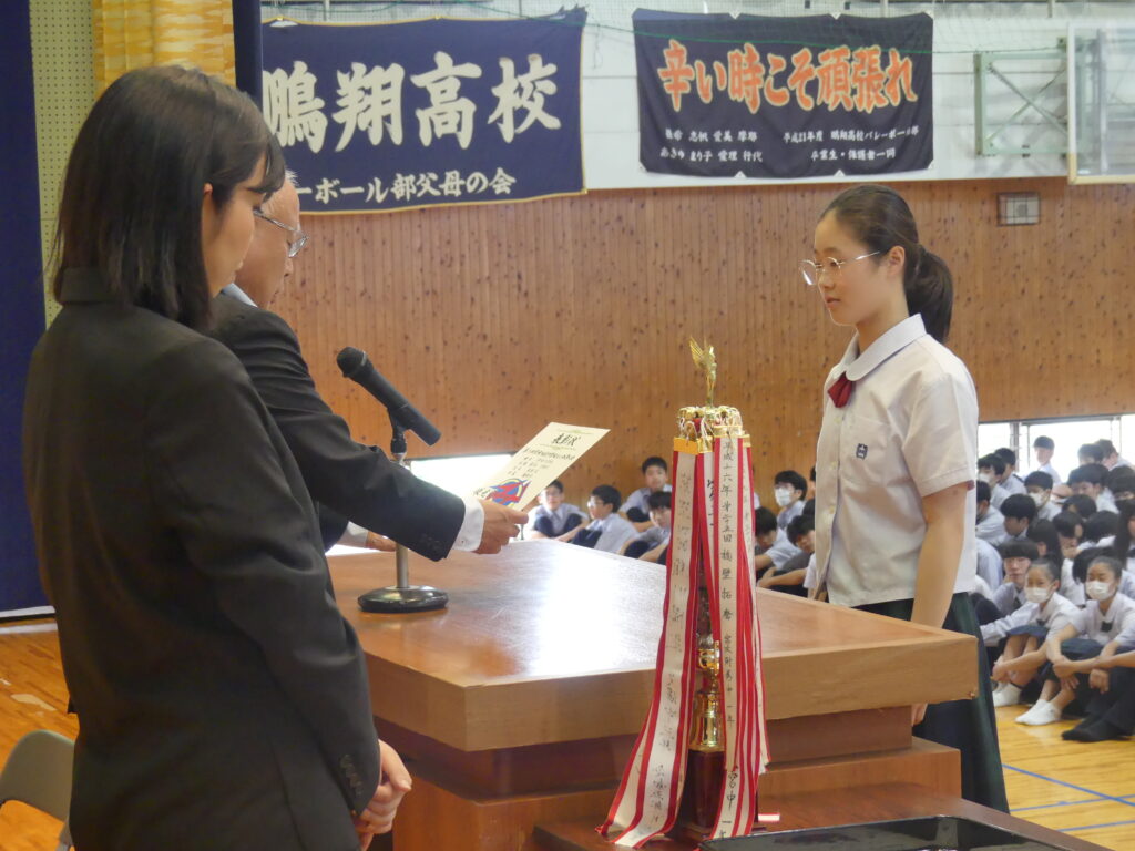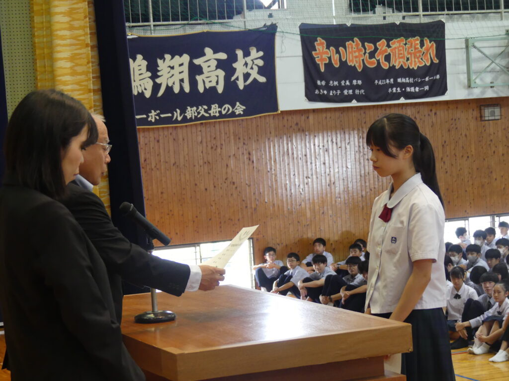 次に、鵬翔中学生が壇上で表彰を受けました。まず1人目のJ1Aの鳥原きよさんは、第76回宮崎地区中学校総合体育大会1年女子200m第1位で表彰されました。
