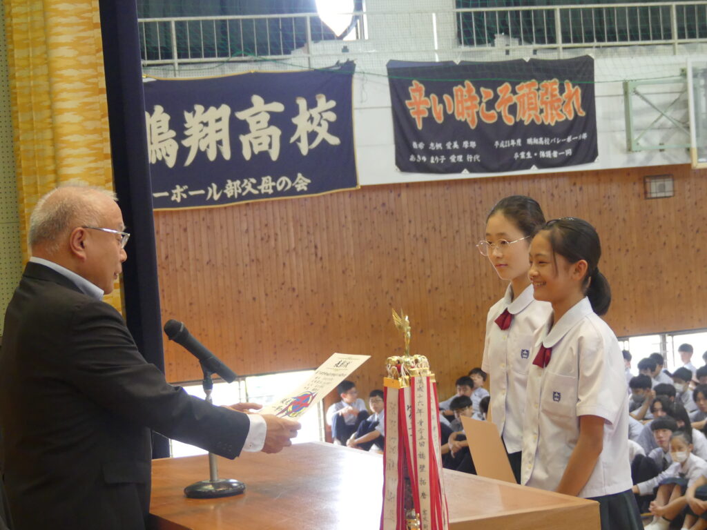 最後は、J3Bの伊豆あやめさんが第76回宮崎地区中学校総合体育大会新体操女子種目別フープ第1位、種目別ボール第2位、そして個人総合第1位で表彰されました。