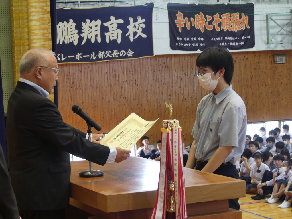 3人目は、J2Aの春山慎さんが第46回全国中学生選抜将棋選手権大会中学生選抜宮崎県大会男子の部優勝で表彰されました。