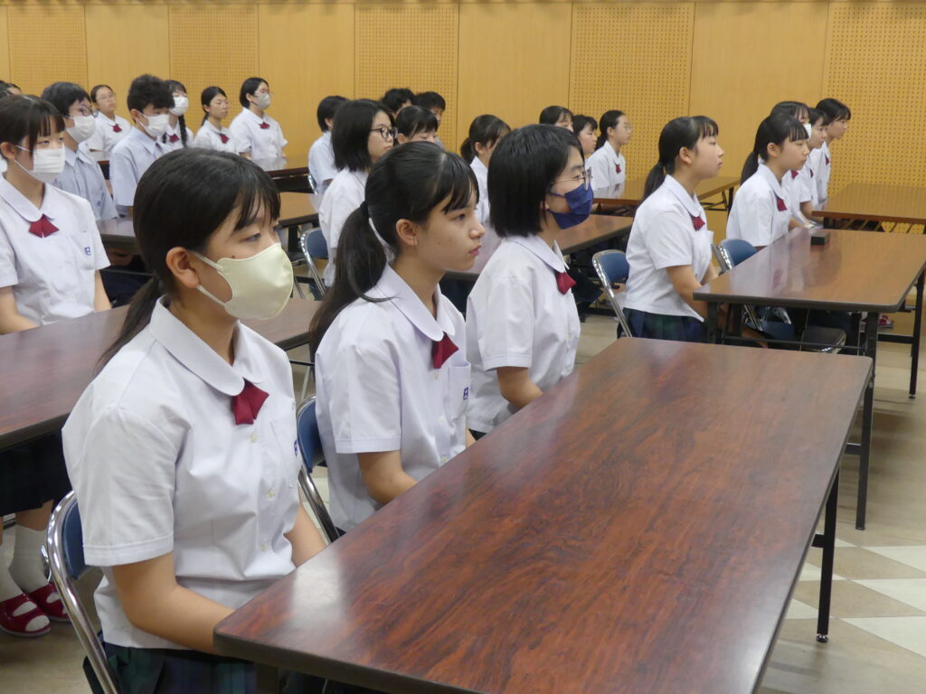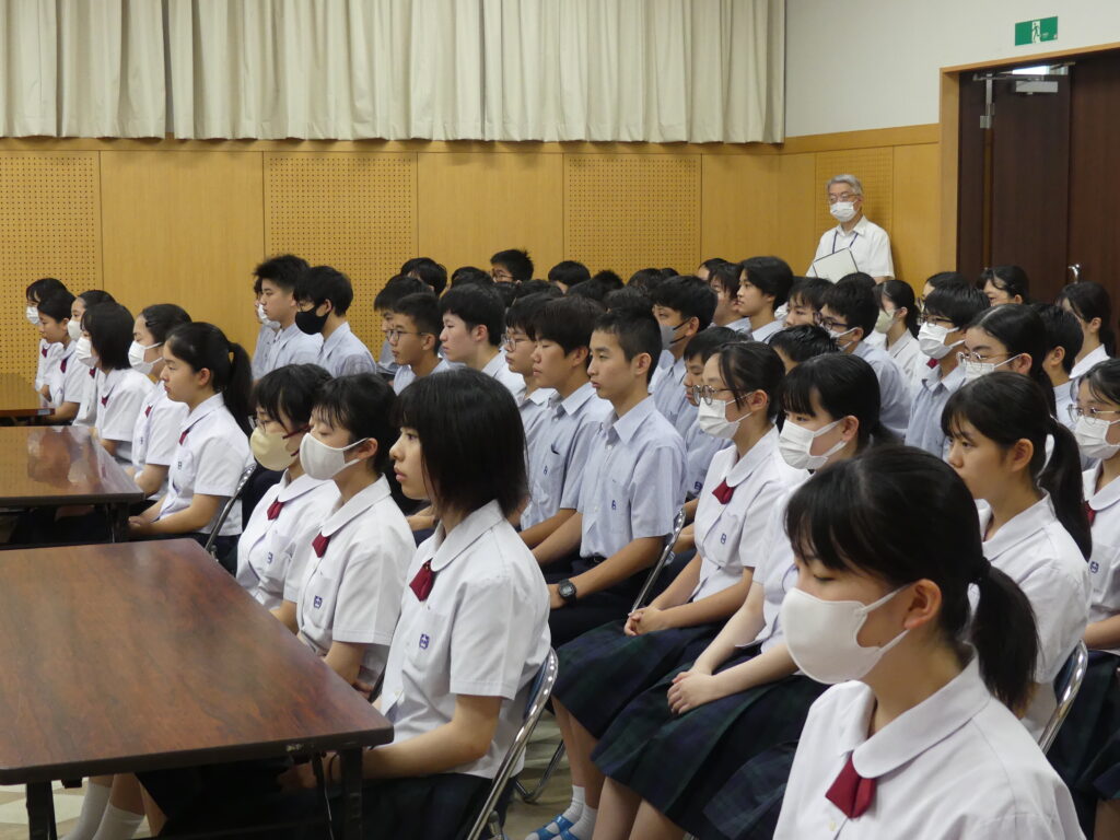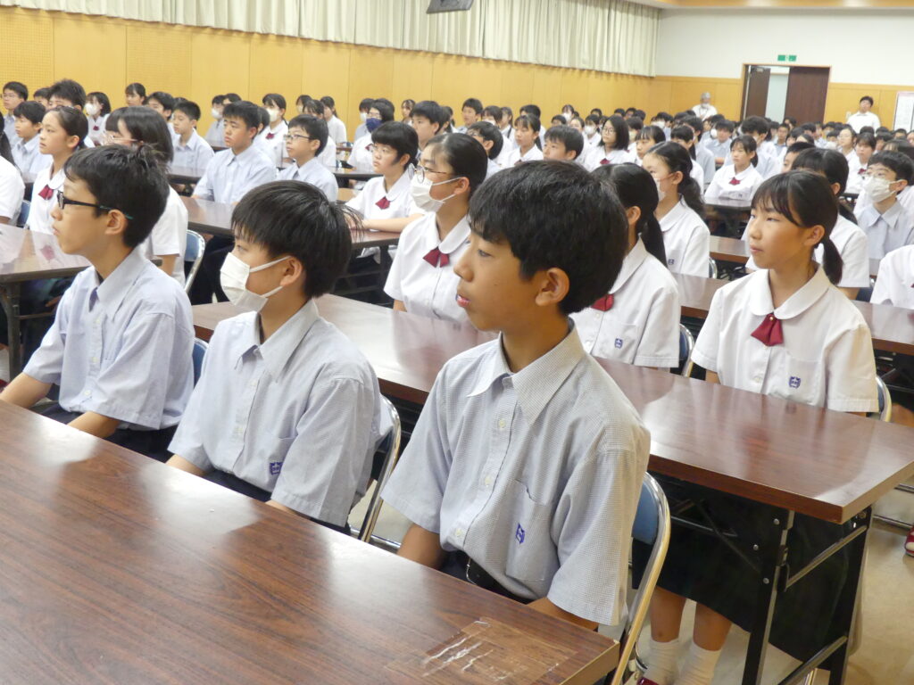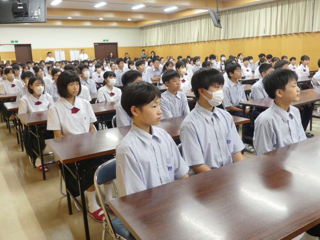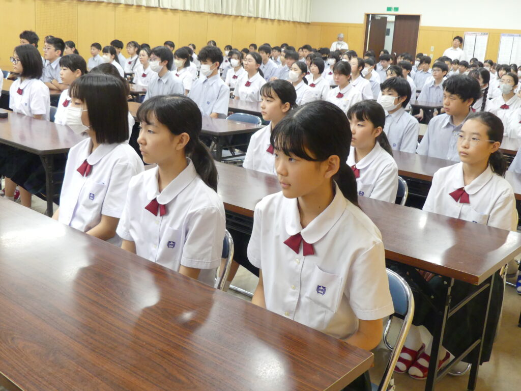 表彰式の後、終業式と中学集会が行われました。中学生のみなさんは真剣に先生方のお話を聞いていました。