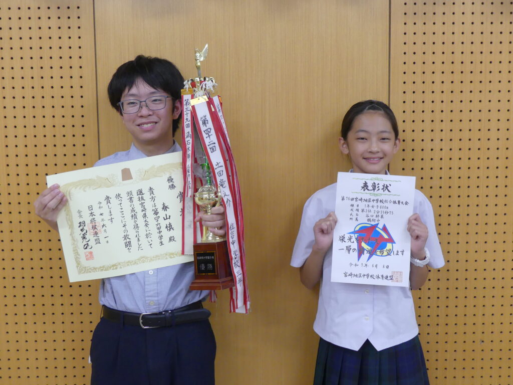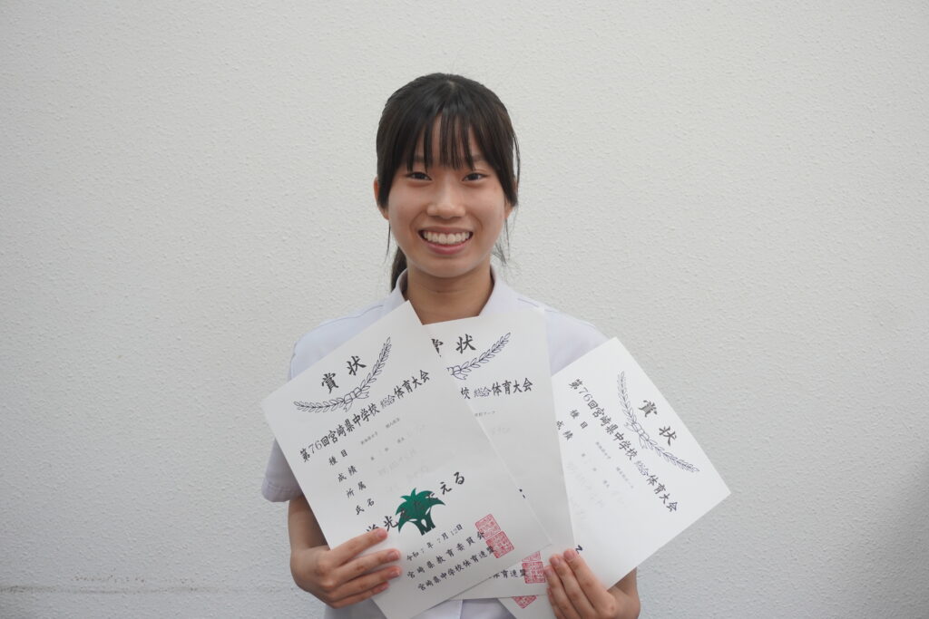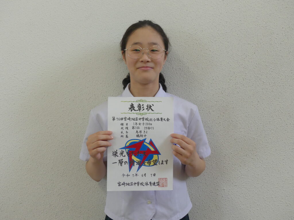 2人目は、J1Aの谷口絆菜さんが第76回宮崎地区中学校総合体育大会1年女子800m第2位で表彰されました。