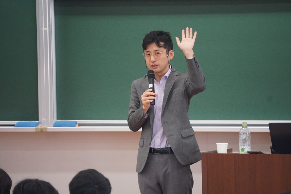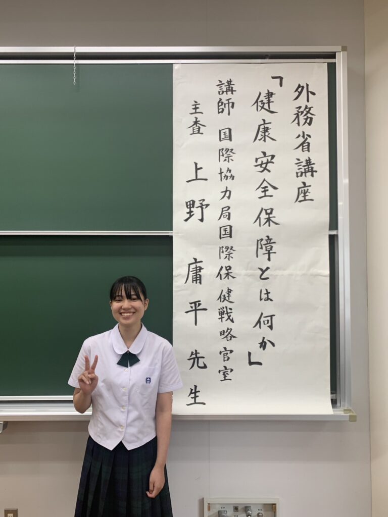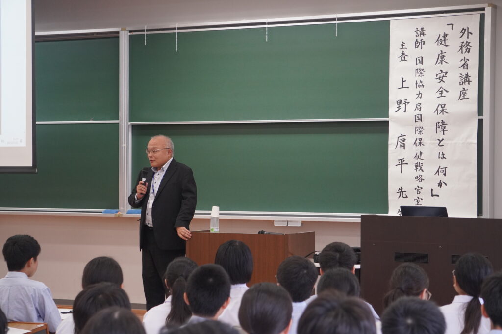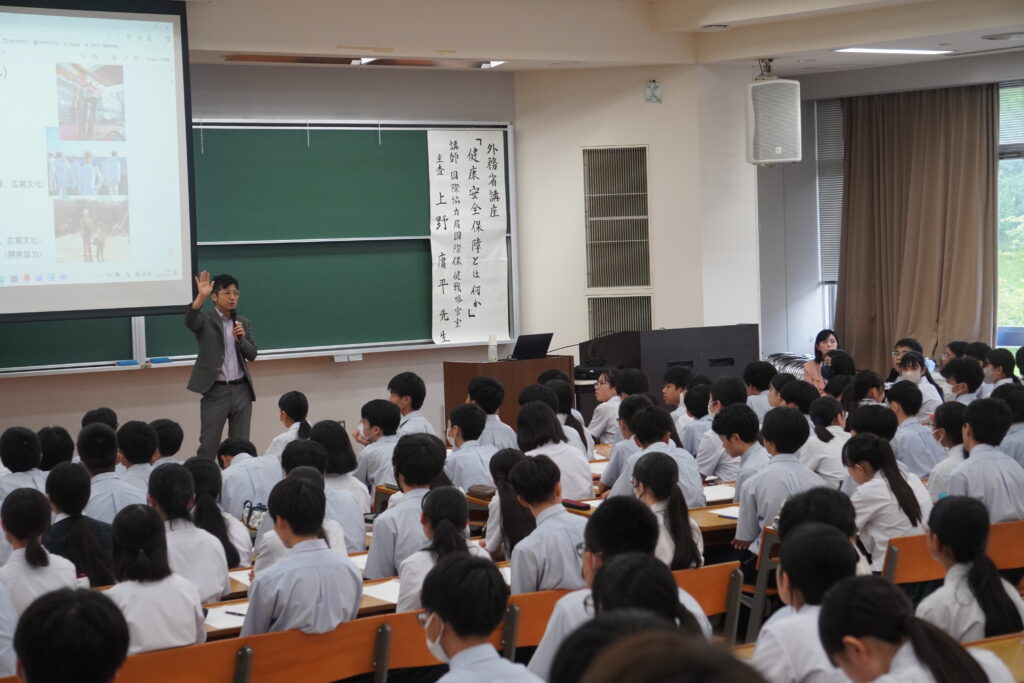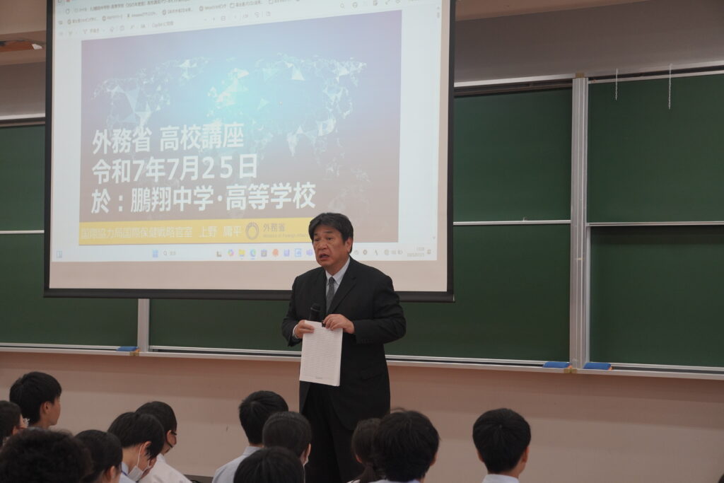 本日は、外務省 国際協力局 国際保健戦略官室 主査 上野庸平氏 をお招きし、宮崎産業経営大学5号館にて、鵬翔中学校全校生徒、並びに 中高一貫特進英数科1・2年生を対象に外務省講座を実施しました。上野先生には、「健康安全保障とは何か」というテーマについて、J1生にでも分かりやすく、実体験も交えながらスライドを用いて分かりやすく講演をしていただきました。