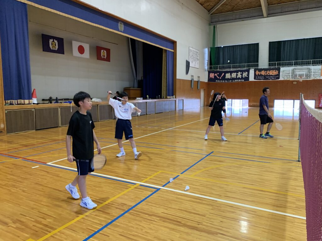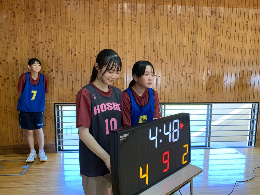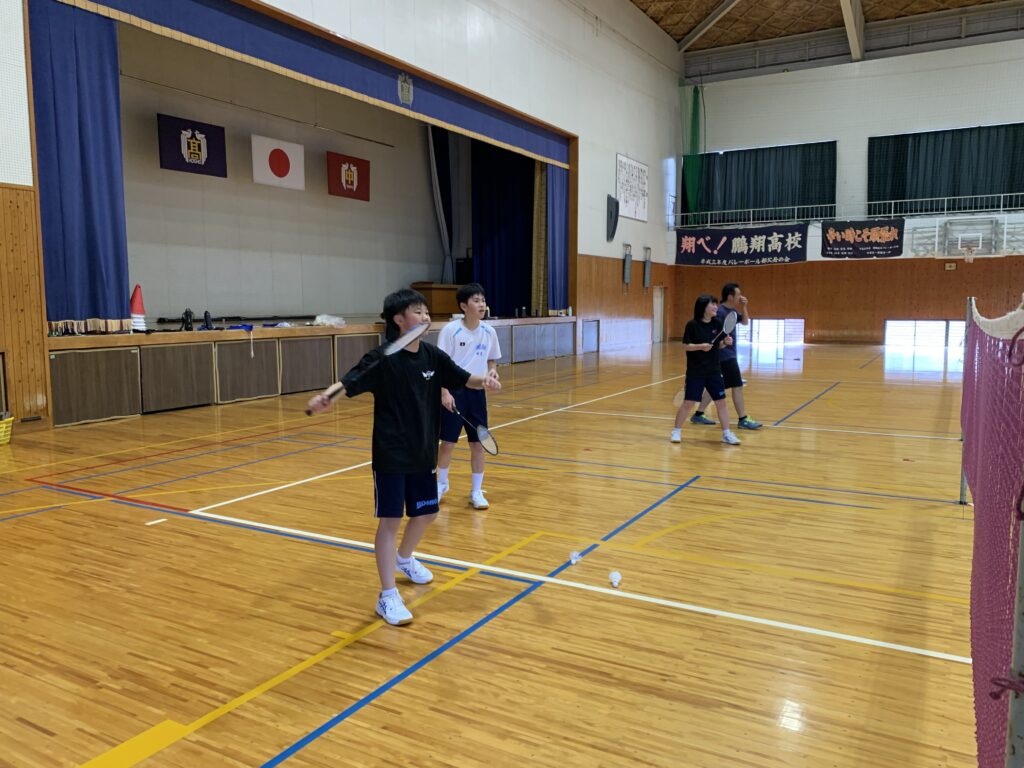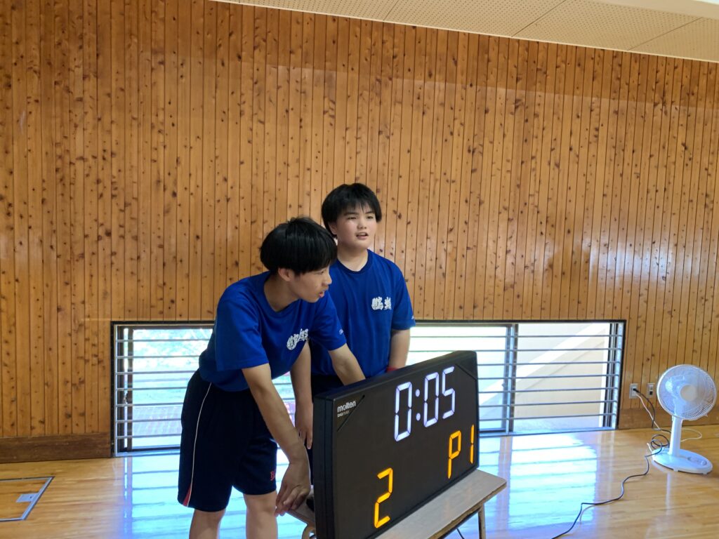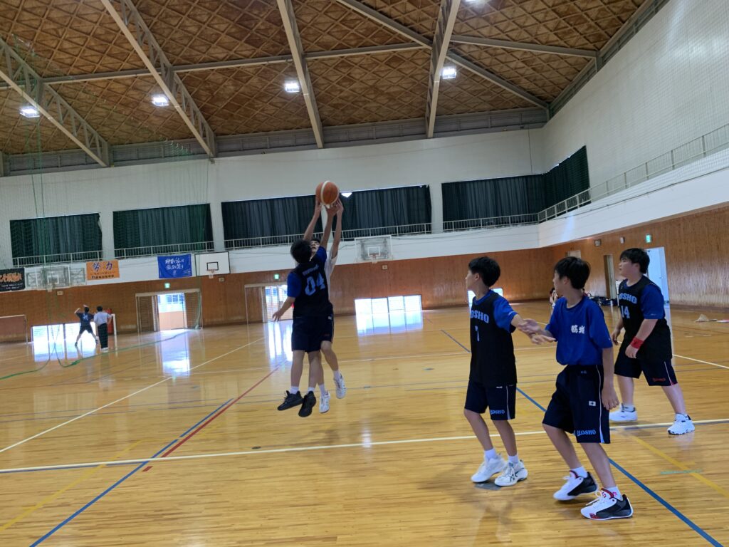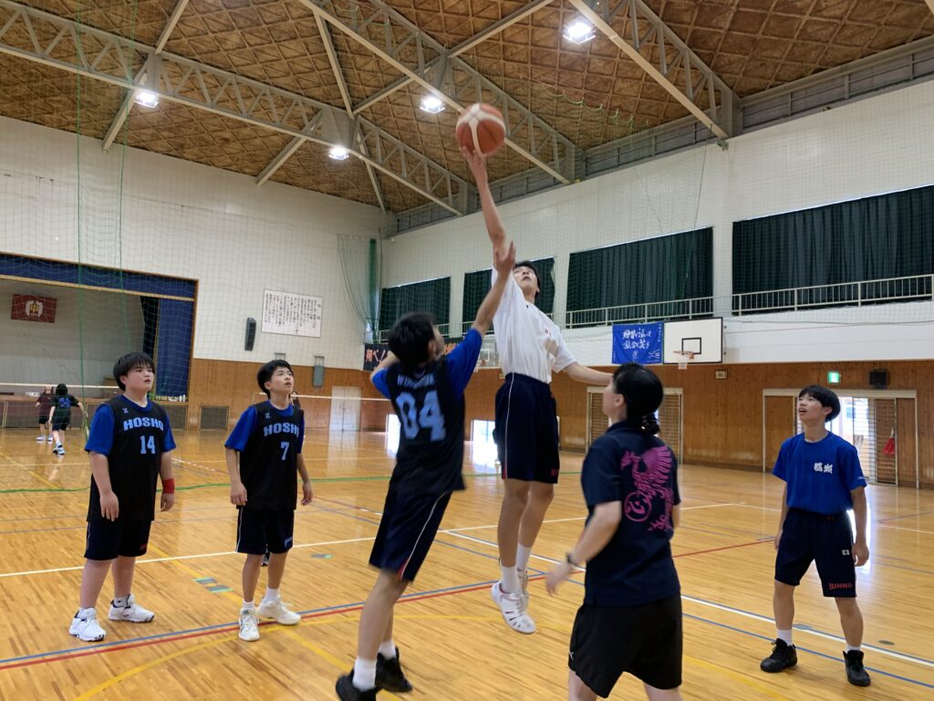 バドミントン部は、顧問の宮﨑先生より、基本ステップ(足の使い方)を教わっていました。バスケ部は、3日に予定している練習試合に向けて、ゲーム形式で実践練習をしていました。