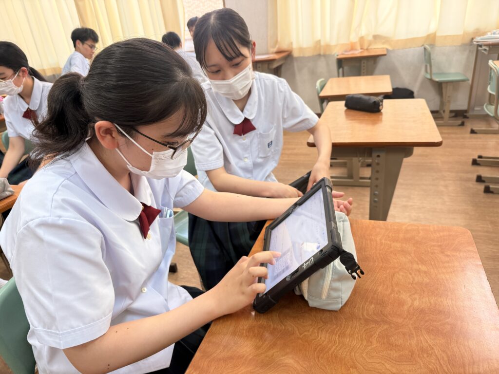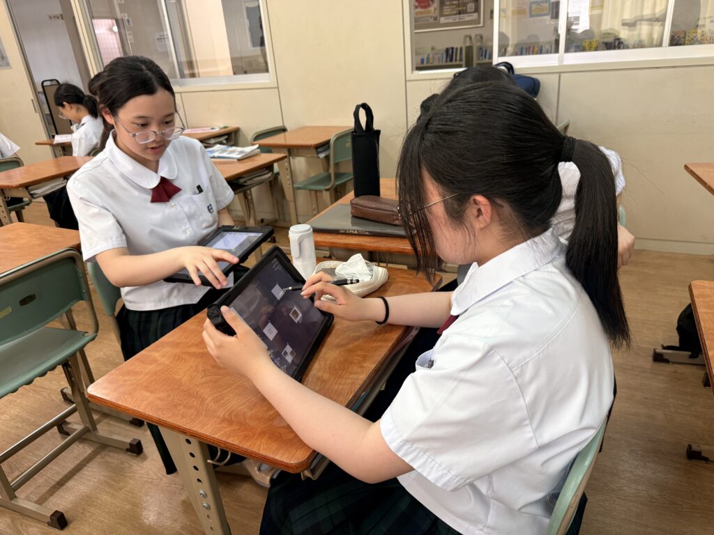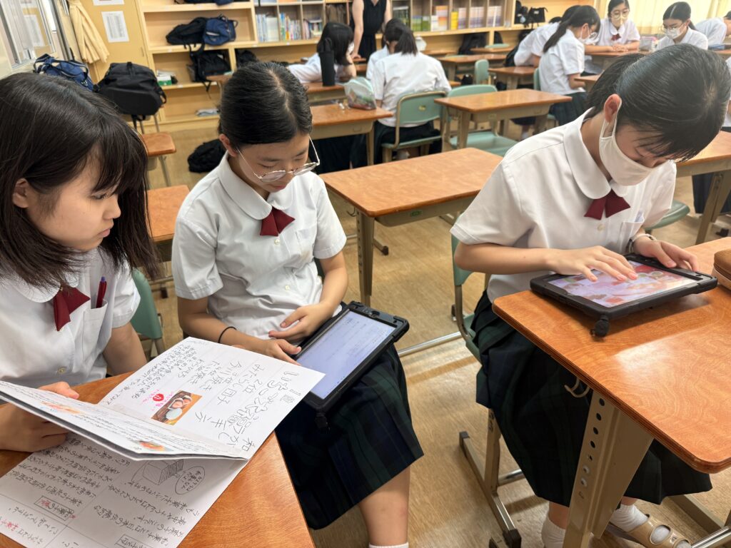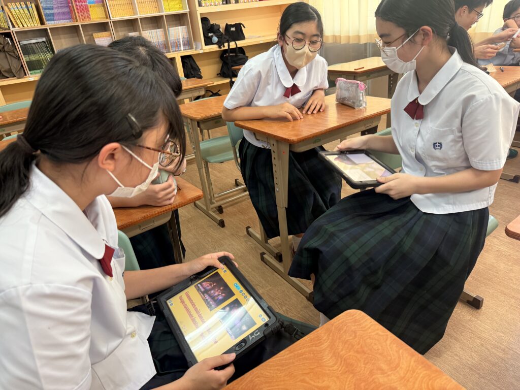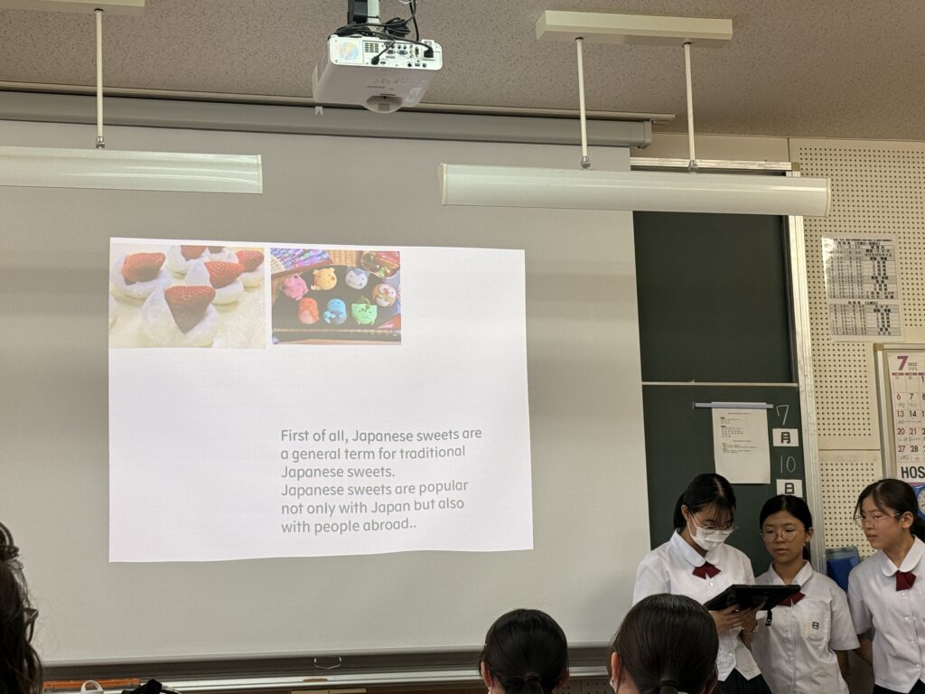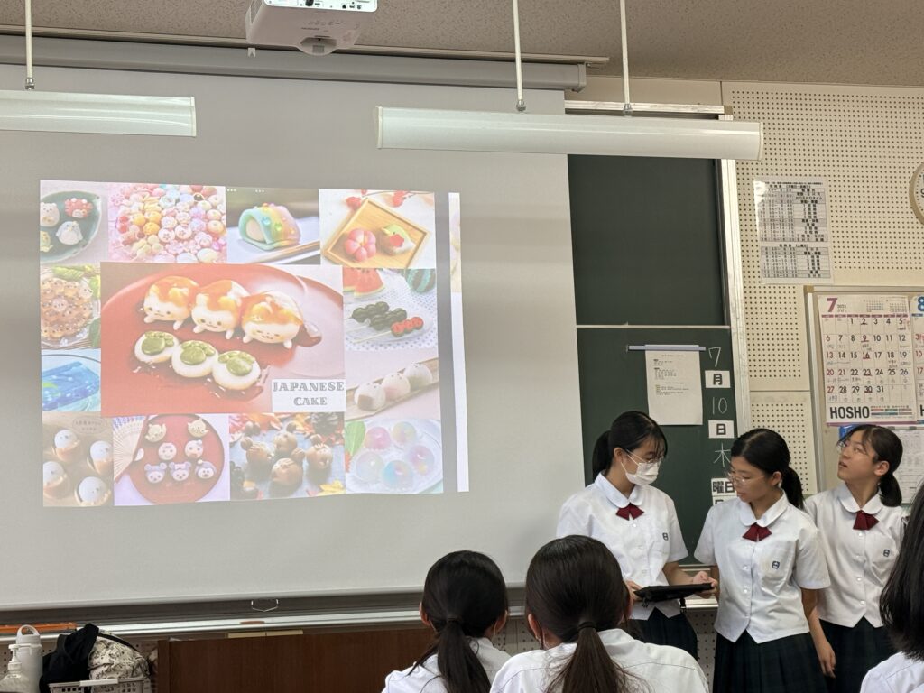 楽しく活動するのも一つですが、それだけではなくプレゼンテーションも行っています。日本の伝統文化などをテーマにグループに分かれ調べました。J1生からJ3生までがグループになるため、先輩たちから教わりながら英語学習を始めたばかりのJ1生も頑張っていました。