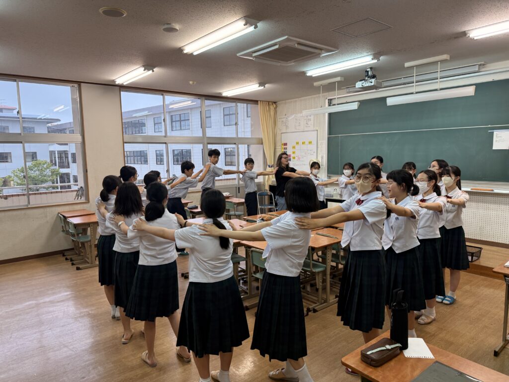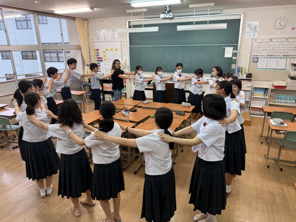 今日はESS部の活動をお伝えします。ESS部では楽しく英語に触れています。毎週、トンプソン先生、ジェニファー先生と一緒に楽しく活動をしています。常にみんなが笑顔で活動しています。これはみんなで円になって、前や後ろに動いていくゲームです。指示される英語によって何歩前や後ろに動くかが変わっているため、指示を上手く聞き取らなければいけません。みんなで笑い合いながら楽しく活動していました。