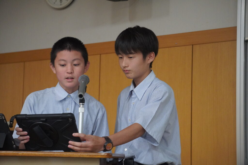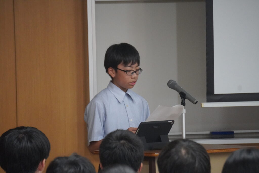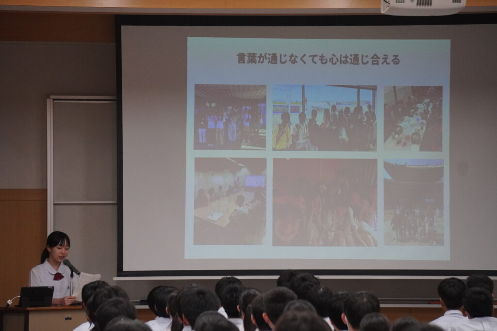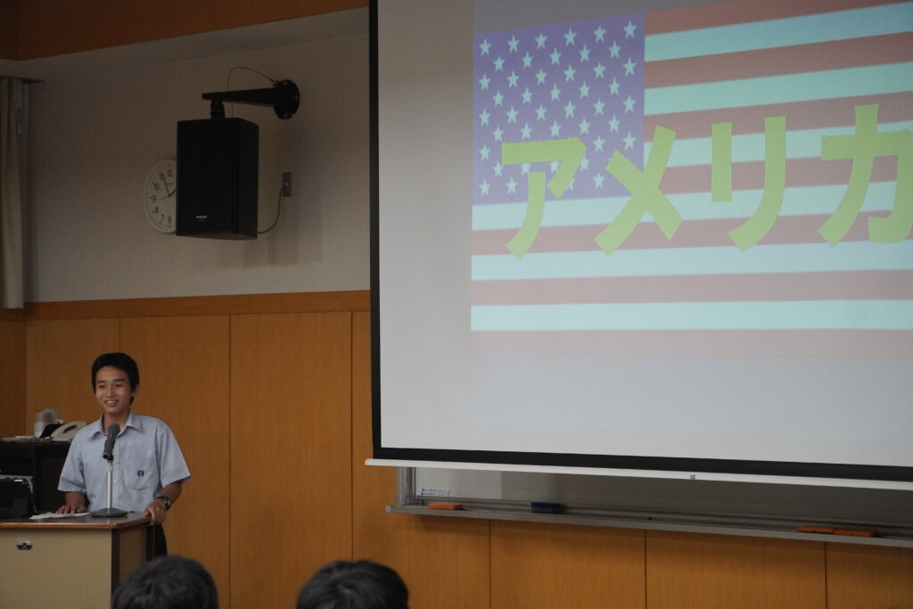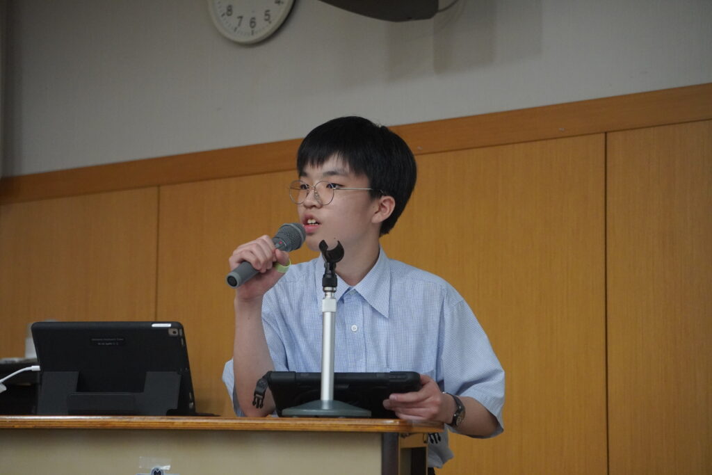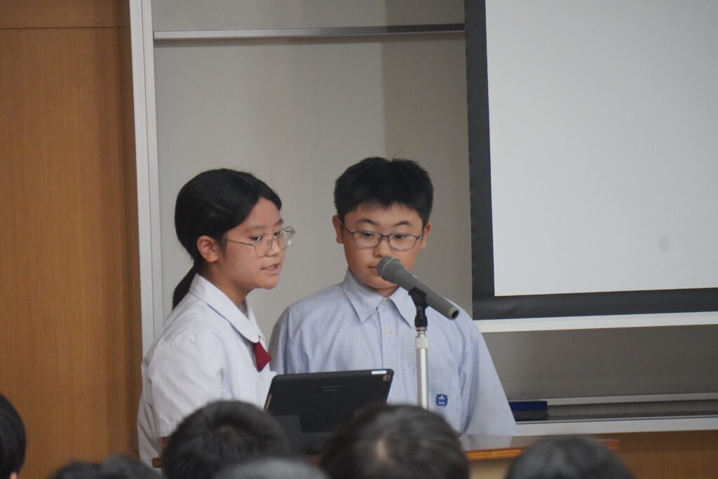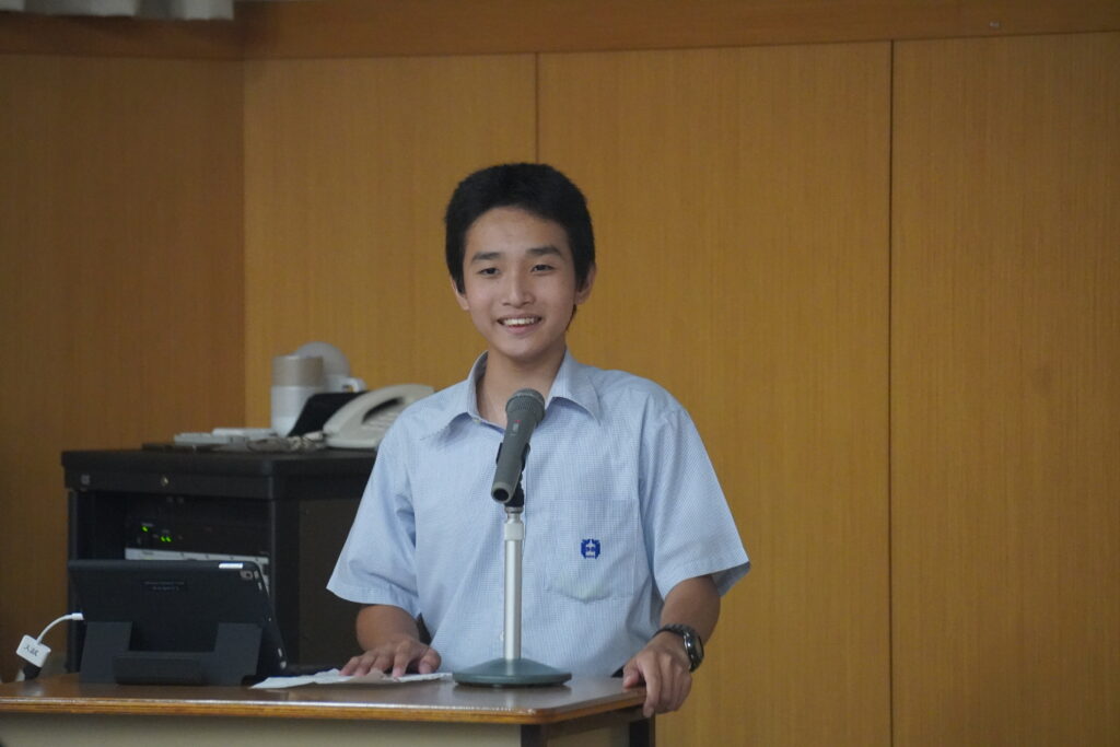 次に、個人発表部門でJ3Aの清水幸弥さんとJ3Bの山田心遥さんが夏休みに経験した留学について発表してくれました。海外での貴重な経験を興味を持って聞いていました。