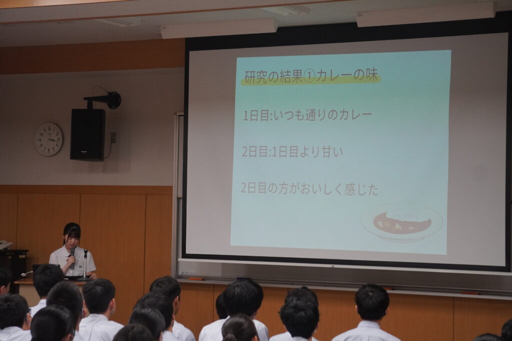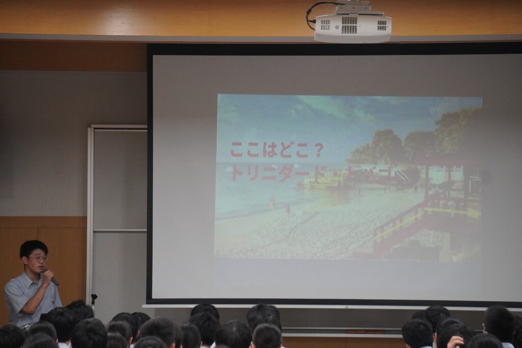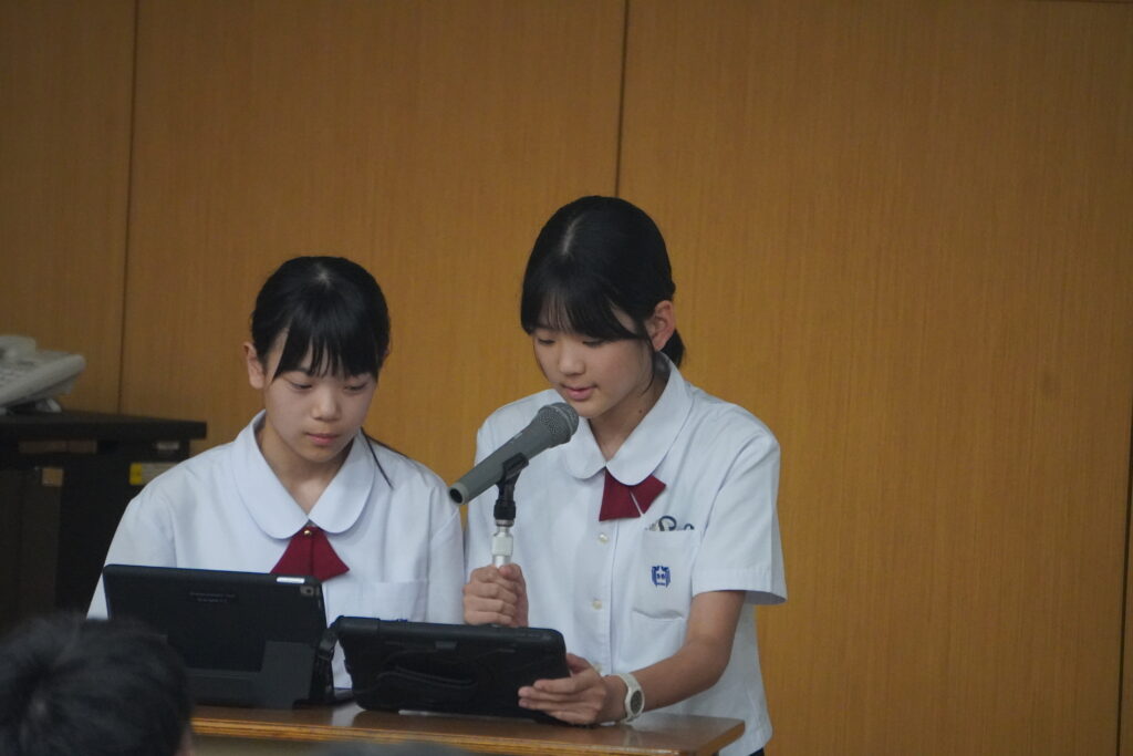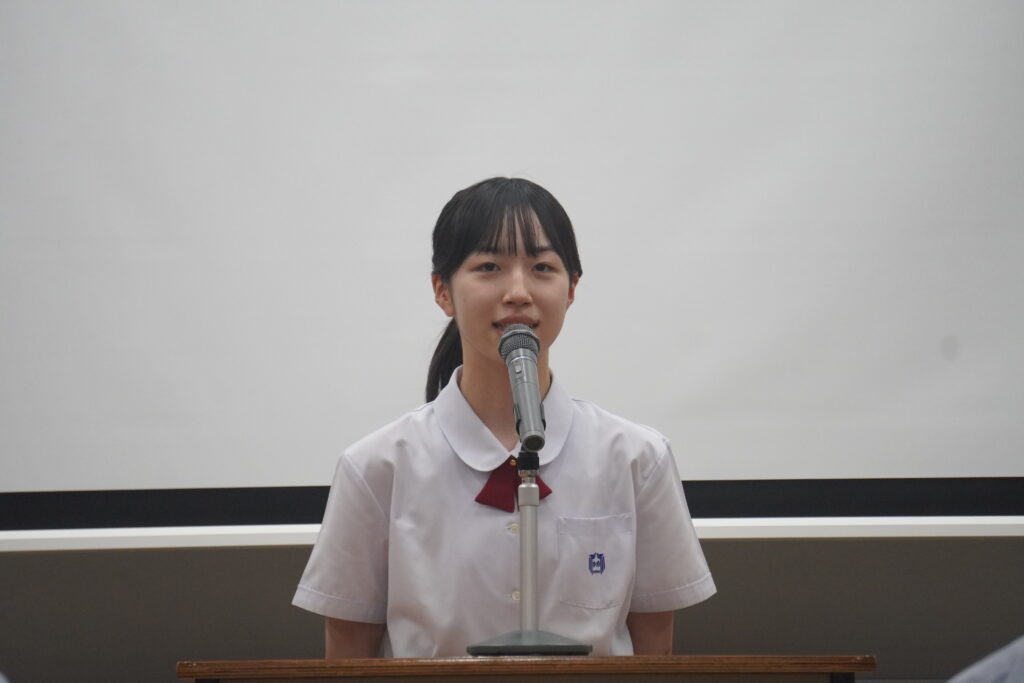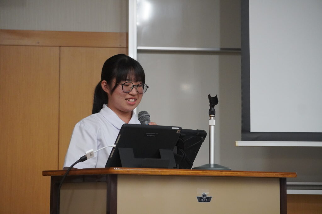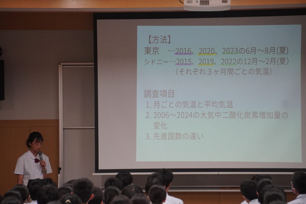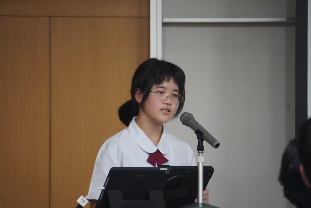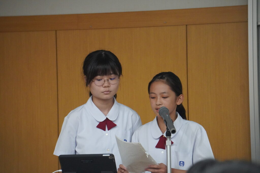 次に、個人発表部門でJ3Aの清水幸弥さんとJ3Bの山田心遥さんが夏休みに経験した留学について発表してくれました。海外での貴重な経験を興味を持って聞いていました。