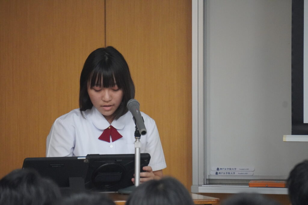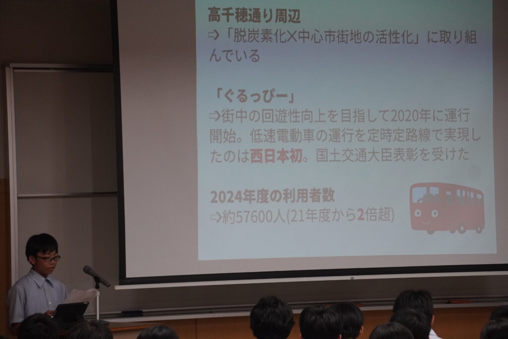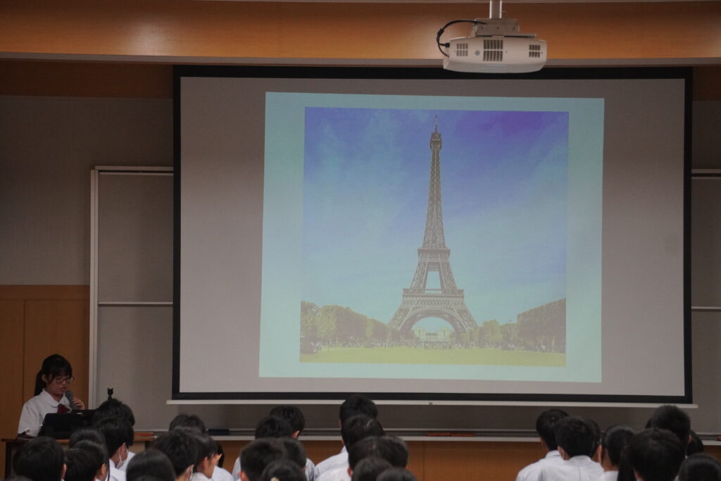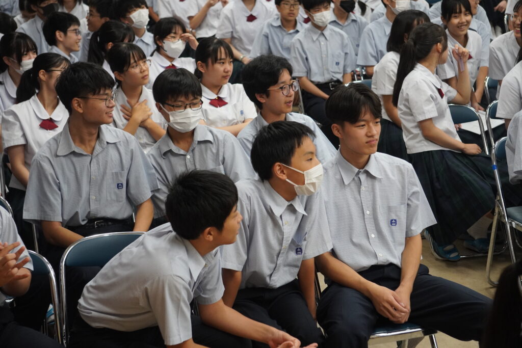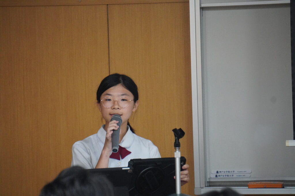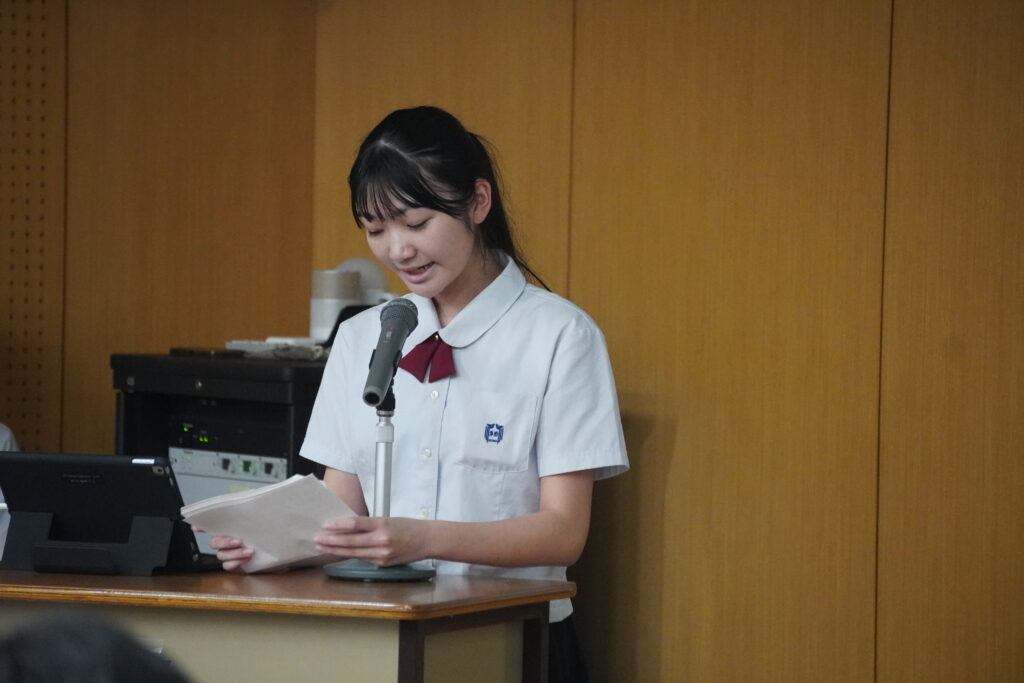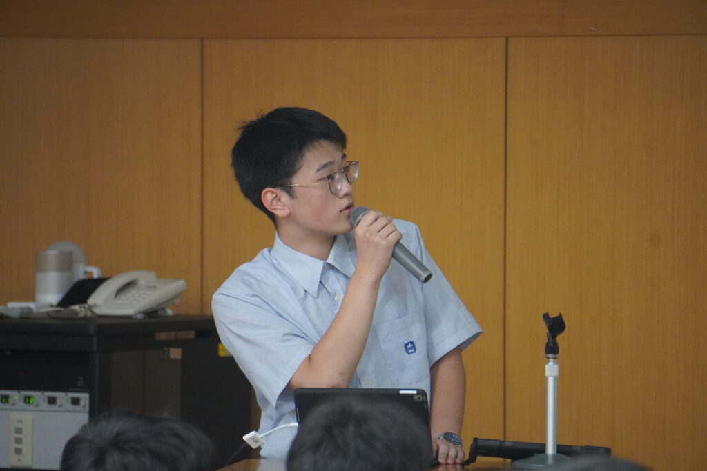 次に、個人発表部門でJ3Aの清水幸弥さんとJ3Bの山田心遥さんが夏休みに経験した留学について発表してくれました。海外での貴重な経験を興味を持って聞いていました。