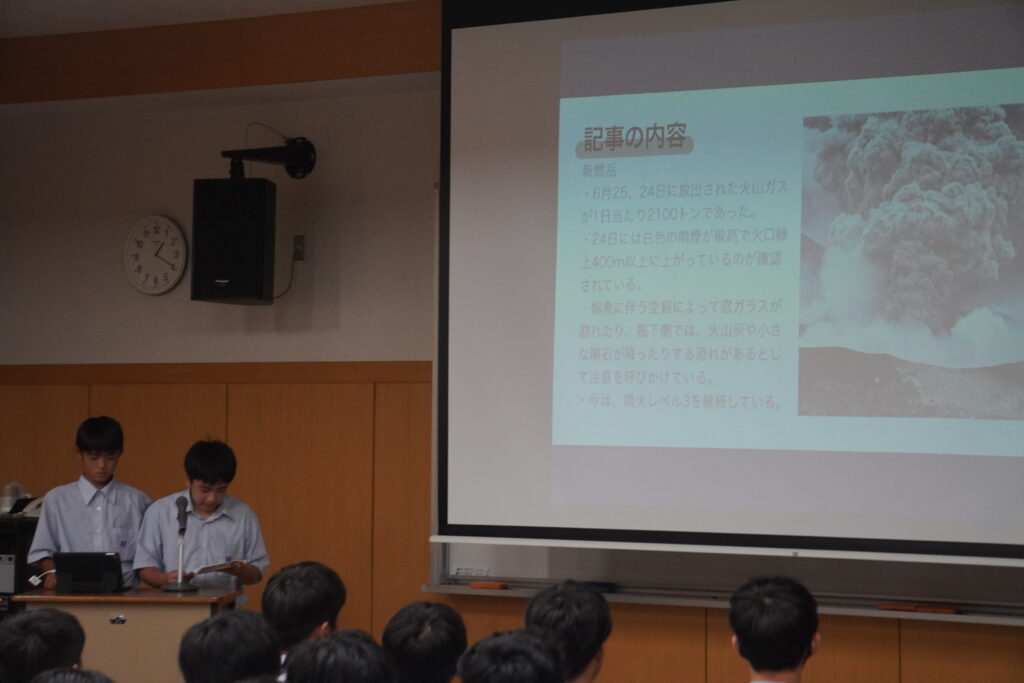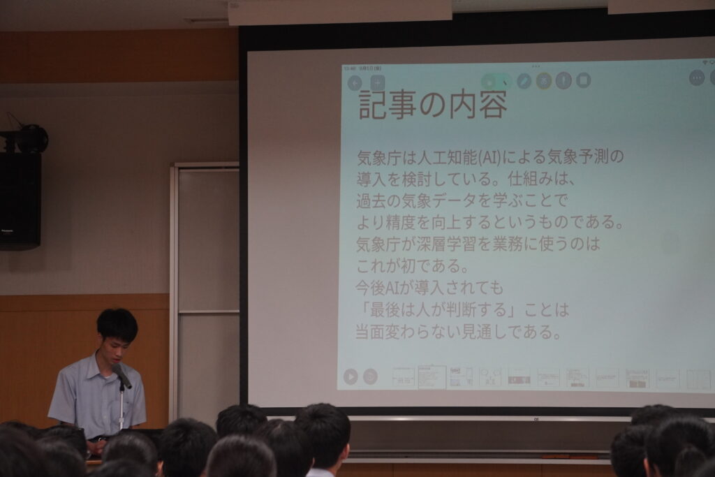 「NIE活動報告」では、5月から8月の3ヶ月間、各クラスにてNIE活動を実施してきた取り組みの中から発表をしてくれました。
