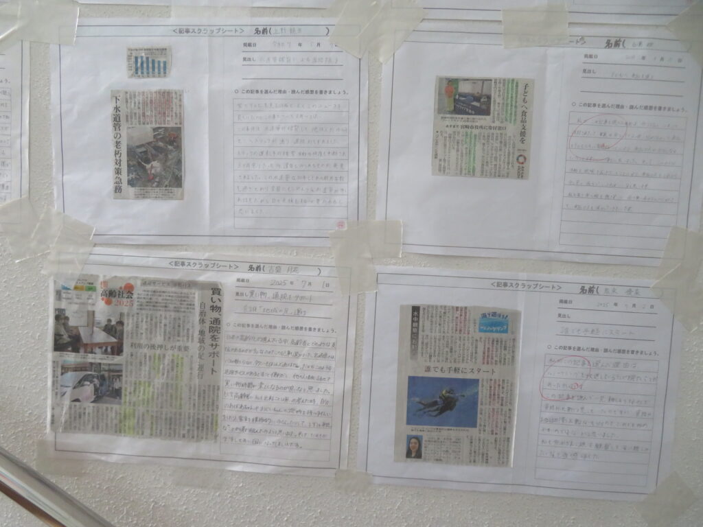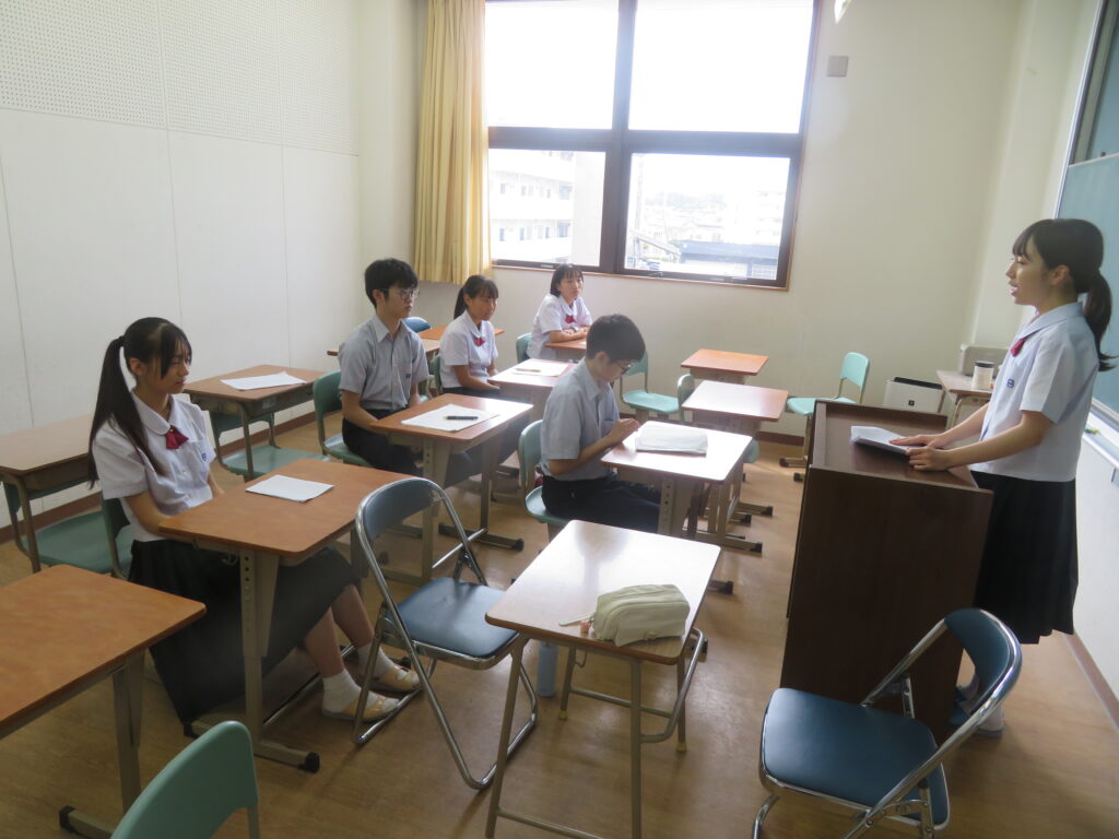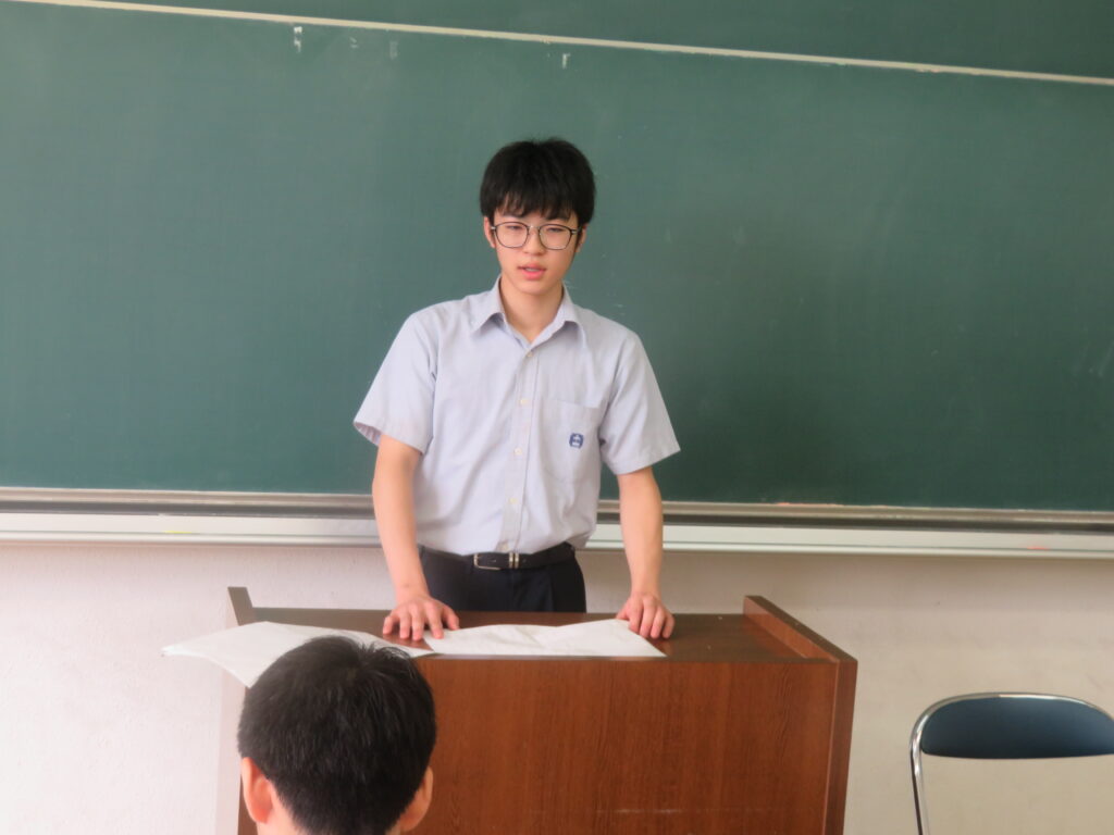 台風のために文化発表会ステージ発表の部(オルブライトホール)が9/11(木)に延期となってしまいましたが、通常授業が再開した中で、クラス合唱を含めて発表する生徒は少しずつ準備や練習を進めています。今回は意見発表の練習の様子を少し紹介します。クラス代表は次の6名で、エコ活動、地域文化の継承、そして戦後80年への思いなど、それぞれの視点で捉えた話題と自分の意見をより生き生きと伝えるために懸命に練習しています。当日の発表に、乞うご期待。 1A 佐藤 なつ 1B 甲斐 心乃美 2A 黒木 ゆな 2B 田村 紘太朗 3A 東 蓮仁 3B 山田 心遙
