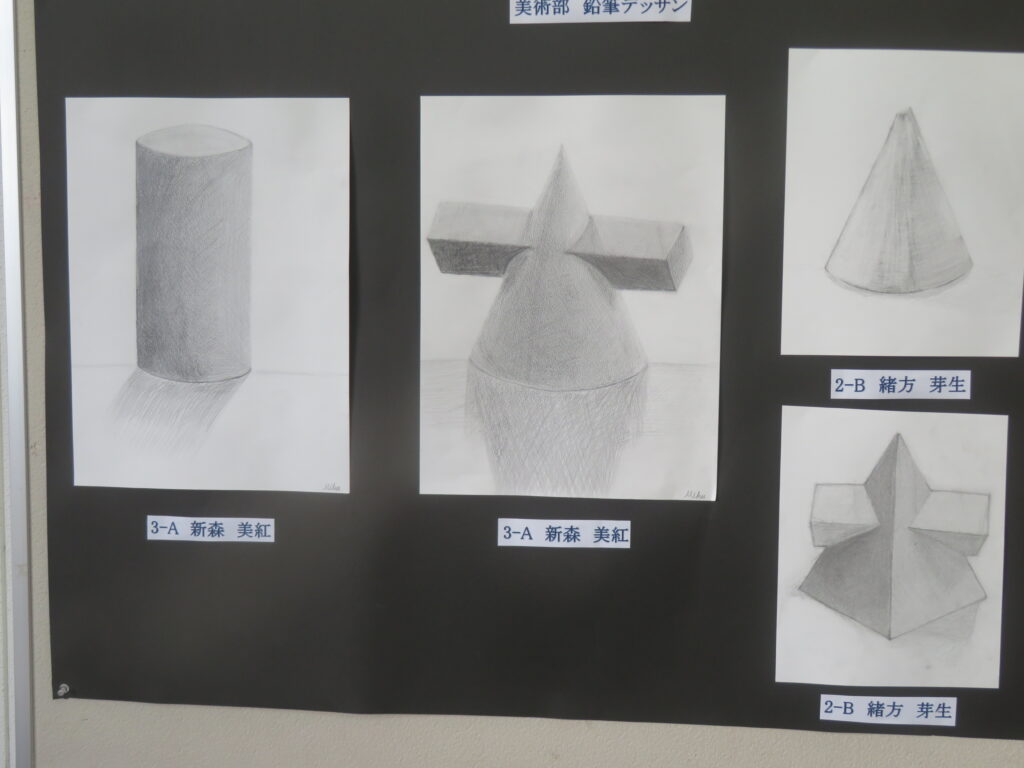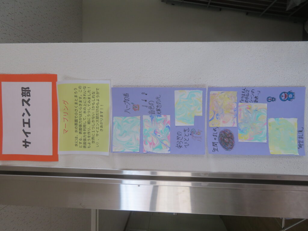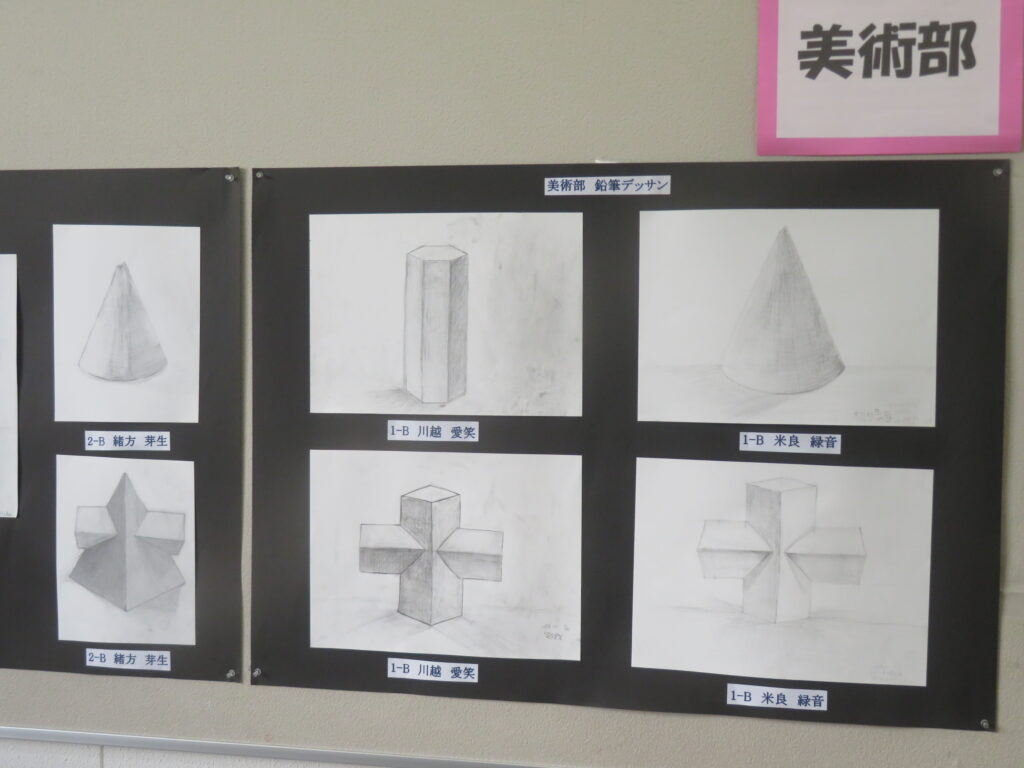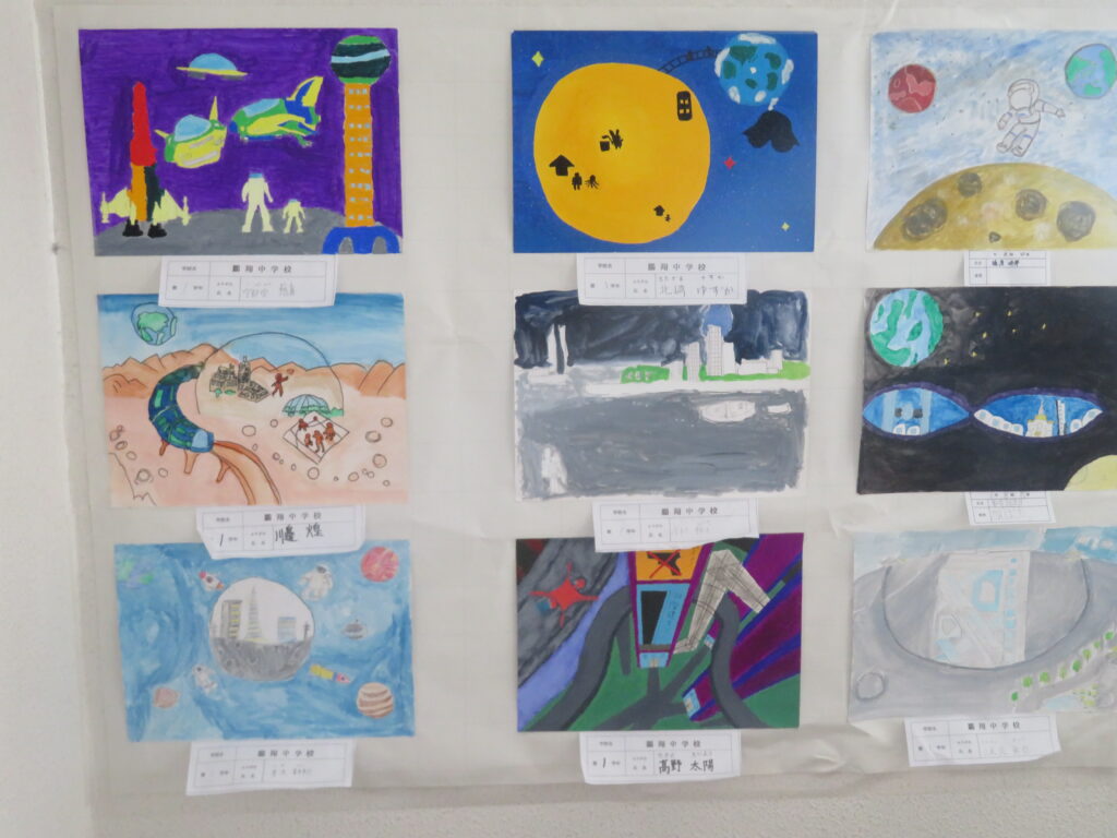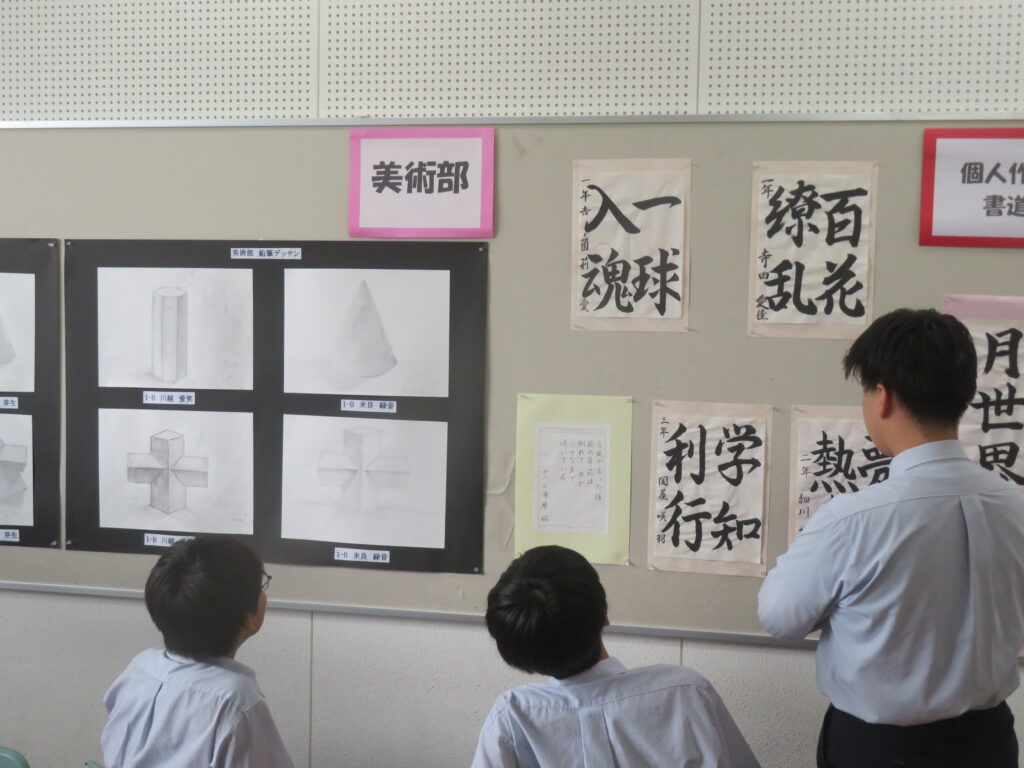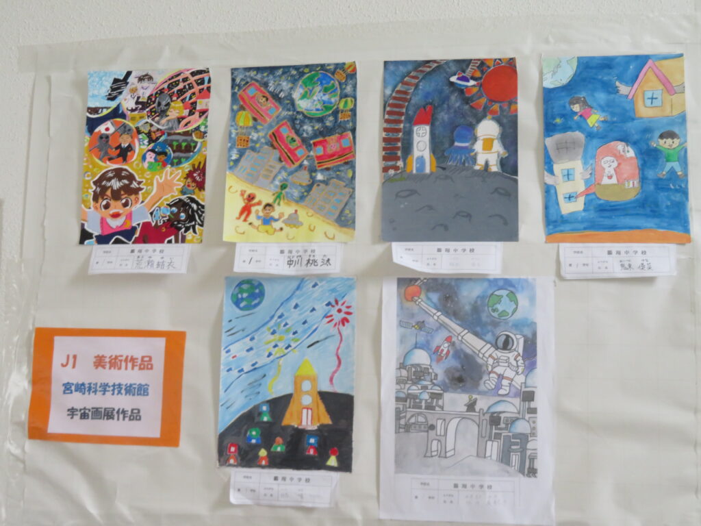 絵画(美術部によるデッサン、愛鳥週間や動物を扱ったポスター、家庭・少年・人権の日、宮崎科学技術館宇宙画展作品、サイエンス部「マーブリング」)、書道、そして調査研究発表(水辺調査)、NIE(新聞記事をもとにした気づきや感想)ですが、いずれもすばらしい作品となっています。文化発表会当日も多くの保護者、そして高校生や職員に観てもらいましたが、もうしばらくはこのまま掲示してありますので、より多くの方々に観ていただきたいと思います。