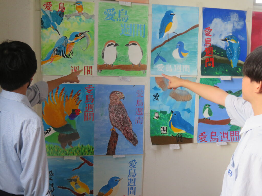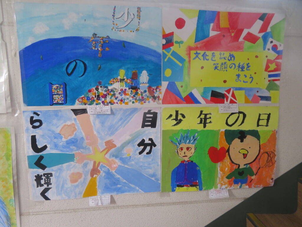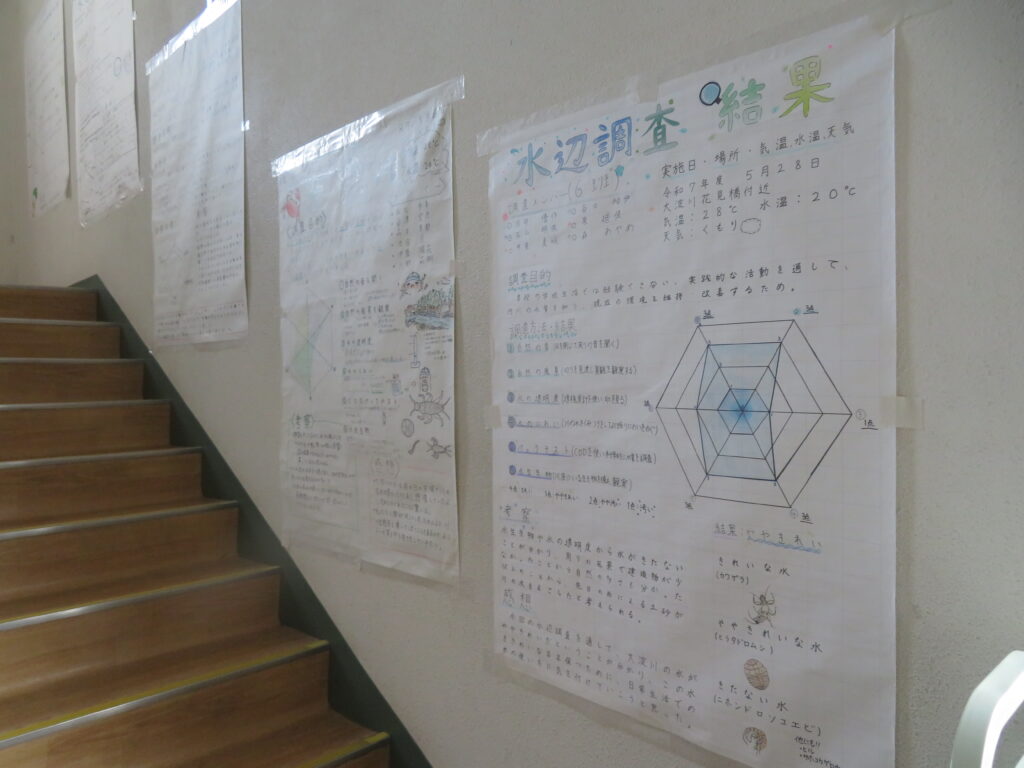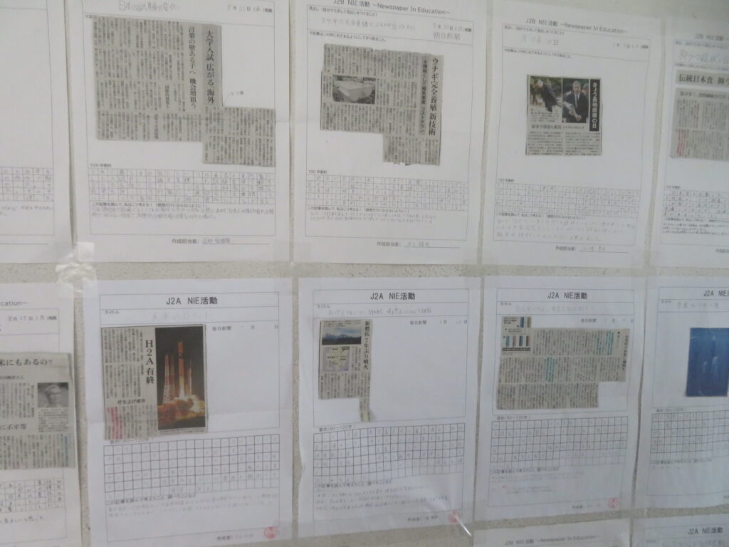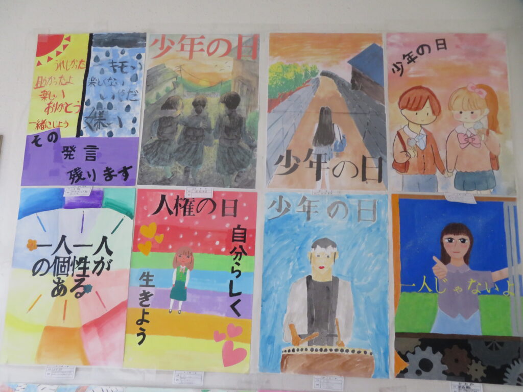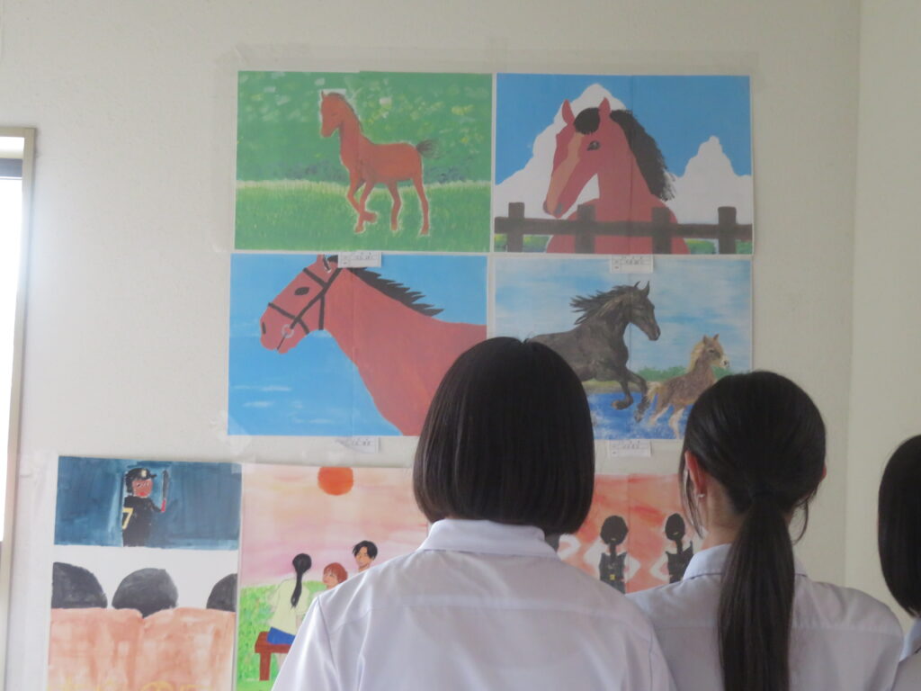 絵画(美術部によるデッサン、愛鳥週間や動物を扱ったポスター、家庭・少年・人権の日、宮崎科学技術館宇宙画展作品、サイエンス部「マーブリング」)、書道、そして調査研究発表(水辺調査)、NIE(新聞記事をもとにした気づきや感想)ですが、いずれもすばらしい作品となっています。文化発表会当日も多くの保護者、そして高校生や職員に観てもらいましたが、もうしばらくはこのまま掲示してありますので、より多くの方々に観ていただきたいと思います。