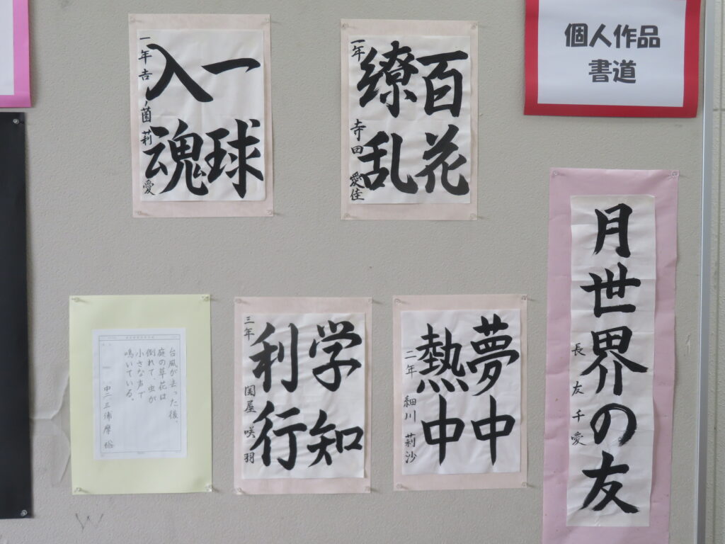 今日は日本の五節句のひとつである重陽で、菊を用いて無病息災や長寿を願う日でもあります。菊は秋の花ですが、連日の猛暑で、なかなかその気配が感じられません。秋といえば文化の秋に因んで、今日は「中学部棟ギャラリー Ⅱ」をお伝えしたいと思います。いずれも文化発表会(9/5 校内発表の部)で、廊下や階段に掲示されたものであり、先日のブログでも一部は紹介されましたが、せっかくの力作ぞろいですので、今日はもう少し詳しくお伝えします。