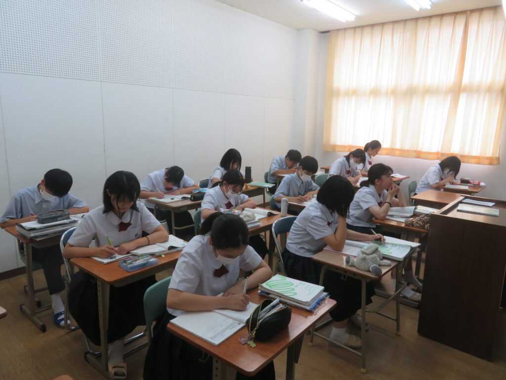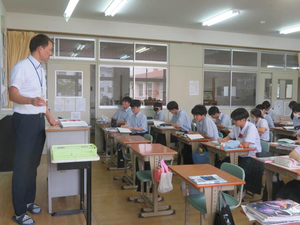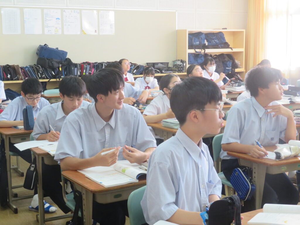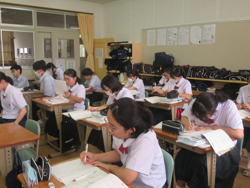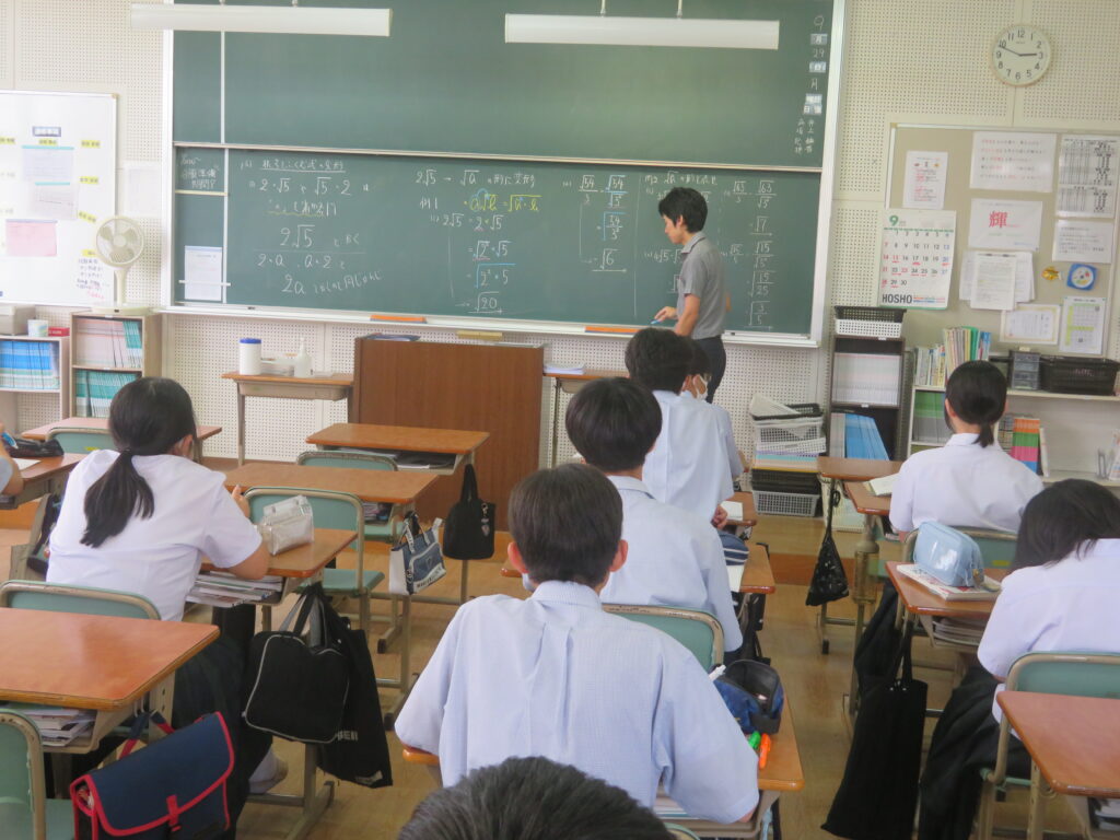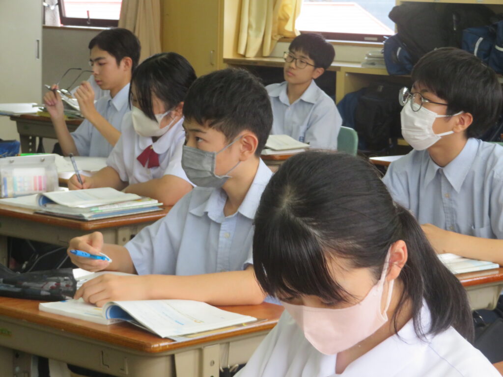 バドミントン部の生徒は、中体連に参加のため、本日は公欠でした。また、顧問の鳥原先生も大会に参加のため、授業の代行を永田先生がつとめていらっしゃいました。昼食後の授業は注意力散漫になりやすいのですが、生徒たちは各先生の説明を熱心に聞いていました。第3回定期考査まであと8日。教科のバランスも考えながら、残された時間を有効に使ってテスト対策を頑張ってほしいと思います。