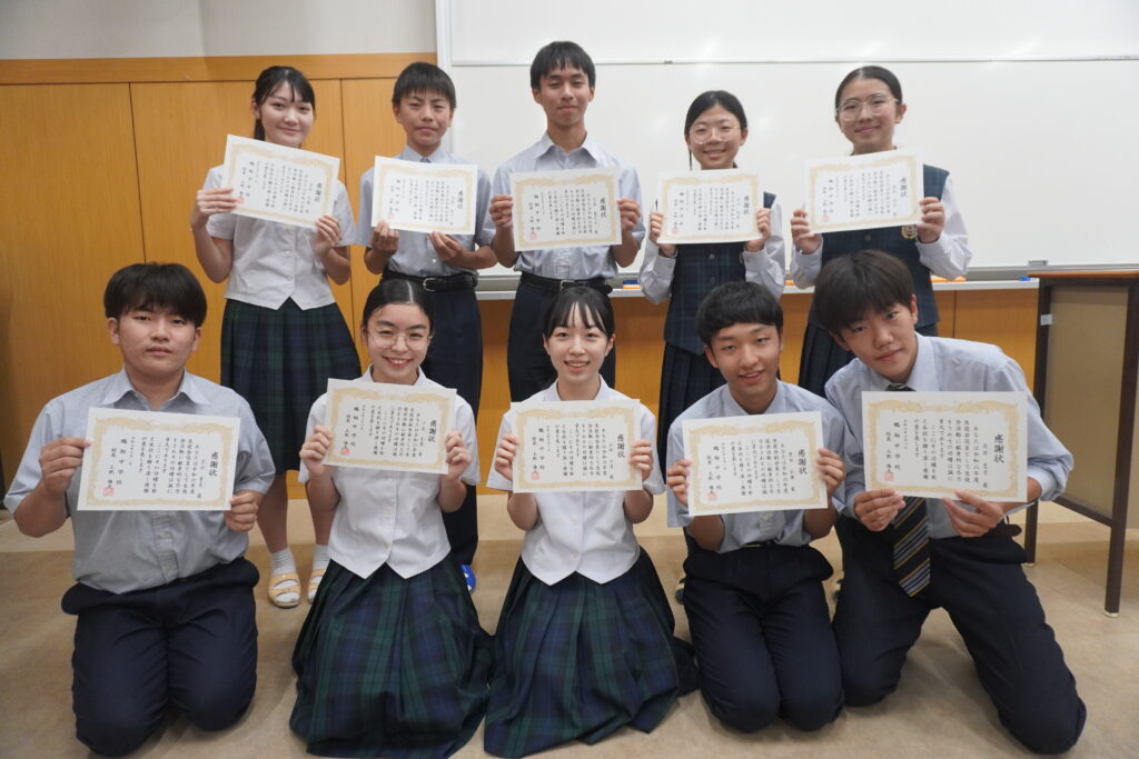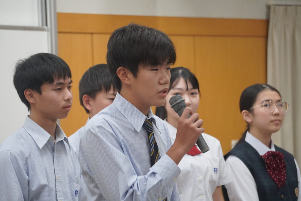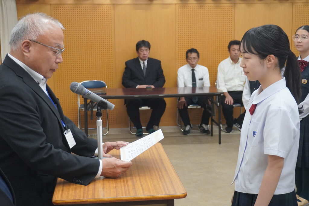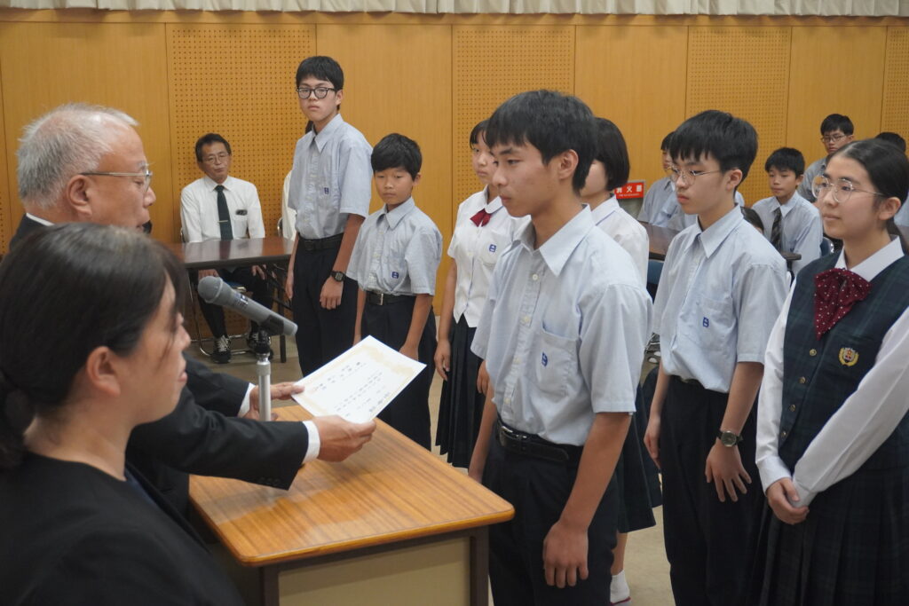 本日は,先日行われた生徒会選挙の結果を踏まえて,多目的ホールにて生徒会役員の新旧交代式が行われました。まず土肥校長より,旧生徒会への感謝の言葉とともに1人1人へ感謝状が贈られました。そのあと,旧生徒会それぞれの思いが詰まった挨拶がありました。