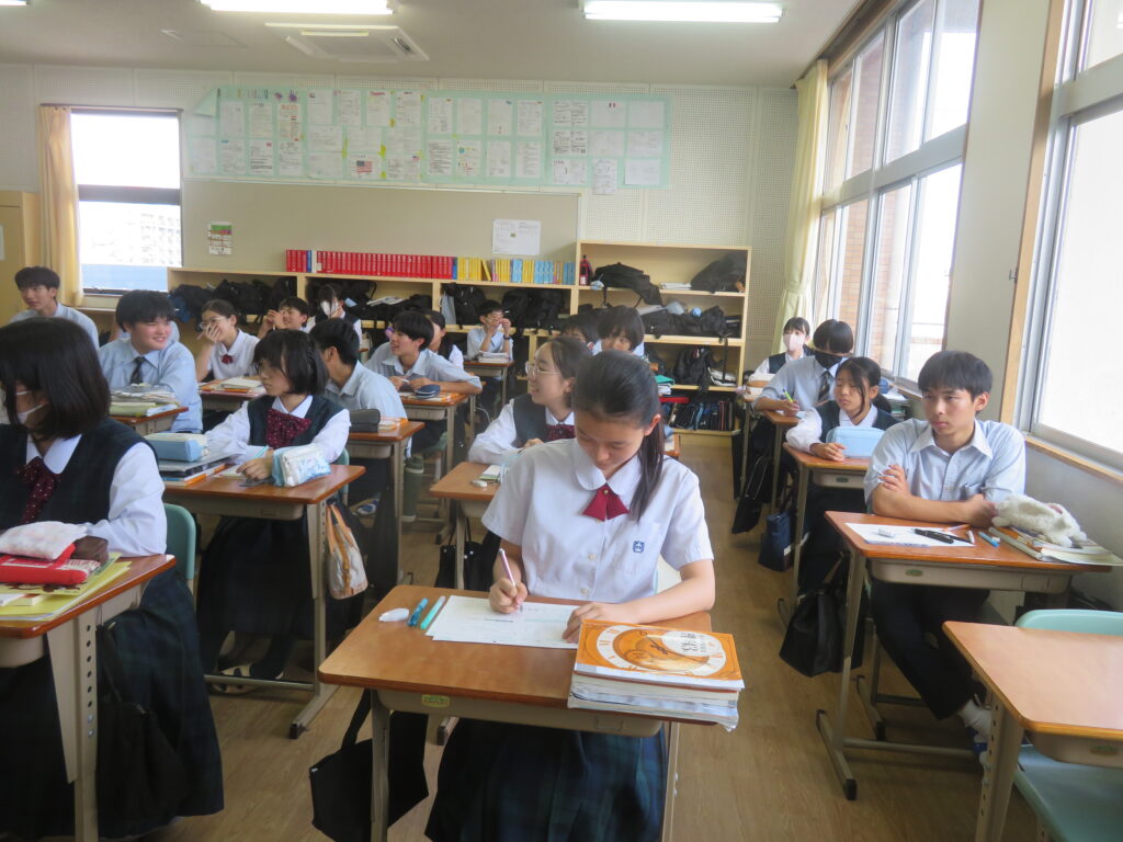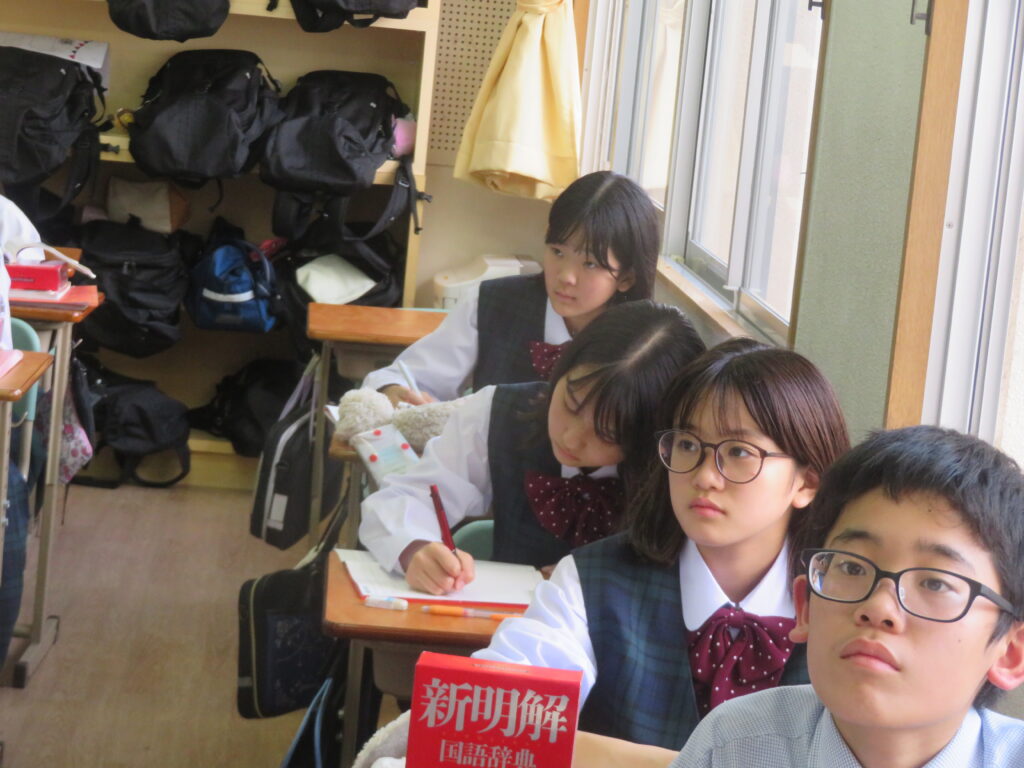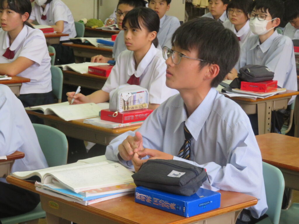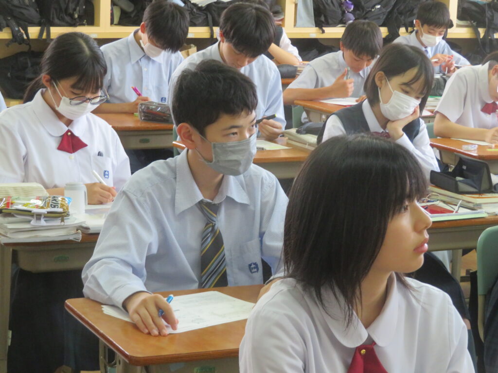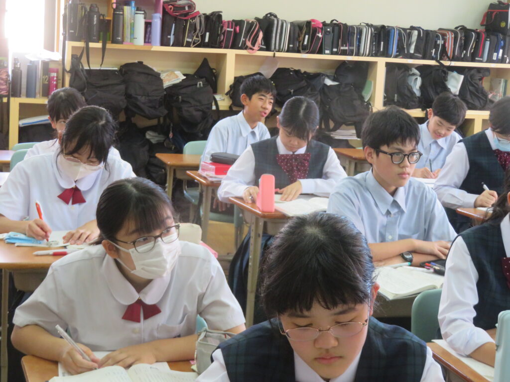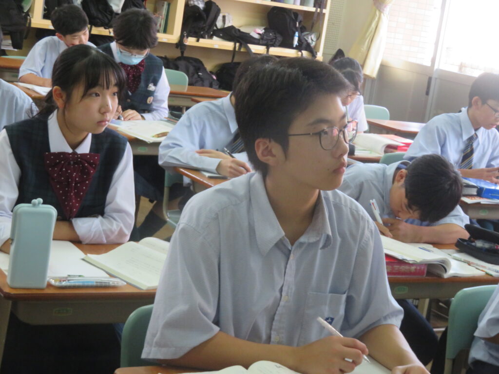 J1A教室およびJ1B教室では、中武先生、黒木先生がヘルマン・ヘッセ作『少年の日の思い出』を題材に、授業を展開なさっていました。先生方は、生徒一人ひとりが作品の世界に没入し、自由な感性を伸びやかに広げてゆけるよう、丁寧に導いておられました。生徒たちは、語りかけるような先生方のヒントに耳を傾けながら、物語に込められた心の機微に思いを巡らせていました。積極的に発表する生徒も見受けられ、とてもよい雰囲気のなかで授業が進められていました。