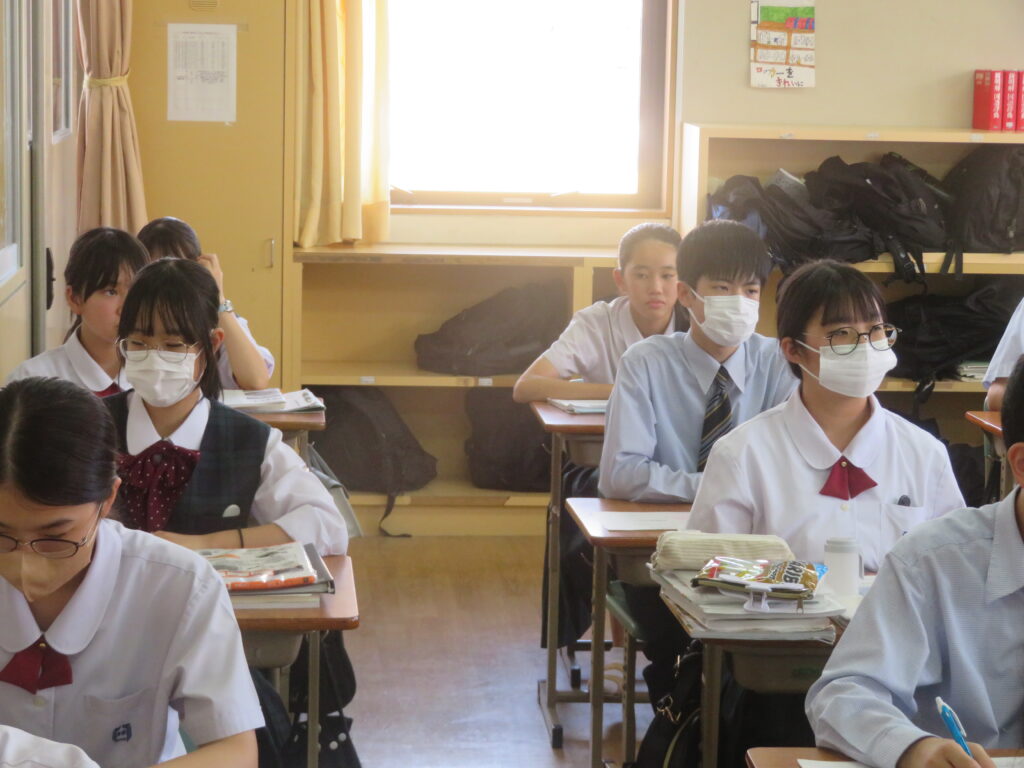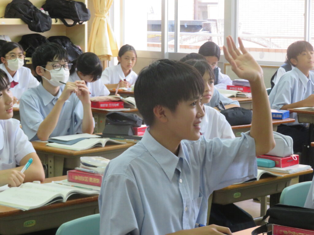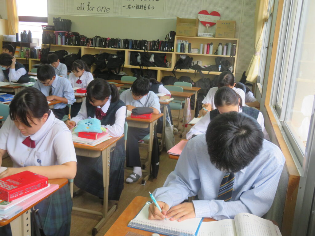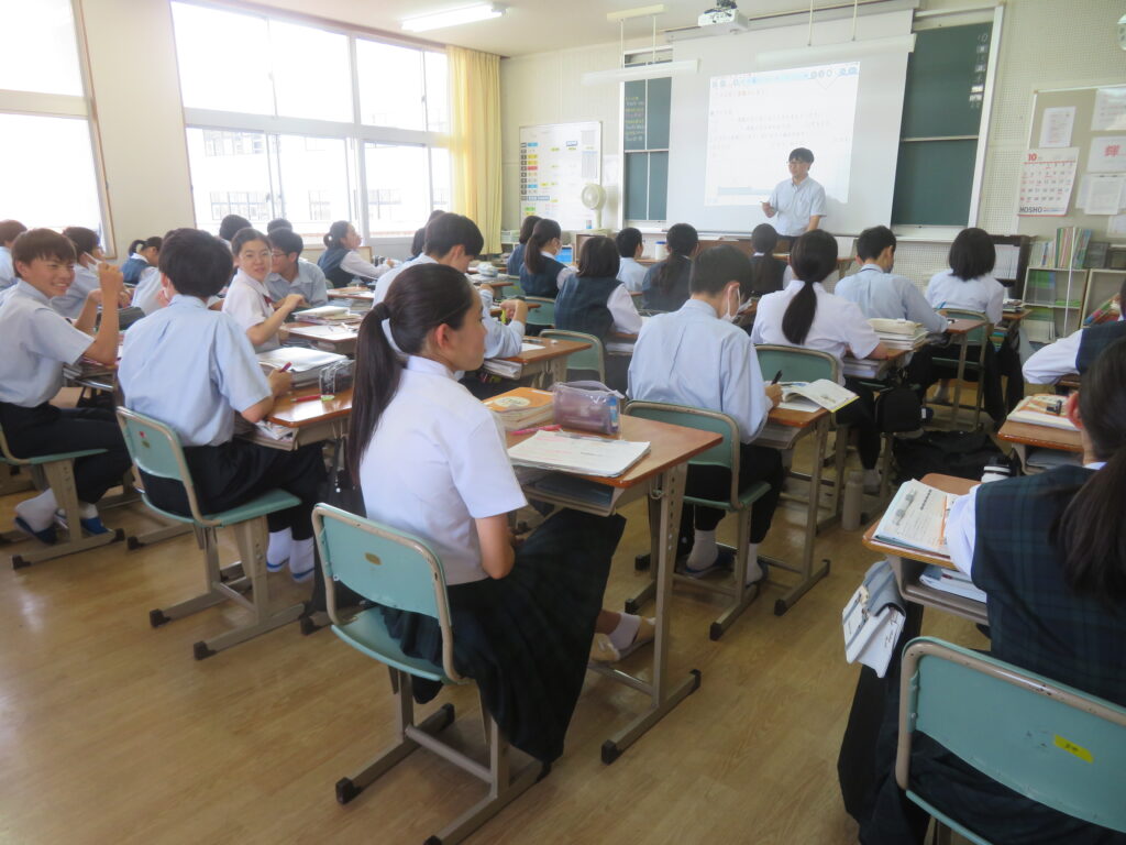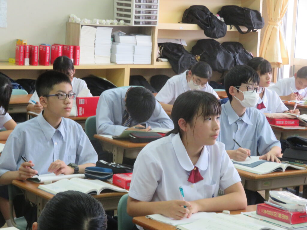 J1A教室およびJ1B教室では、中武先生、黒木先生がヘルマン・ヘッセ作『少年の日の思い出』を題材に、授業を展開なさっていました。先生方は、生徒一人ひとりが作品の世界に没入し、自由な感性を伸びやかに広げてゆけるよう、丁寧に導いておられました。生徒たちは、語りかけるような先生方のヒントに耳を傾けながら、物語に込められた心の機微に思いを巡らせていました。積極的に発表する生徒も見受けられ、とてもよい雰囲気のなかで授業が進められていました。