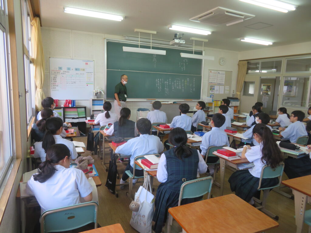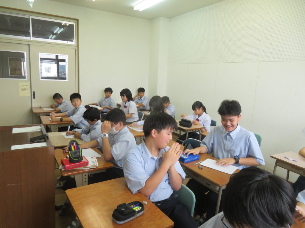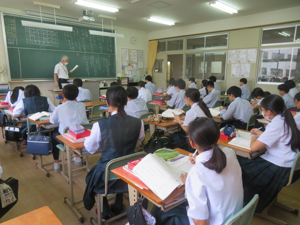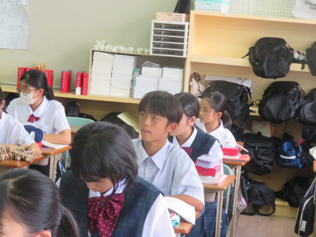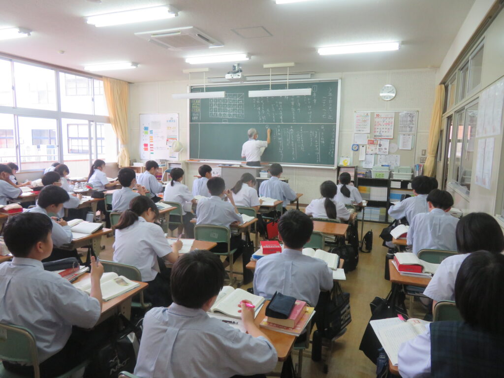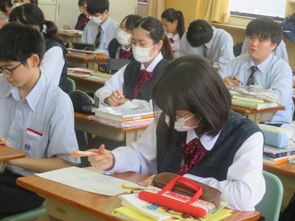 J1A教室およびJ1B教室では、中武先生、黒木先生がヘルマン・ヘッセ作『少年の日の思い出』を題材に、授業を展開なさっていました。先生方は、生徒一人ひとりが作品の世界に没入し、自由な感性を伸びやかに広げてゆけるよう、丁寧に導いておられました。生徒たちは、語りかけるような先生方のヒントに耳を傾けながら、物語に込められた心の機微に思いを巡らせていました。積極的に発表する生徒も見受けられ、とてもよい雰囲気のなかで授業が進められていました。